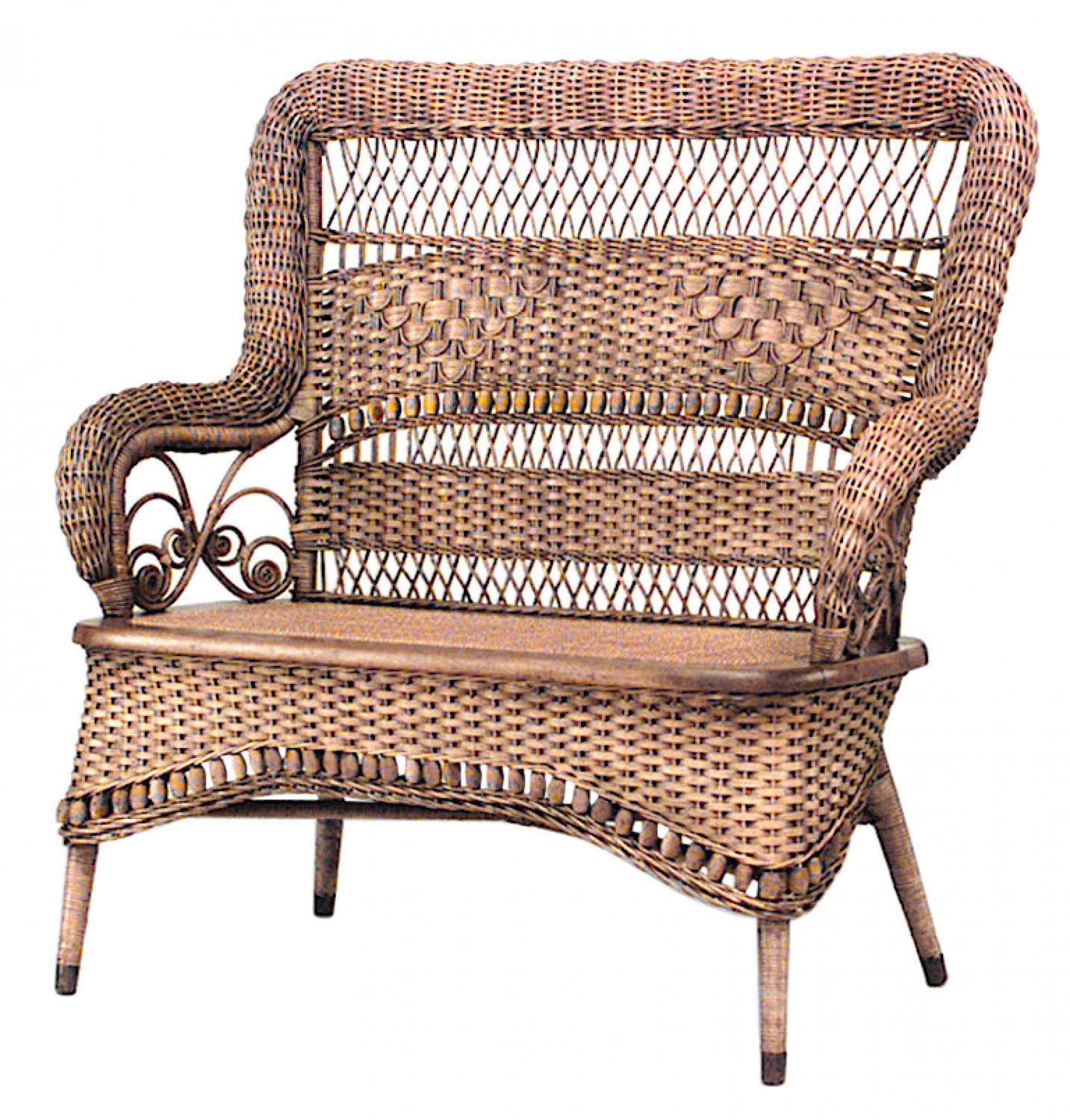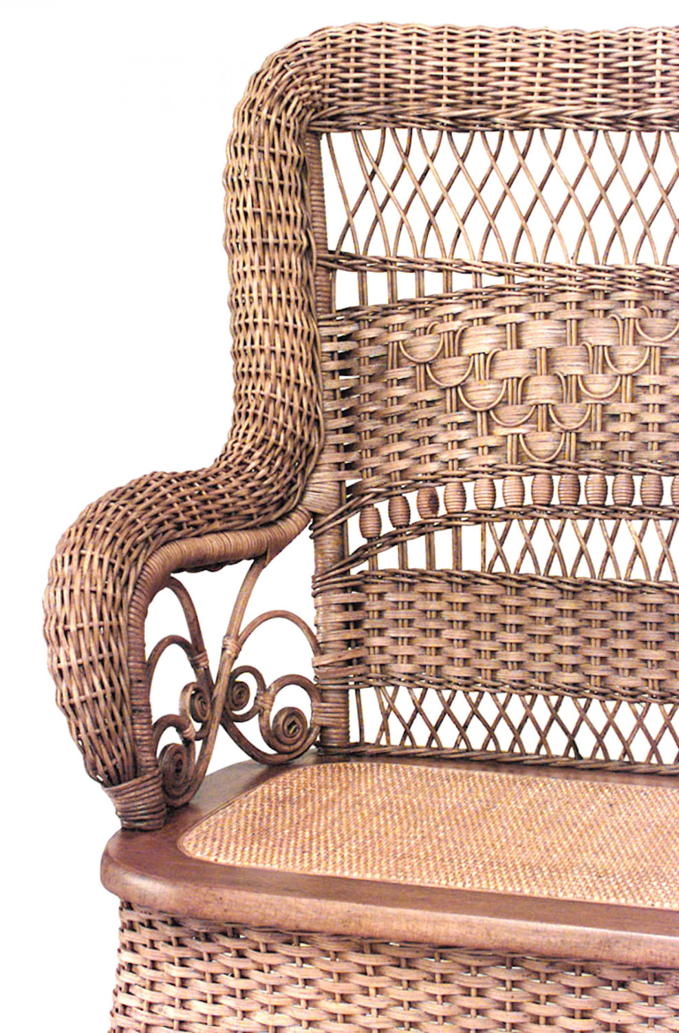 American Victorian natural wicker woven roll design high back loveseat with spindles and bobbins on back and apron. (LARKIN & CO. label).