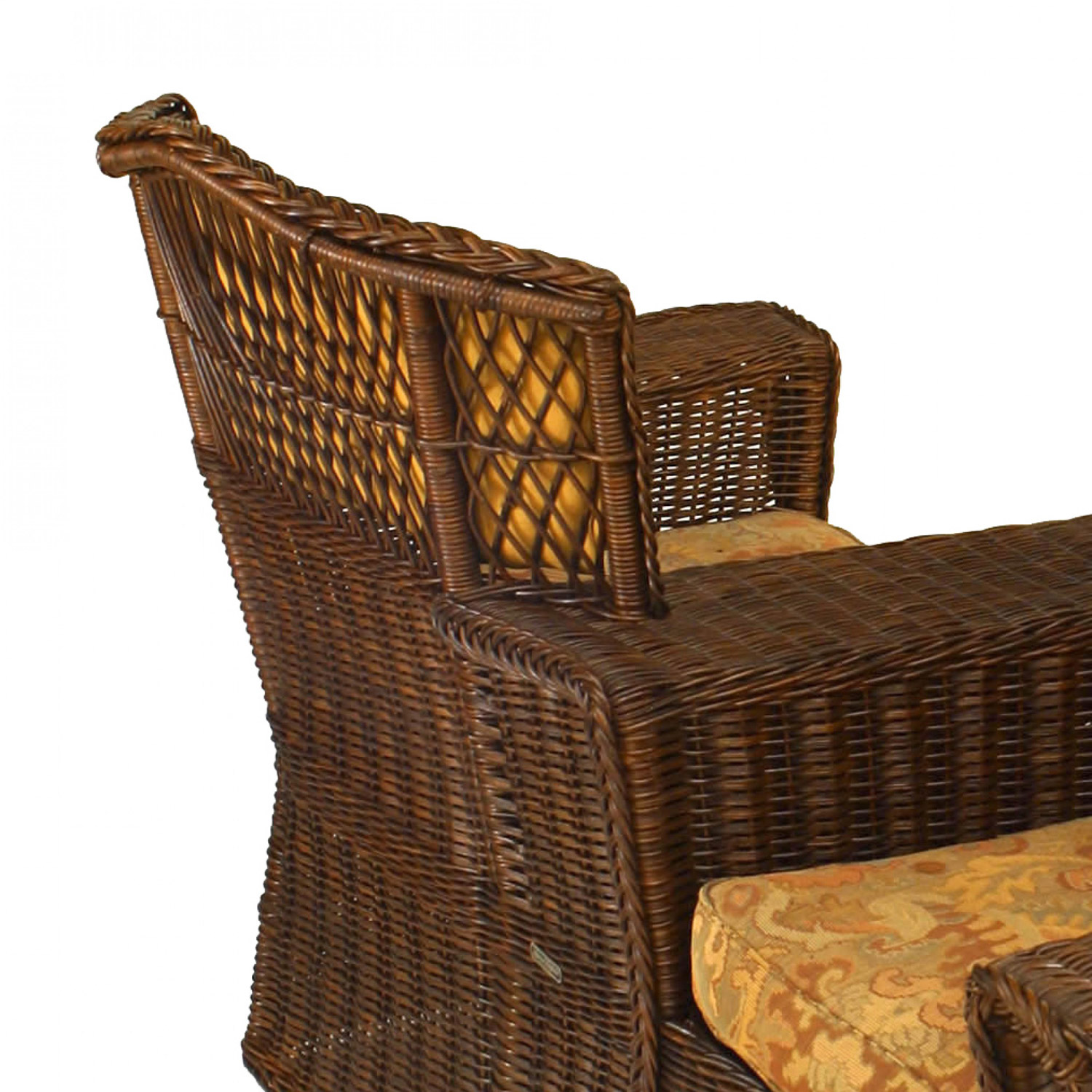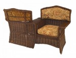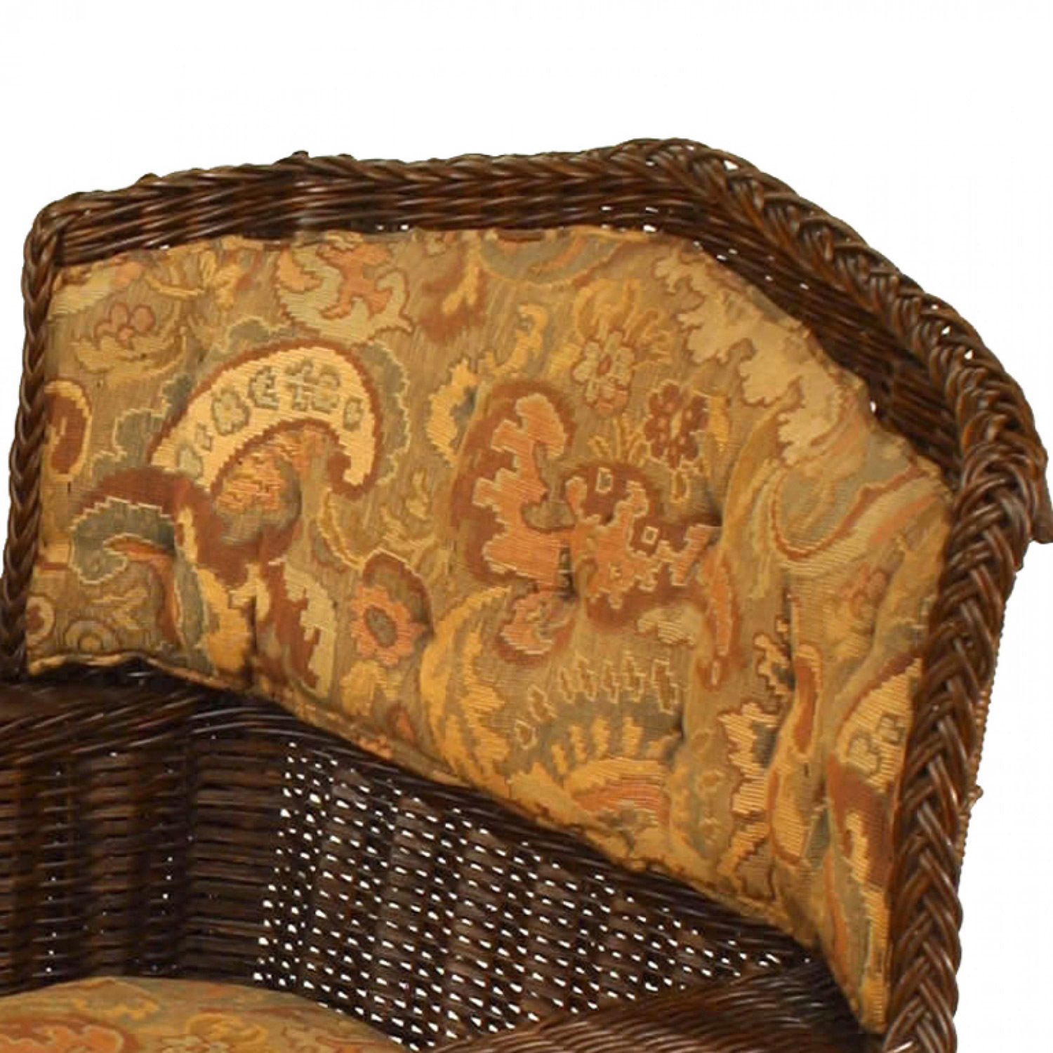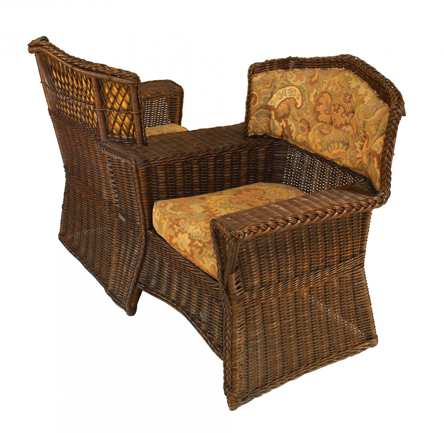 American Victorian (Mission) natural wicker tete-a-tete (conversation seat) with shaped back and tapestry upholstered seat and back. (HEYWOOD WAKEFIELD)