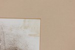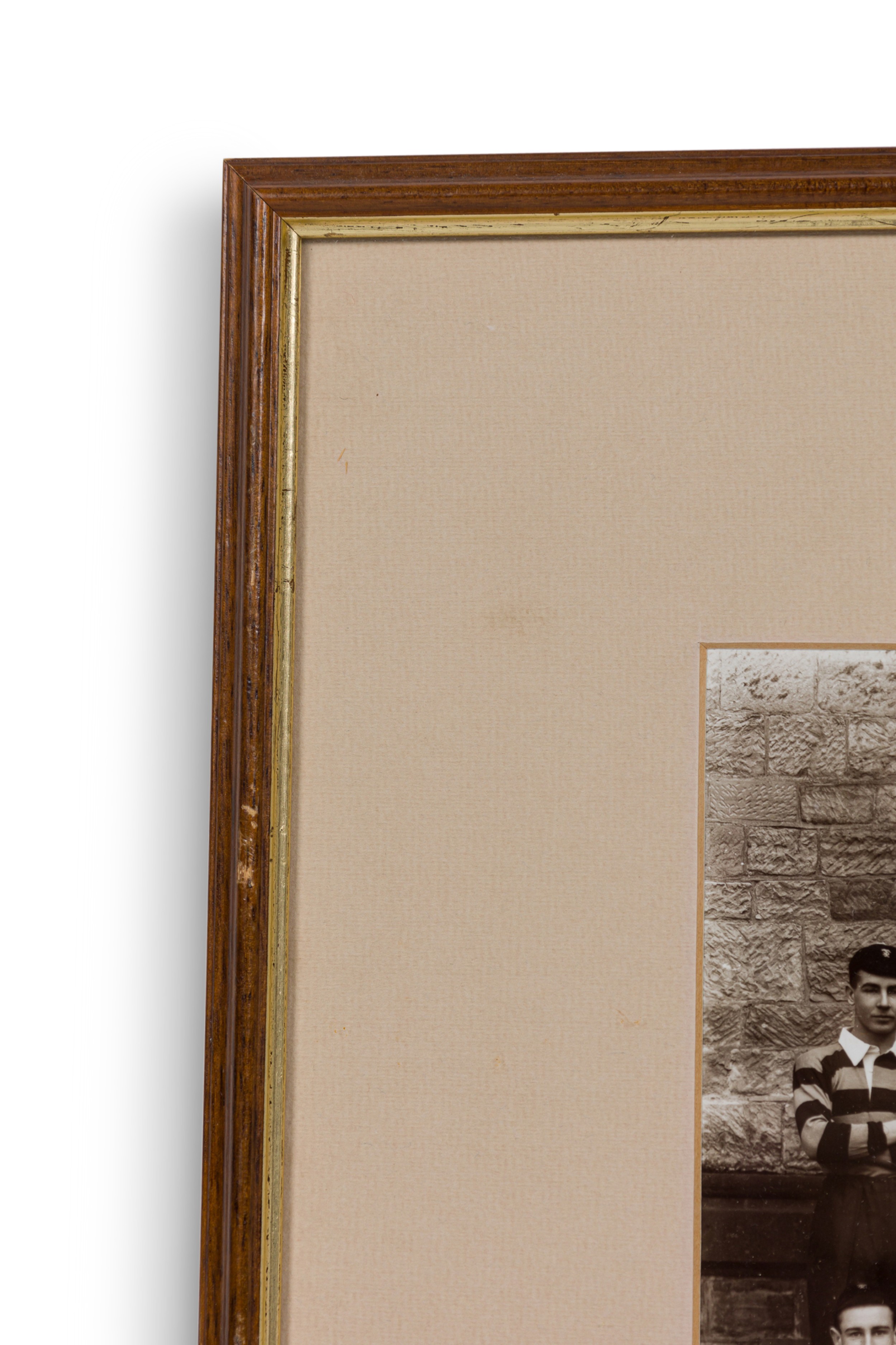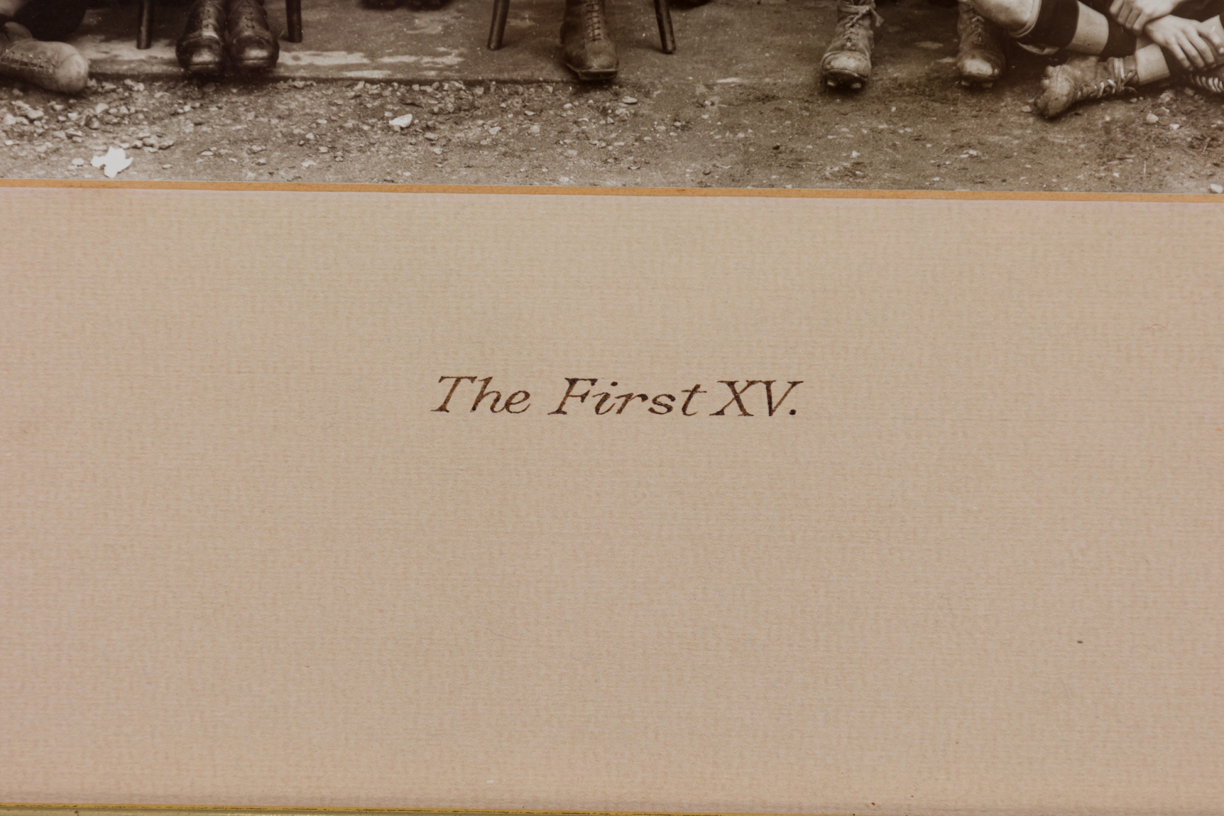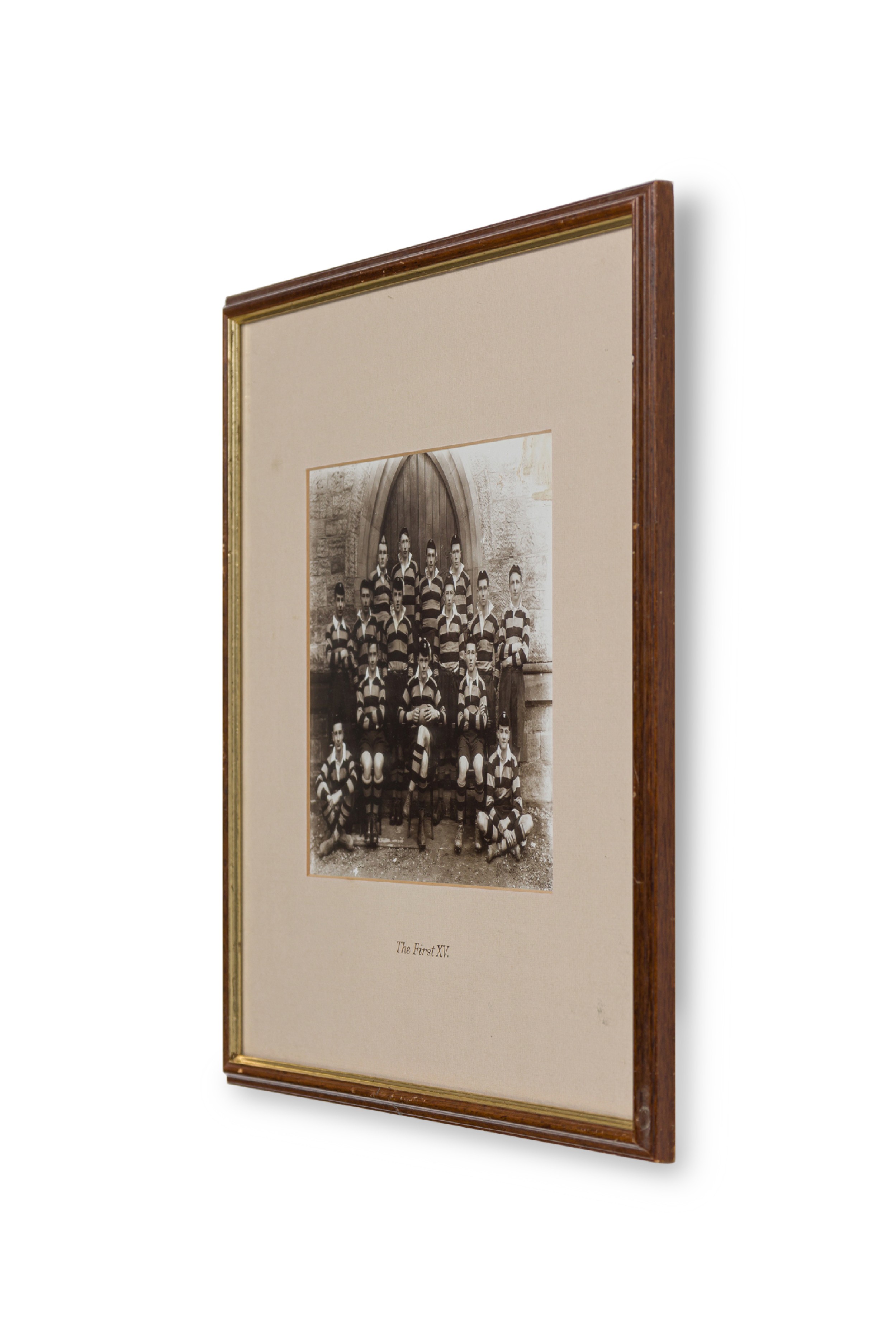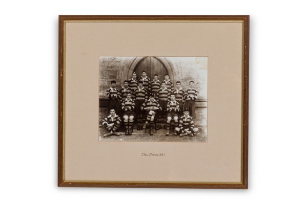 American Vintage black and white photograph of a rugby team photograph in striped uniforms and hats in front of a school facade and "The First XV" inscribed on an off-white mat.