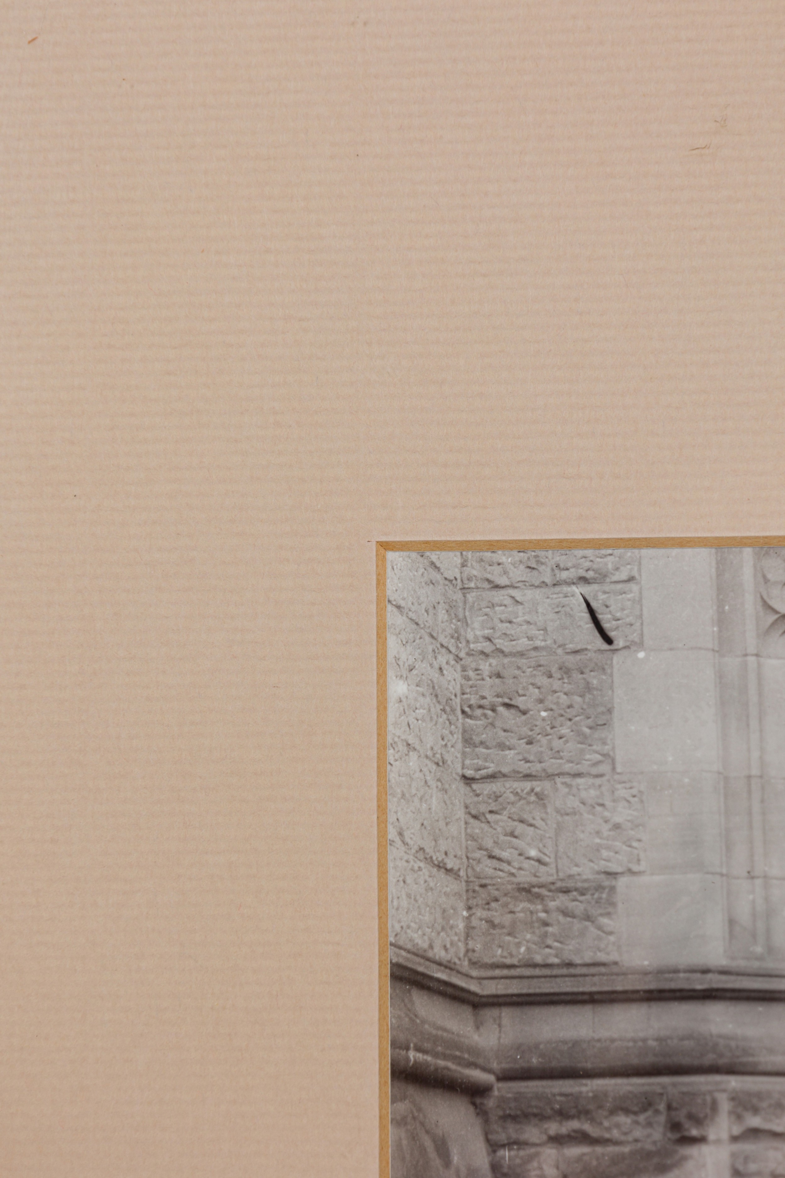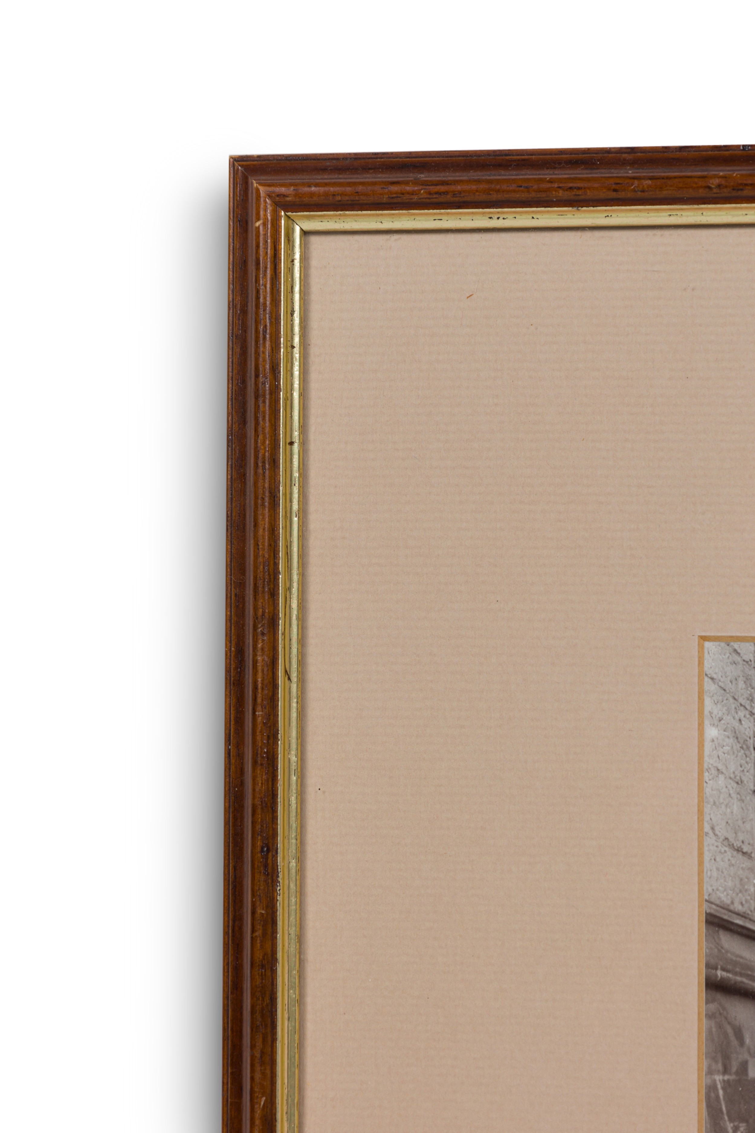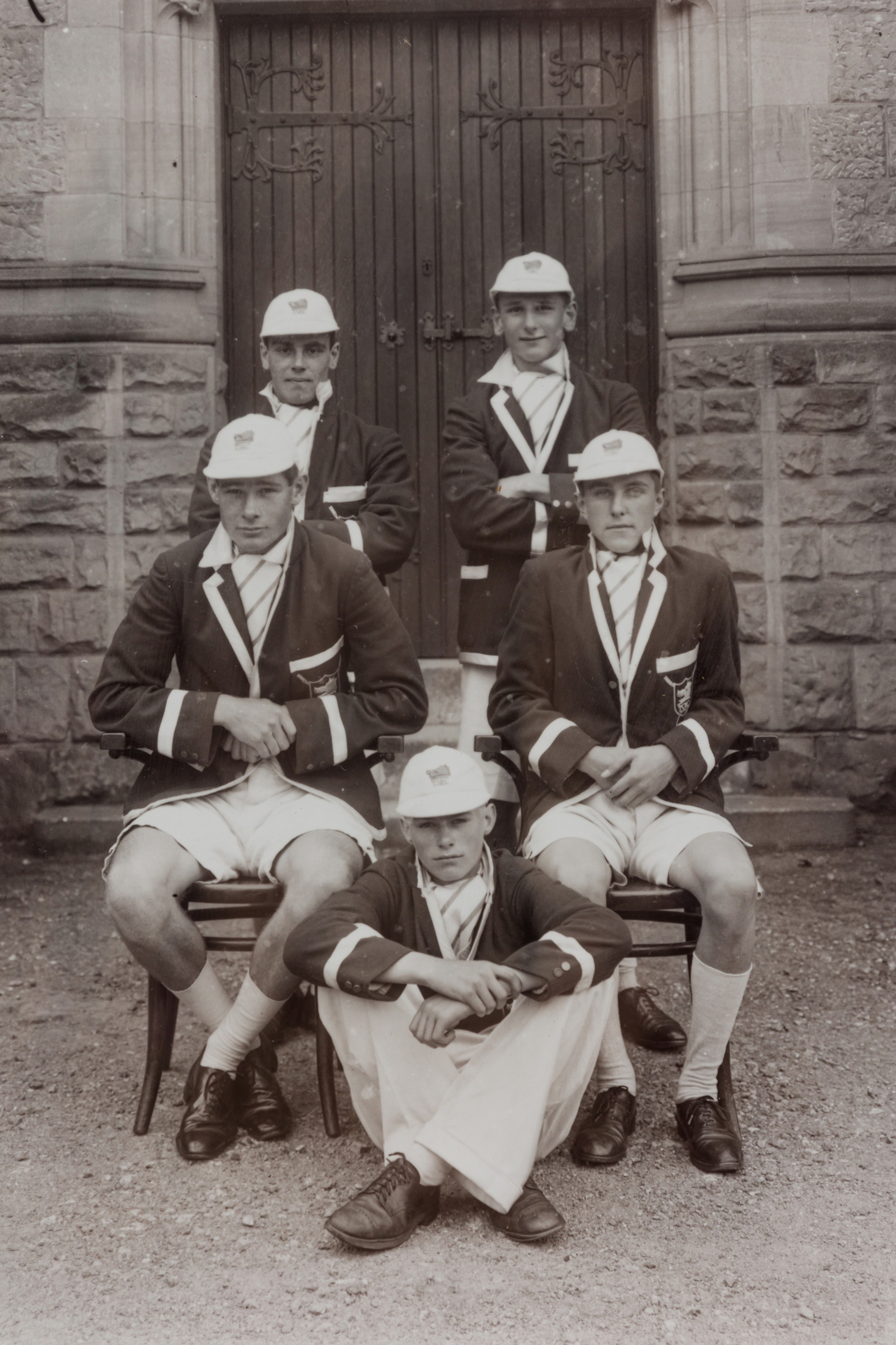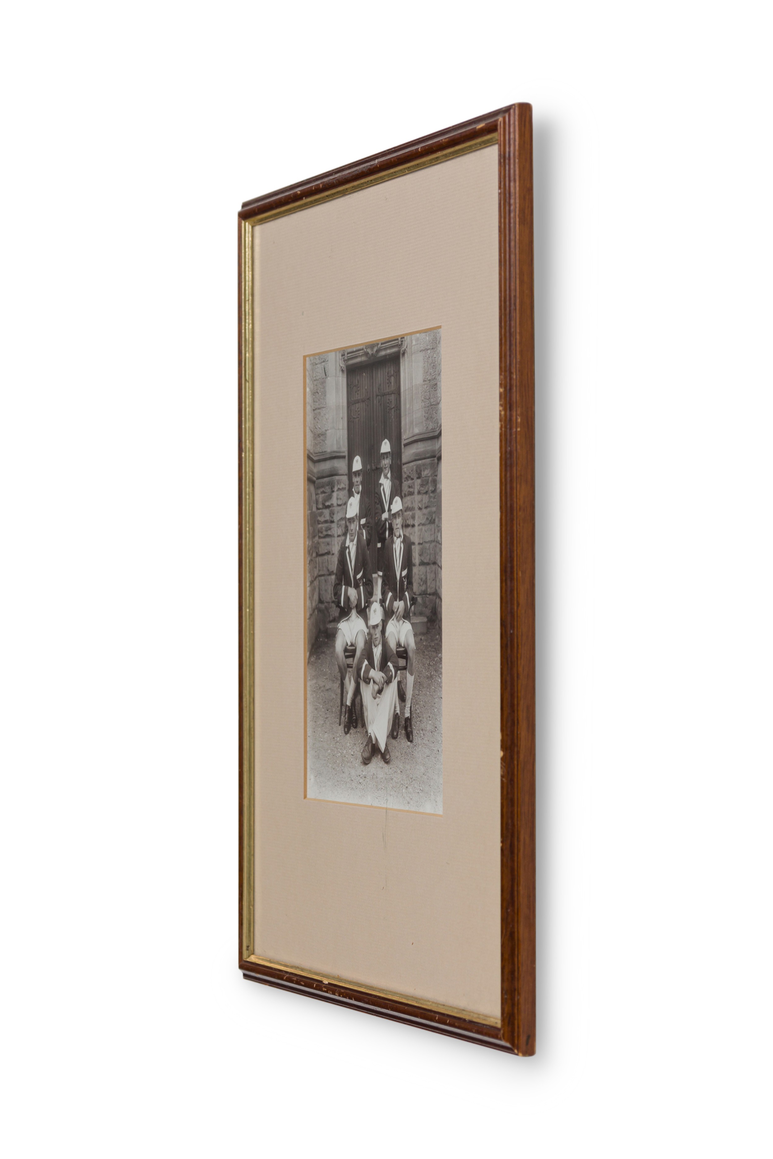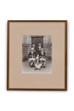 American Vintage black and white photograph of a 5 person tennis team in matching blazers and athletic uniforms in an off-white mat and wood frame