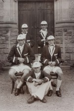 American Vintage black and white photograph of a 5 person tennis team in matching blazers and athletic uniforms in an off-white mat and wood frame.