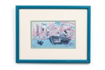 American Mid-Century seascape print in a blue frame with a boat filled with a pair of different animals with the skyline of New York (titled "Noah's Arc in NYC" by AMI GOLDFARB)