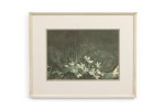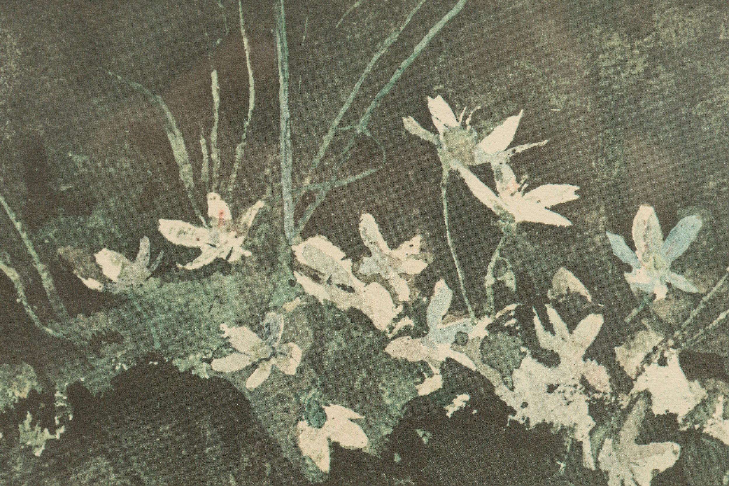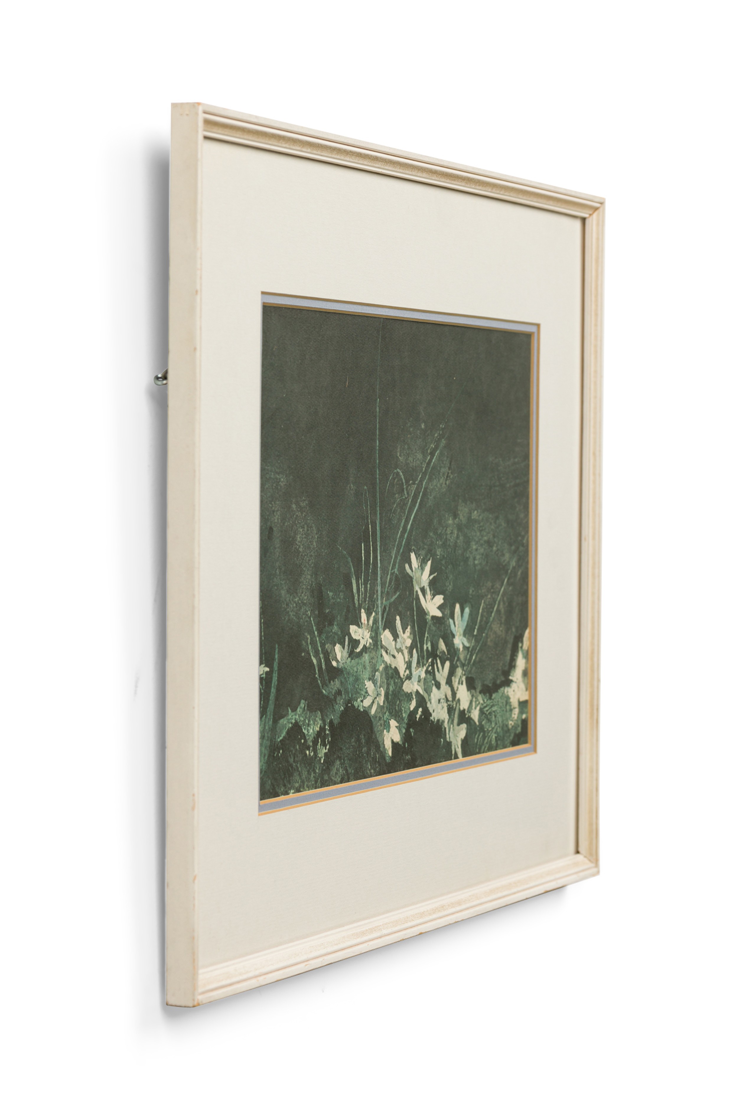 American Mid-Century "dry brush" lithograph in a white frame of white flowers with a green and black background titled "May Day" by ANDREW WYETH)