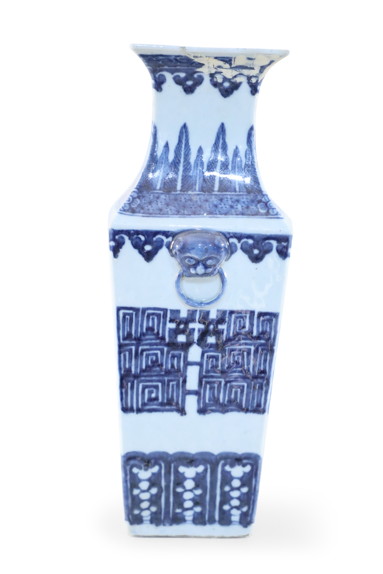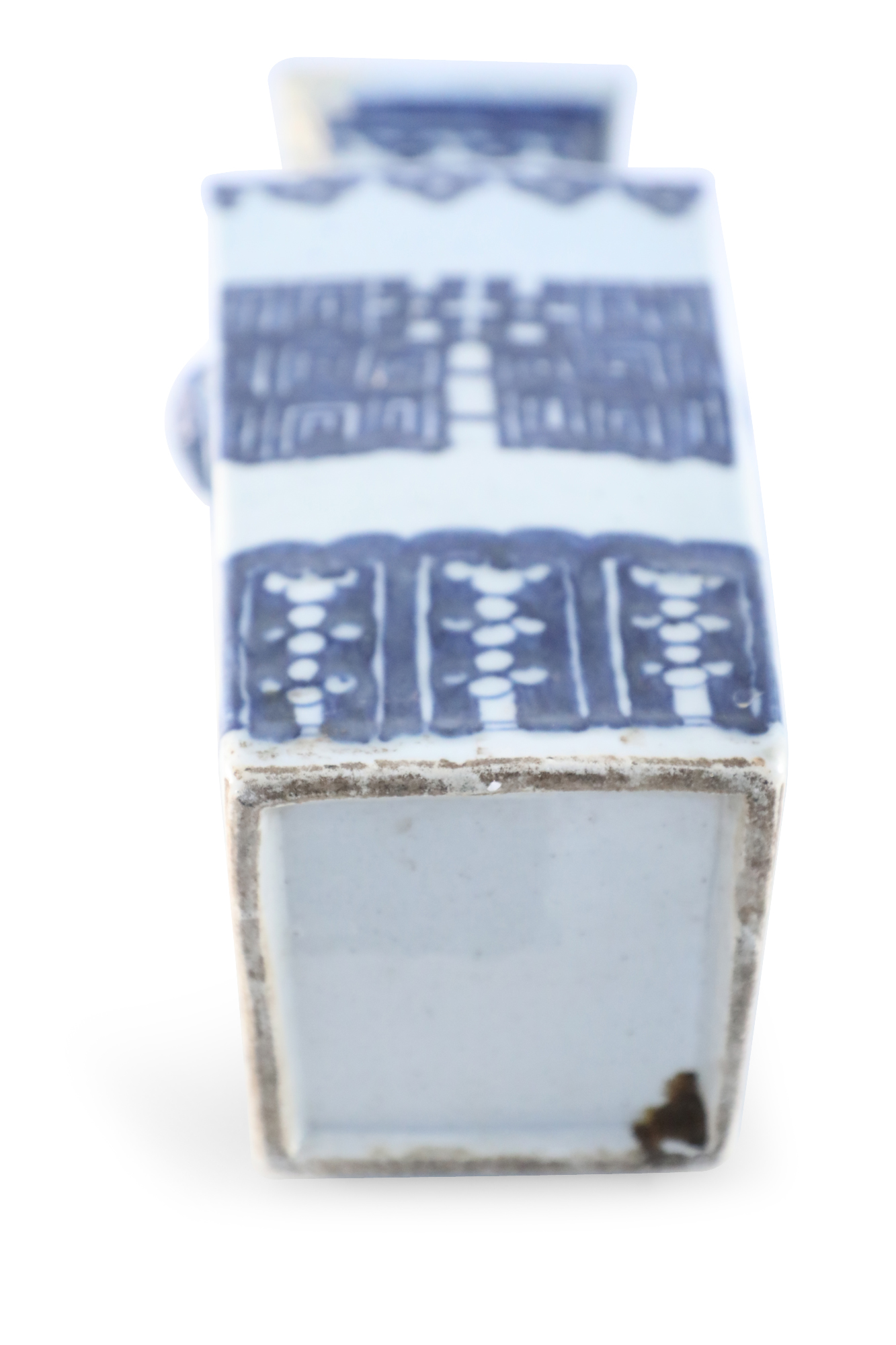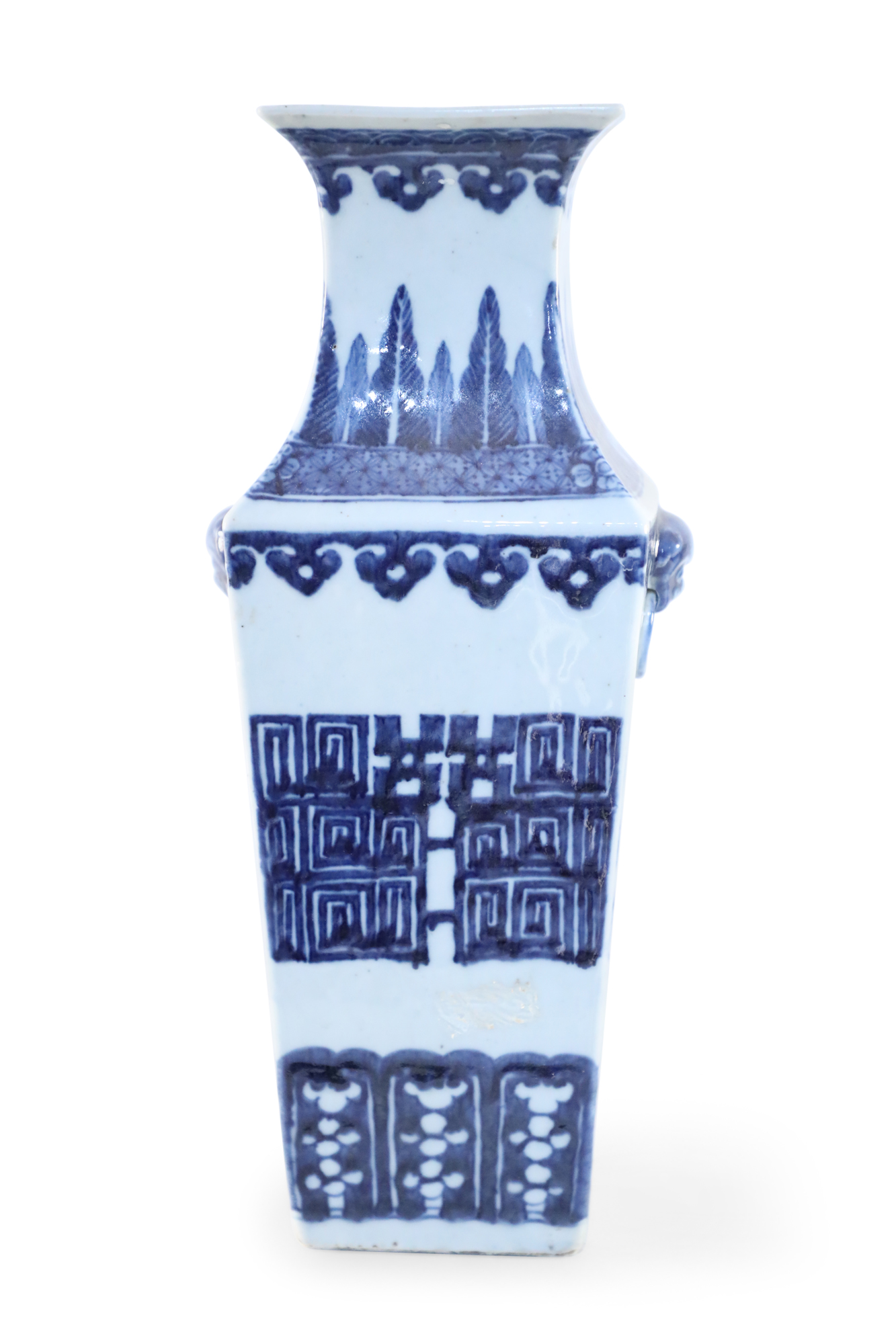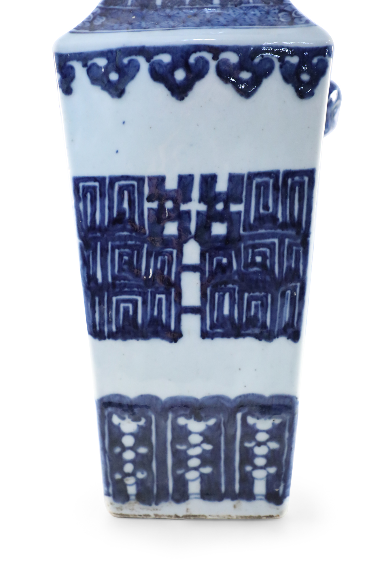 Antique Chinese white ceramic vase with a squared form wrapped in dark blue geometric patterns, with animal-shaped ears on two sides.