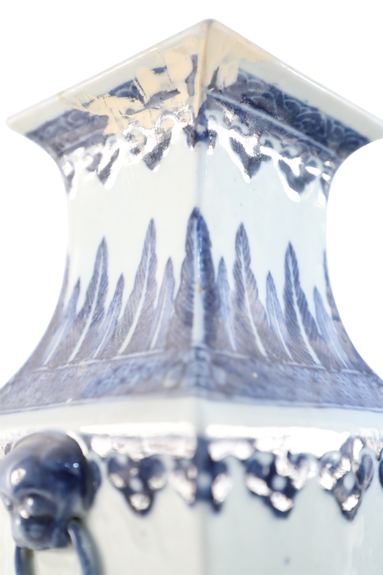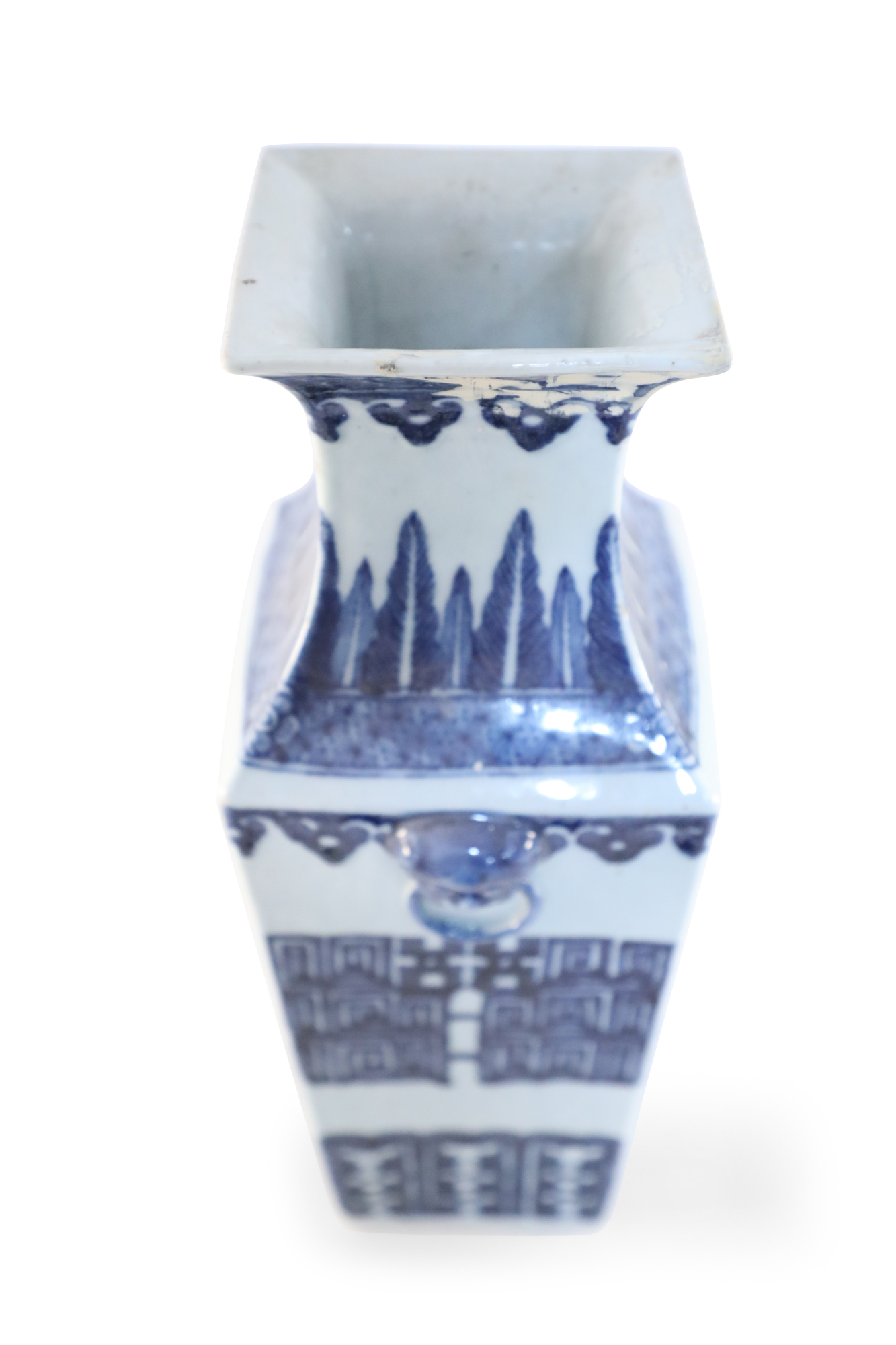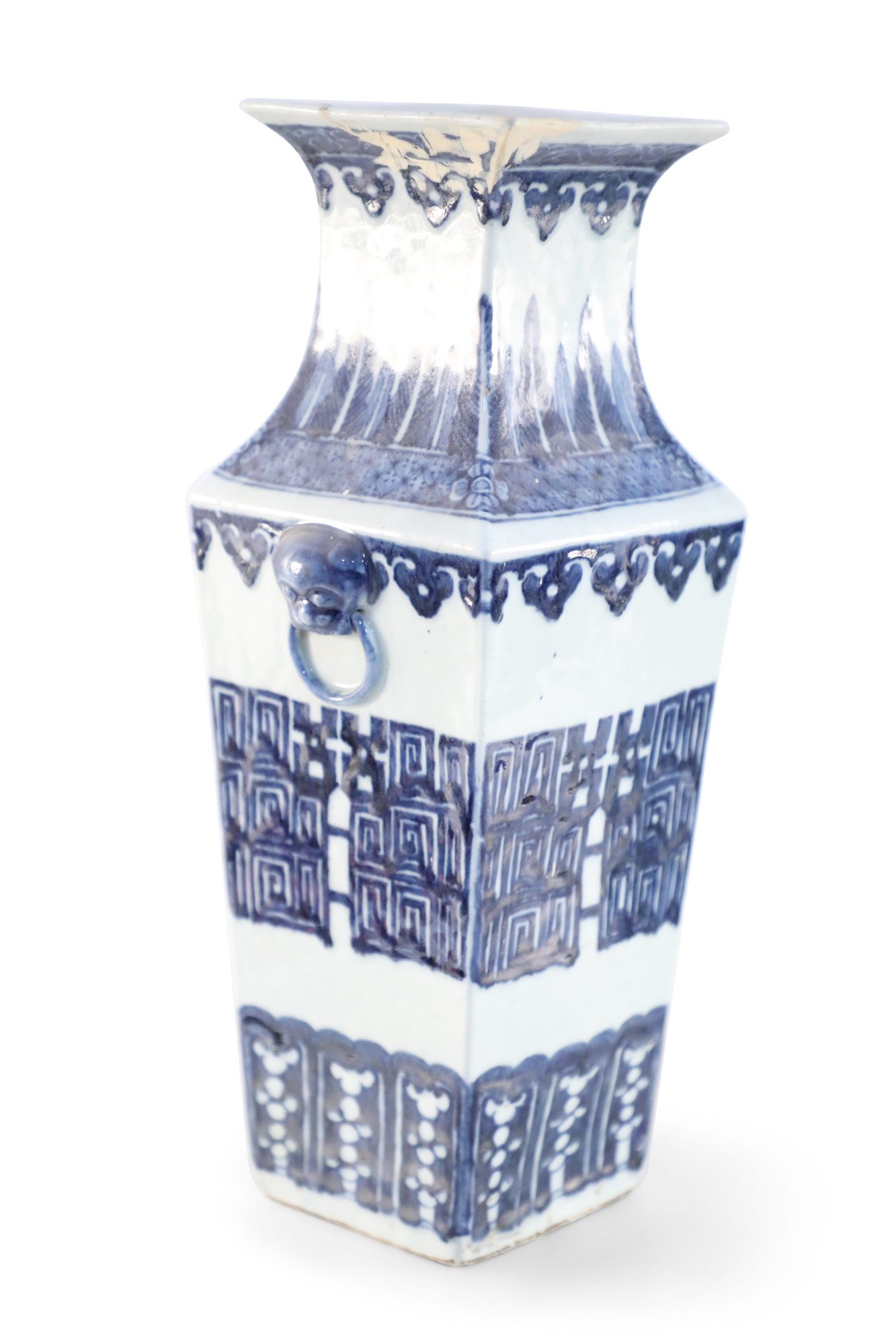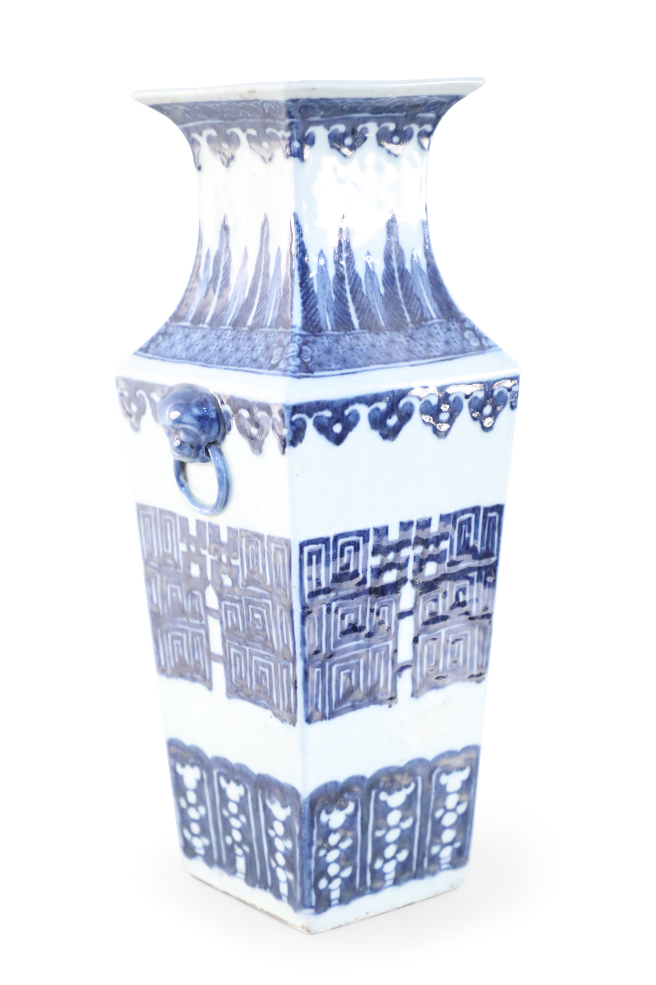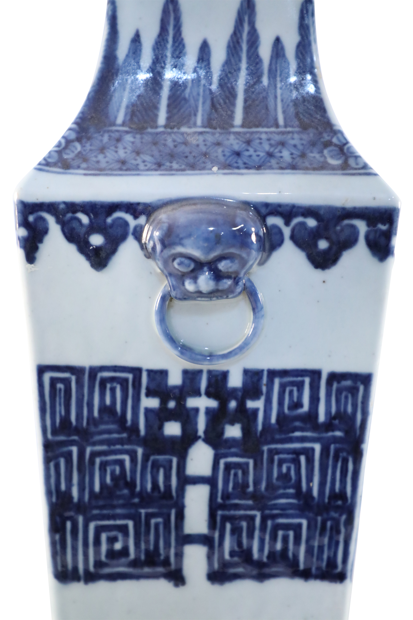 Antique Chinese white ceramic vase with a squared form wrapped in dark blue geometric patterns, with animal-shaped ears on two sides.