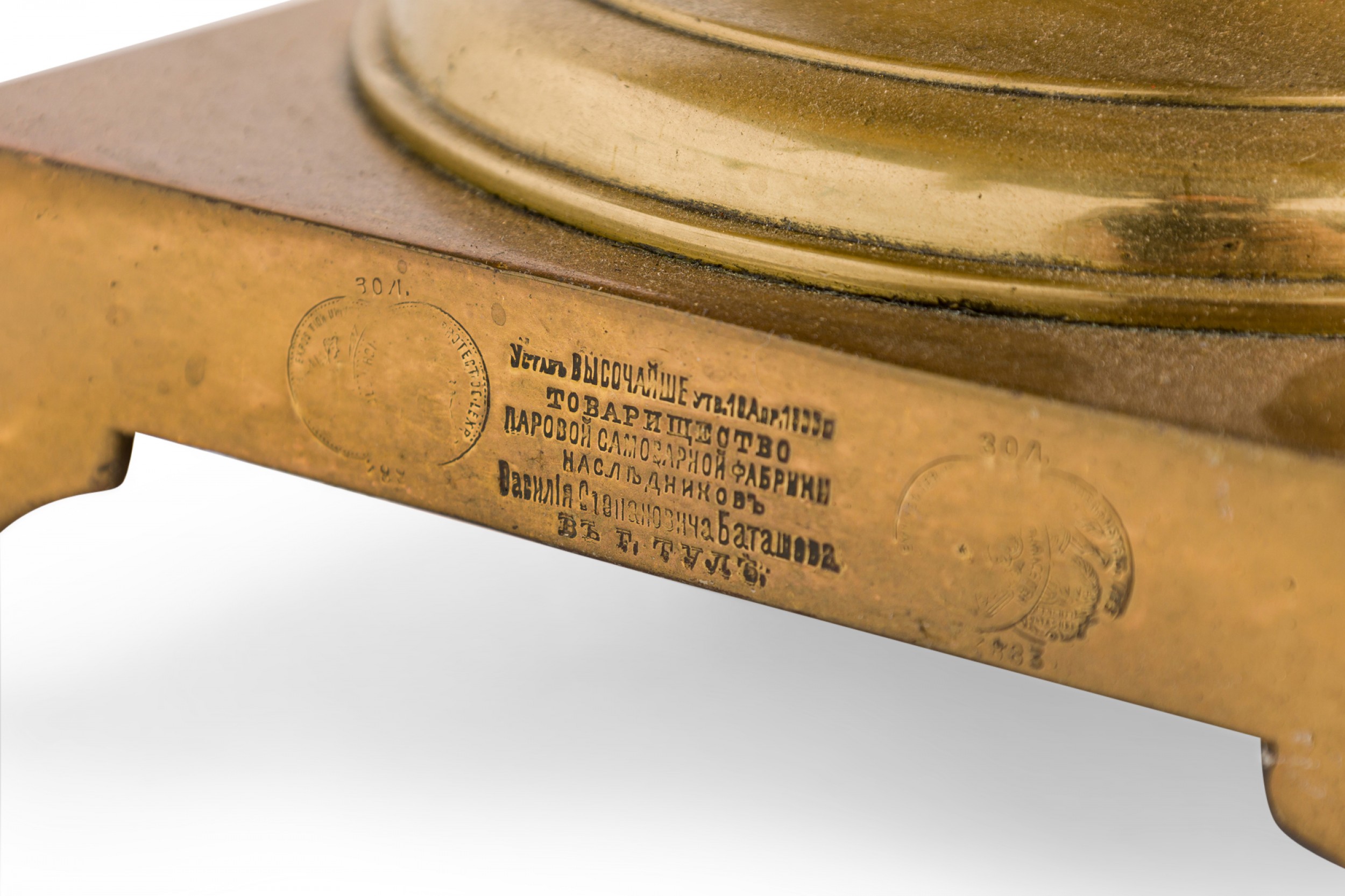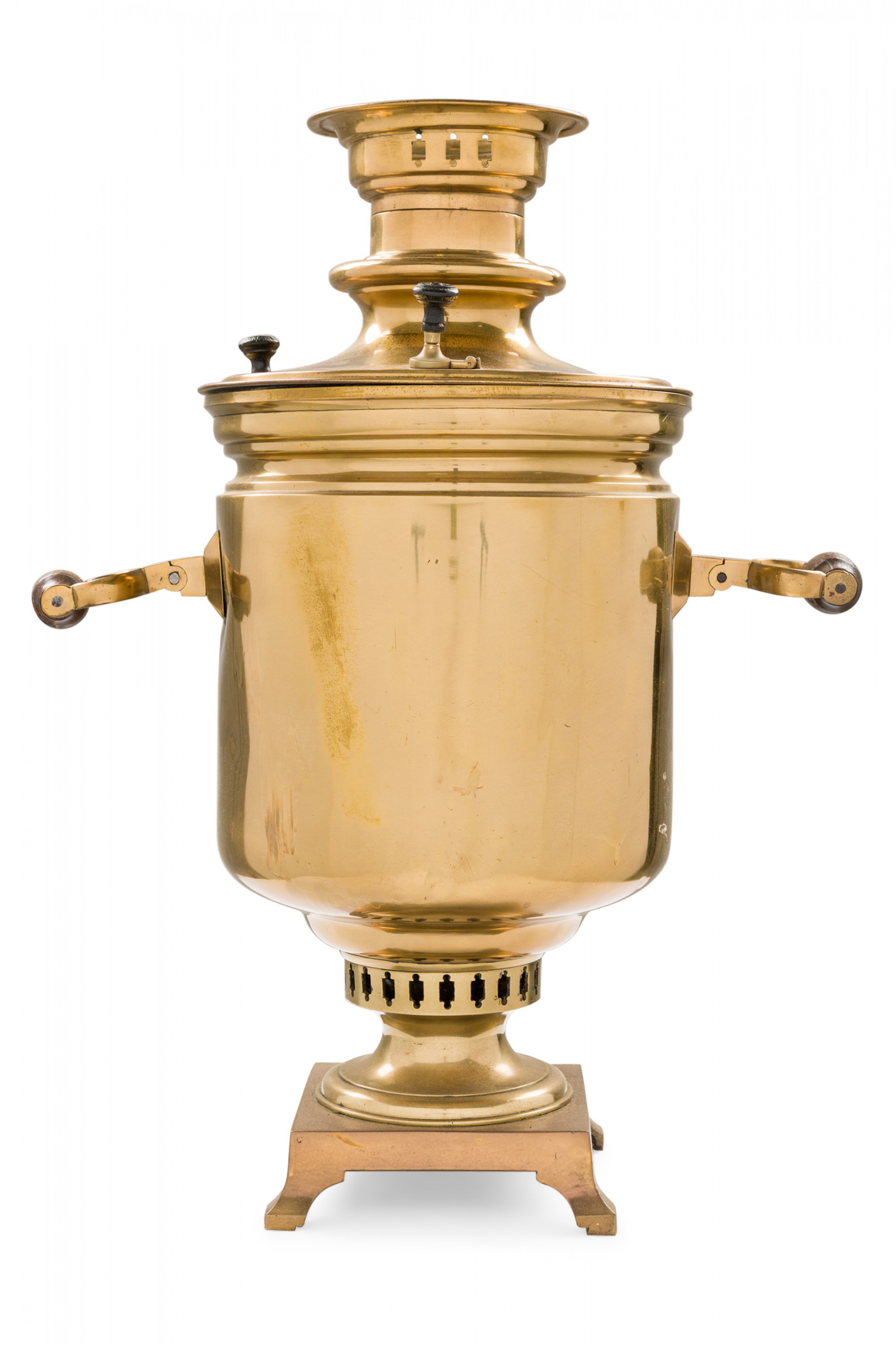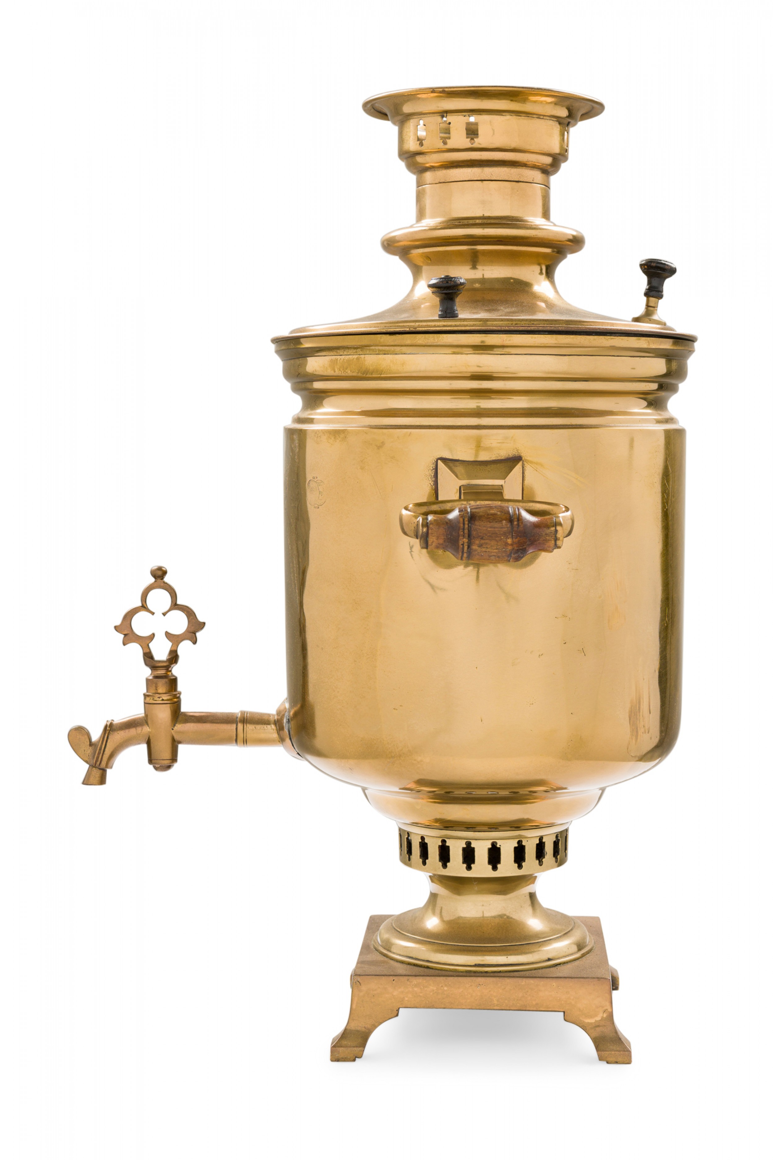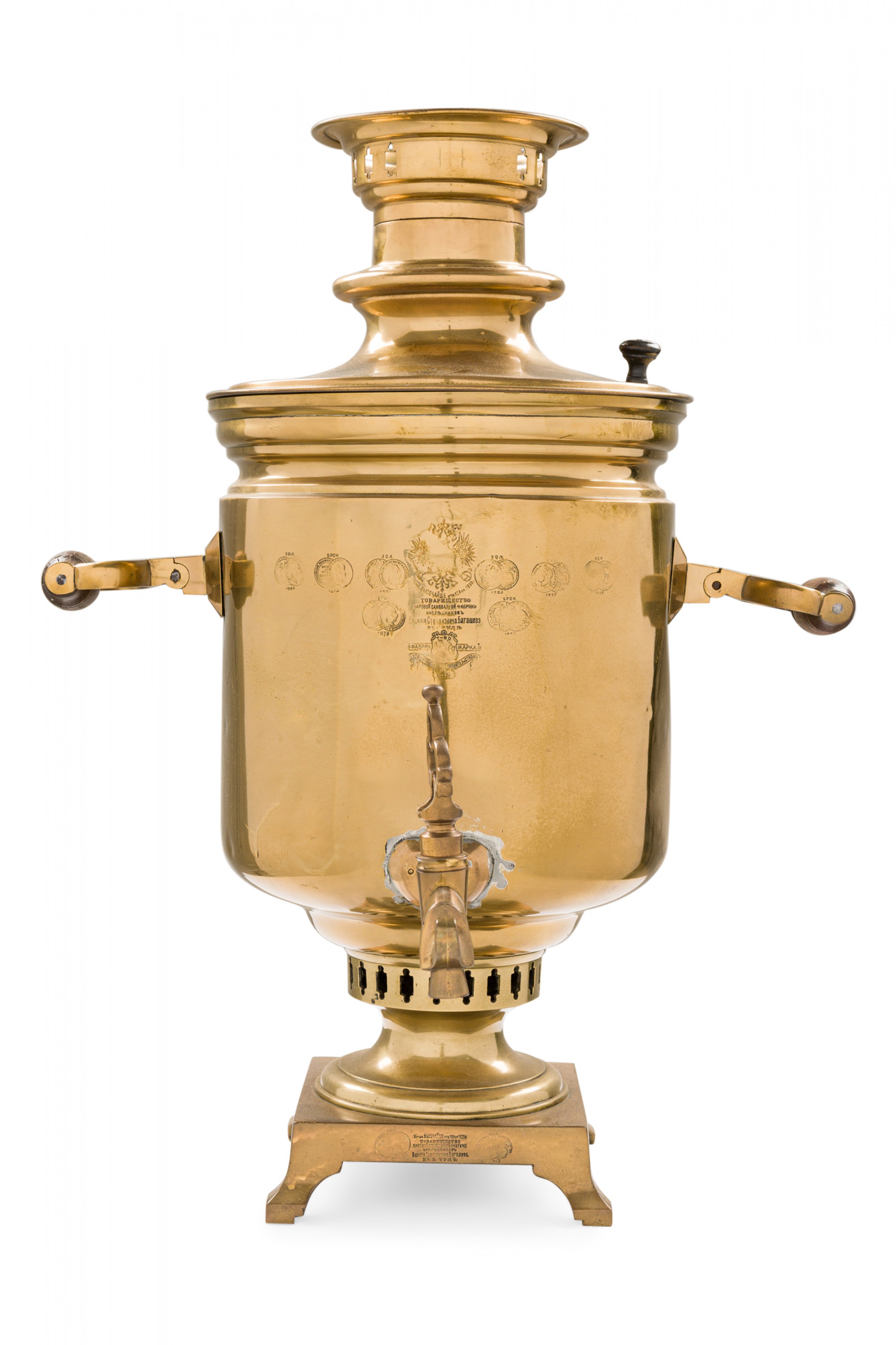 Antique Russian samovar with a brass plated etched metal exterior and removable top, resting on a square four footed base..