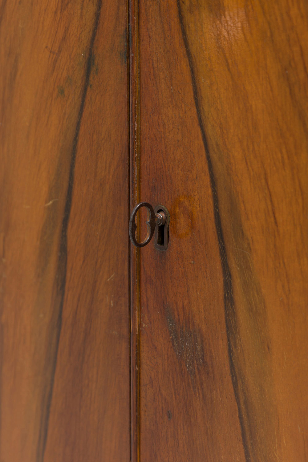 Art Deco American bow front matchbook veneered rectangular bar cabinet with a hinged top dropdown drawer (with scroll & foliate brass escutcheon plus original bakelite signature pull) over a drum bottom section's pullout doors hide