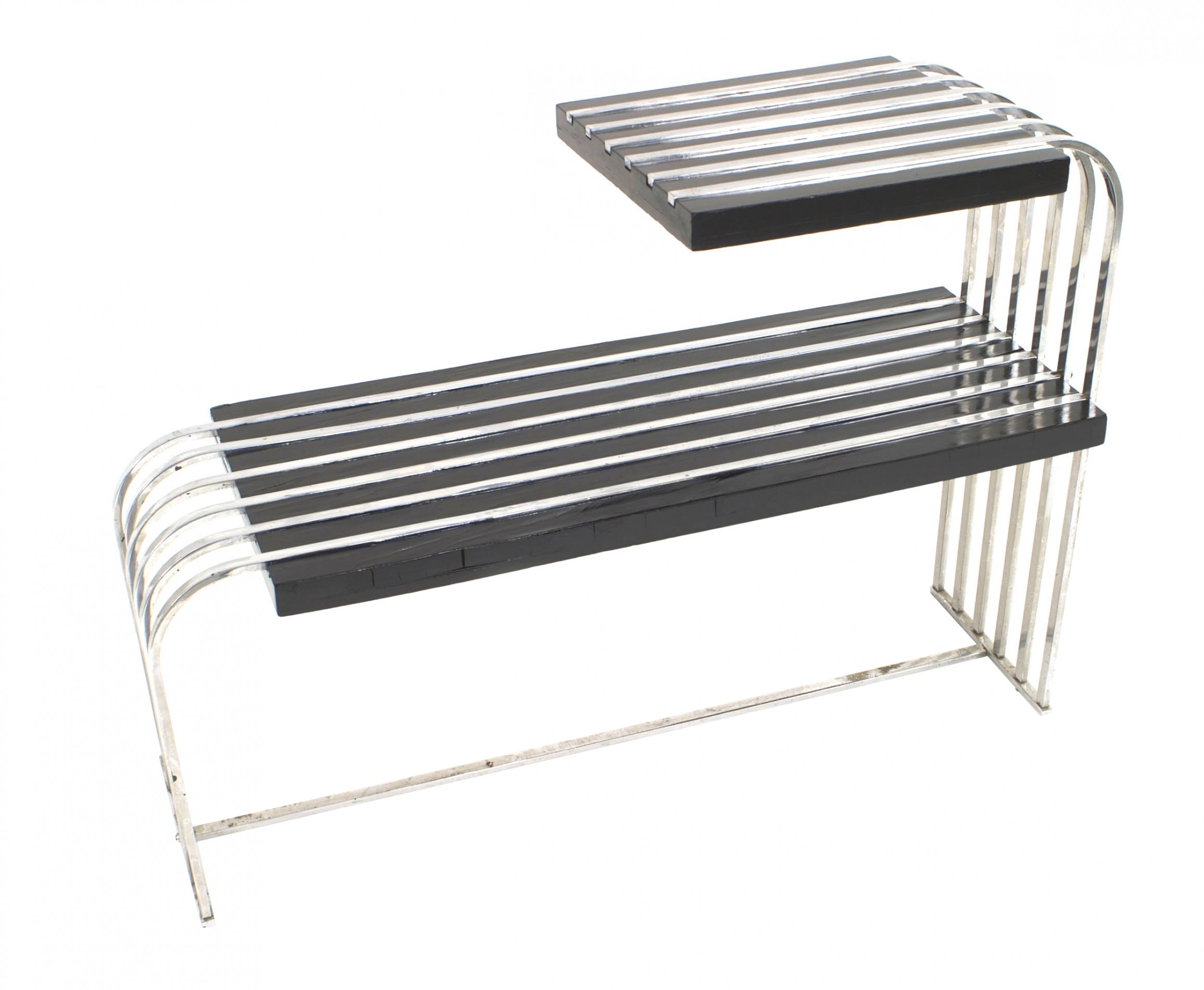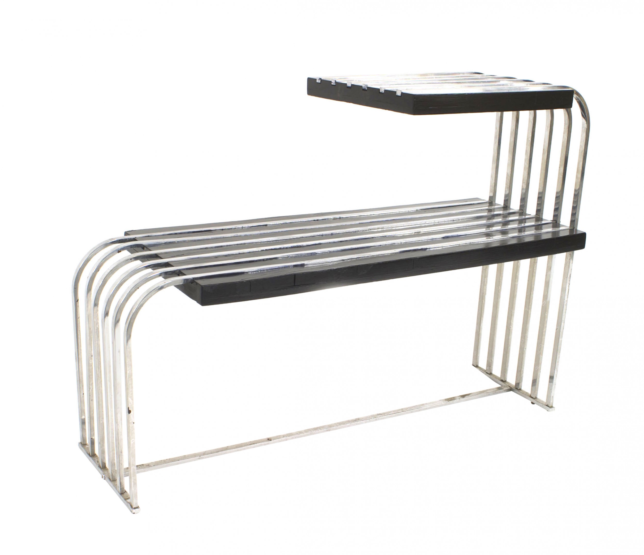 American Art Deco (1930s) black lacquered and chrome 2 tier end table with curved sides and a chrome stretcher.