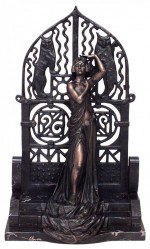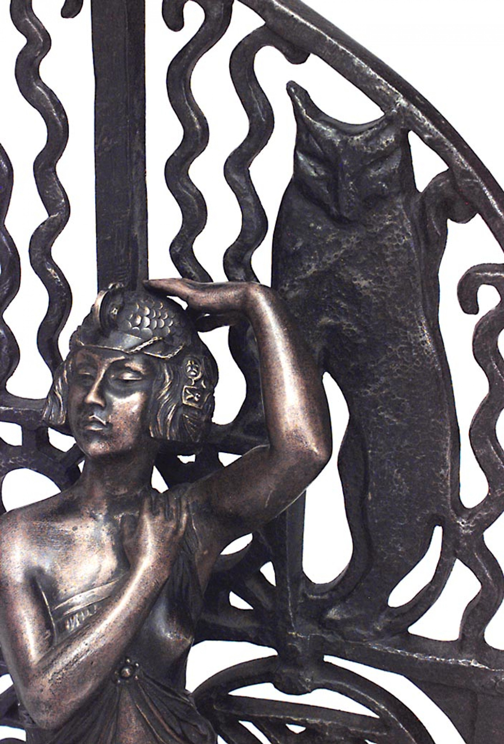 French Art Deco bronze figure of dancing lady "Antinea, Queen of Hoggar" standing on 3 black marble steps in front of a wrought iron Gothic style gate (att: Marcel Bouraine)