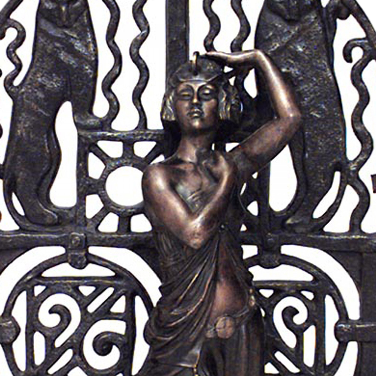 French Art Deco bronze figure of dancing lady "Antinea, Queen of Hoggar" standing on 3 black marble steps in front of a wrought iron Gothic style gate (att: Marcel Bouraine).