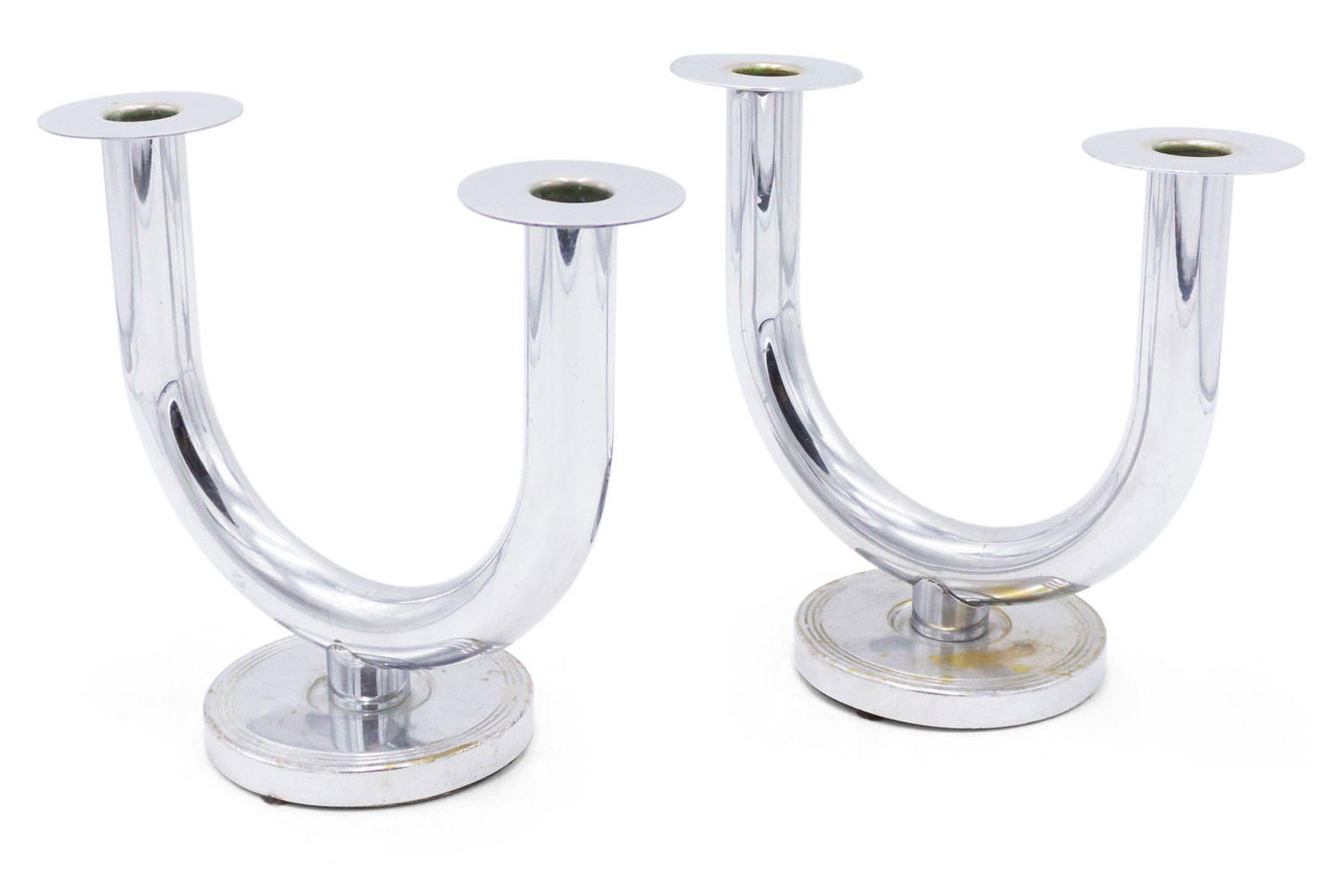 PAIR of Art Deco chrome double arm candelabras (PRICED AS PAIR).