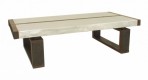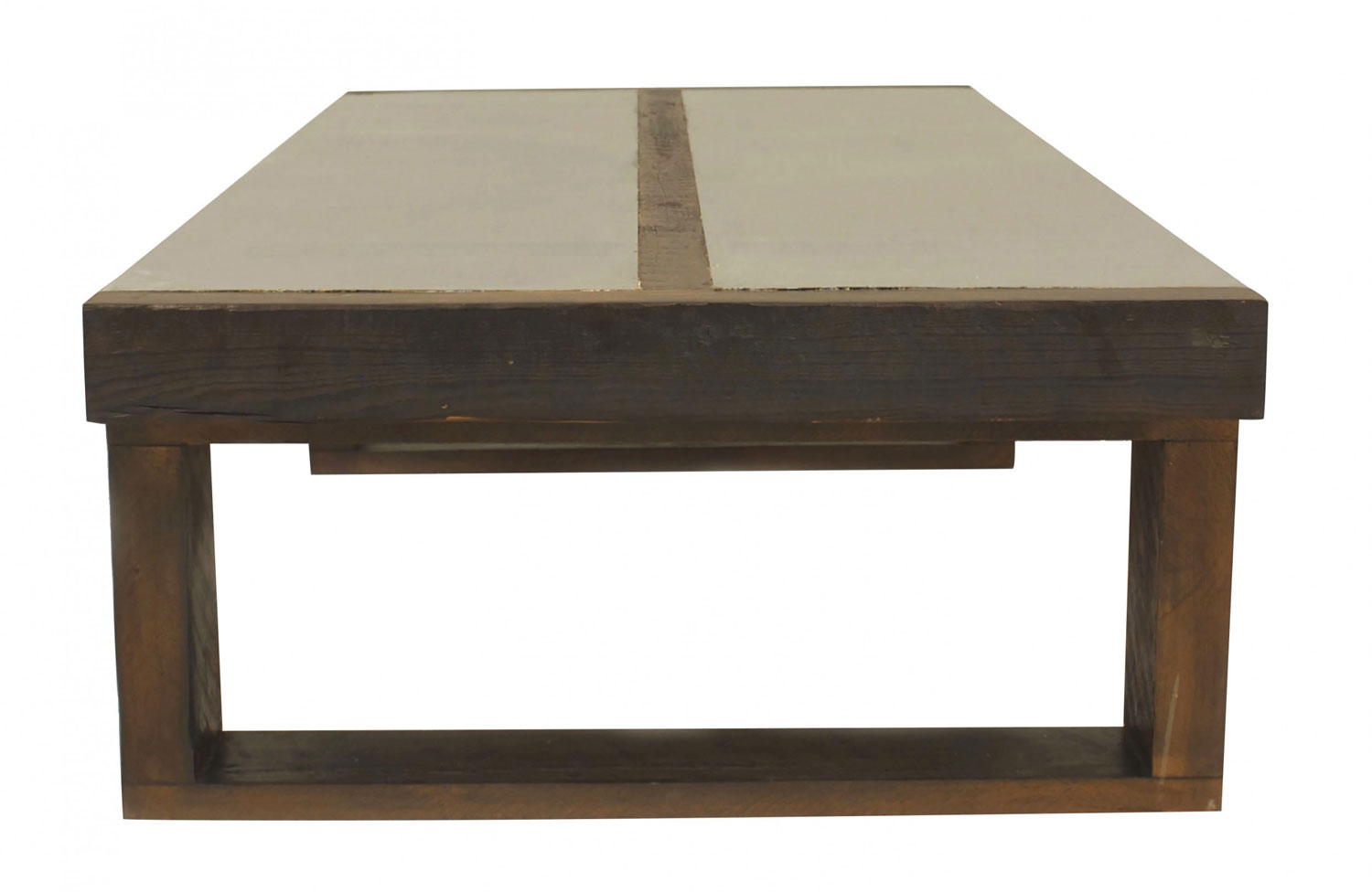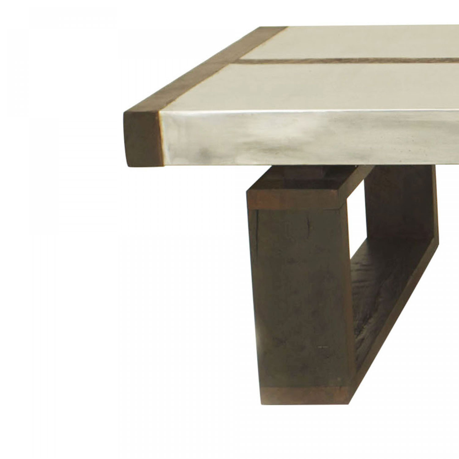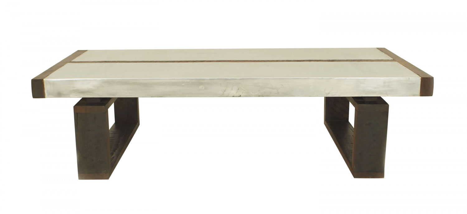 Art Deco Constructivist-style rectangular coffee table with stained oak sides and a top with a center strip separating two metal panels and two open pedestal base sides..