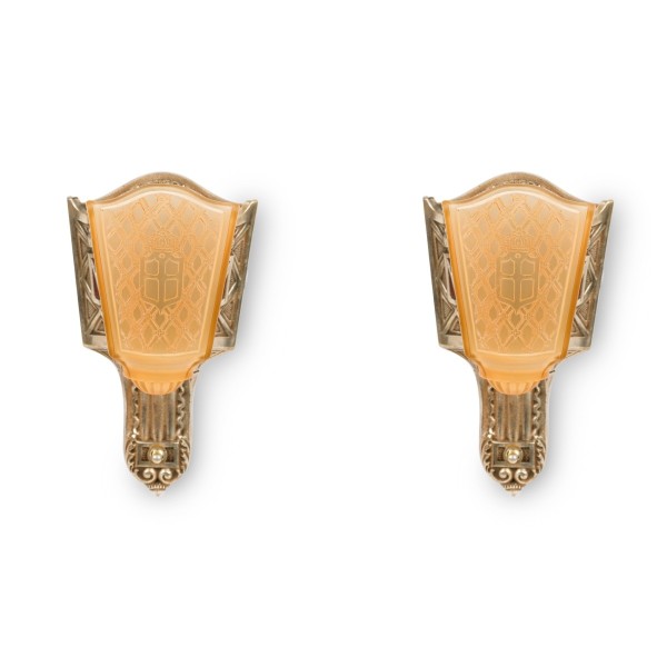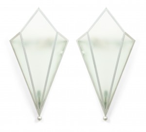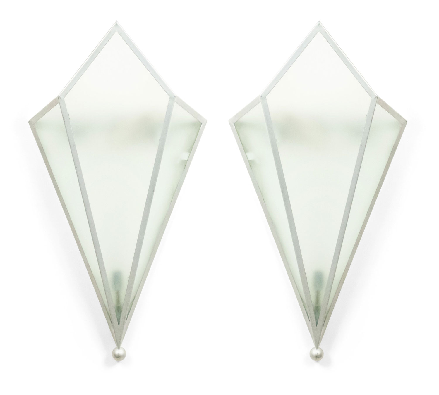 4 Art Deco-Style wall sconces with 3 geometric shaped frosted glass panels set in a silver painted metal frame. (PRICED EACH).