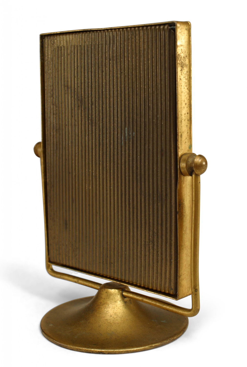 Art Deco-style gilt metal rectangular easel picture frame mounted on a round base..