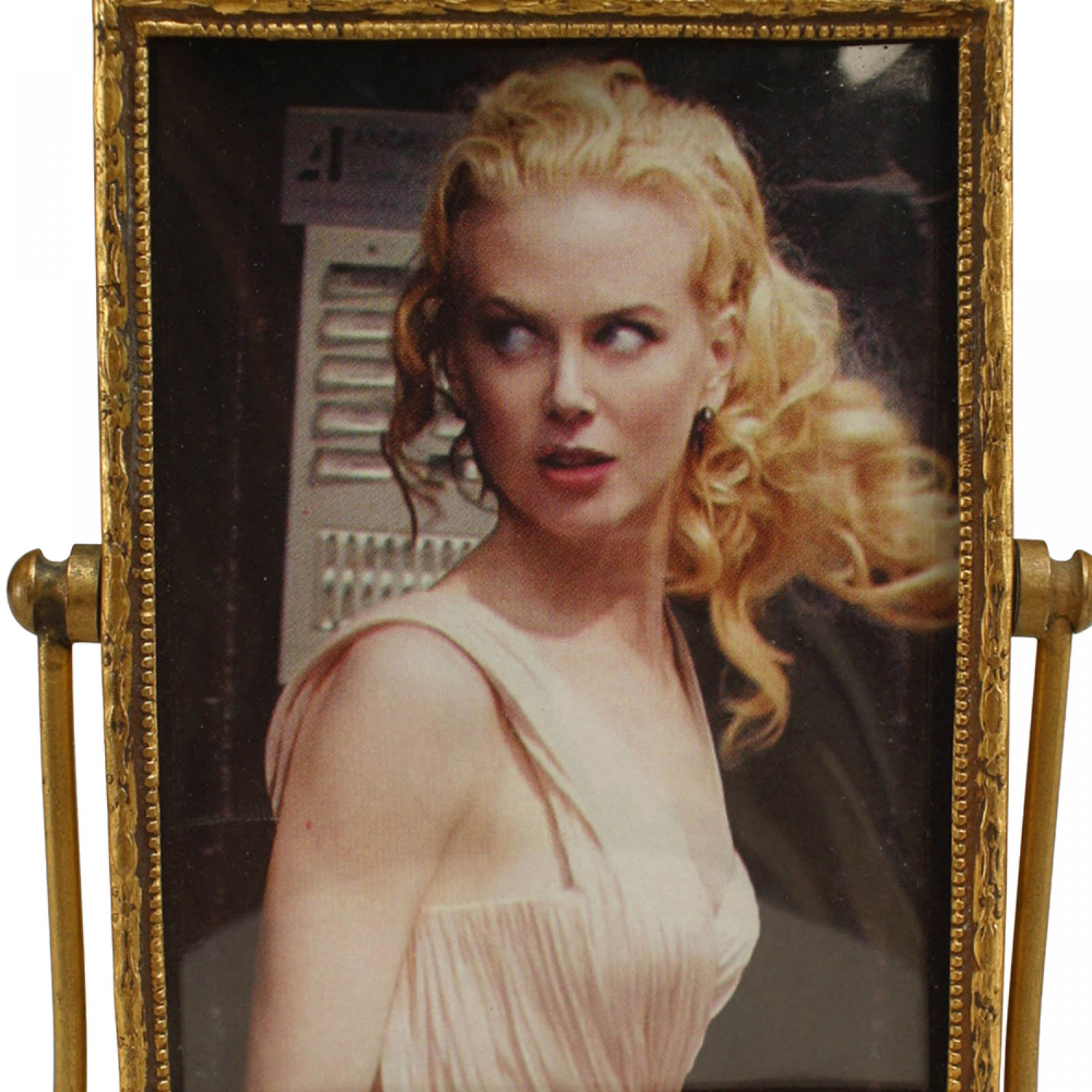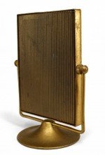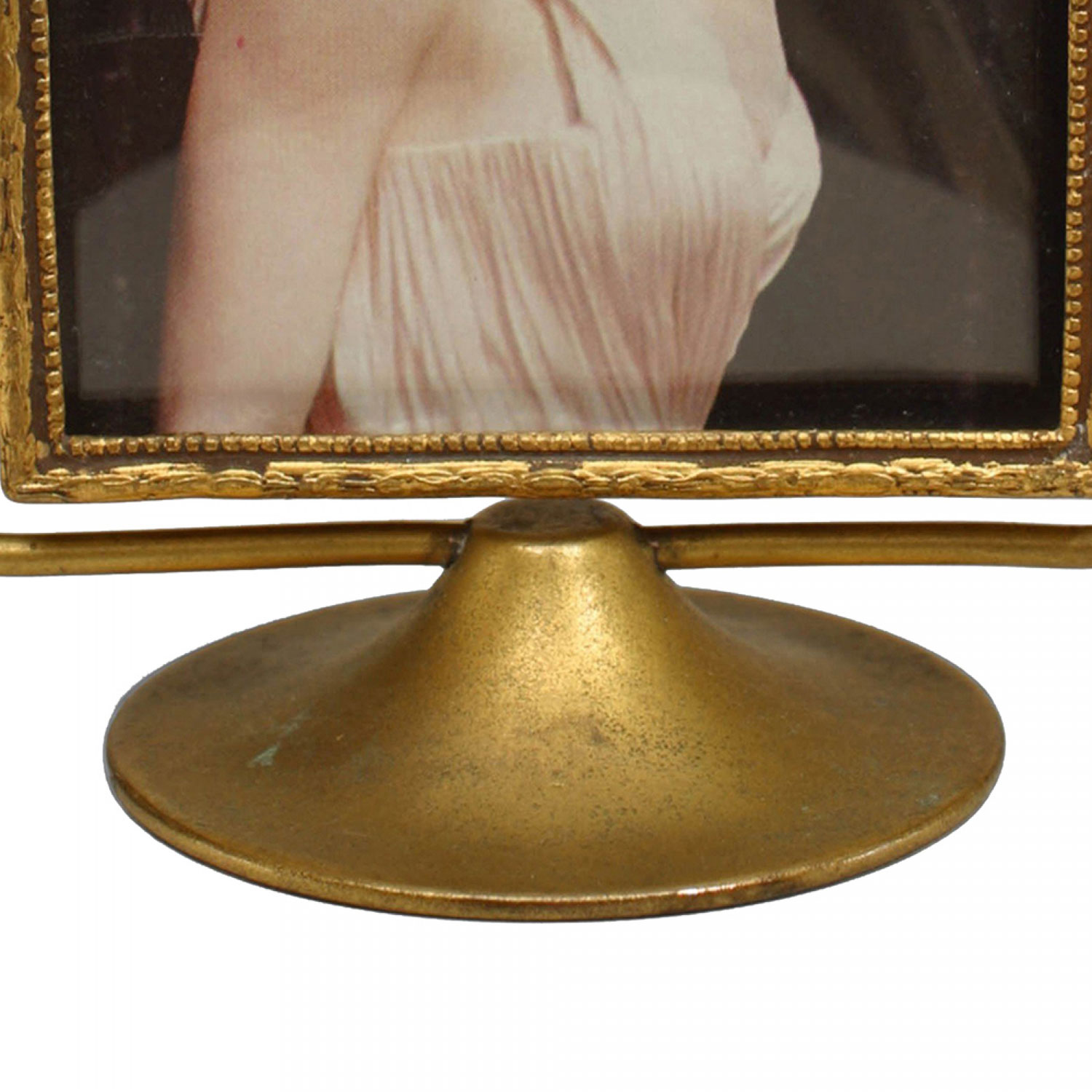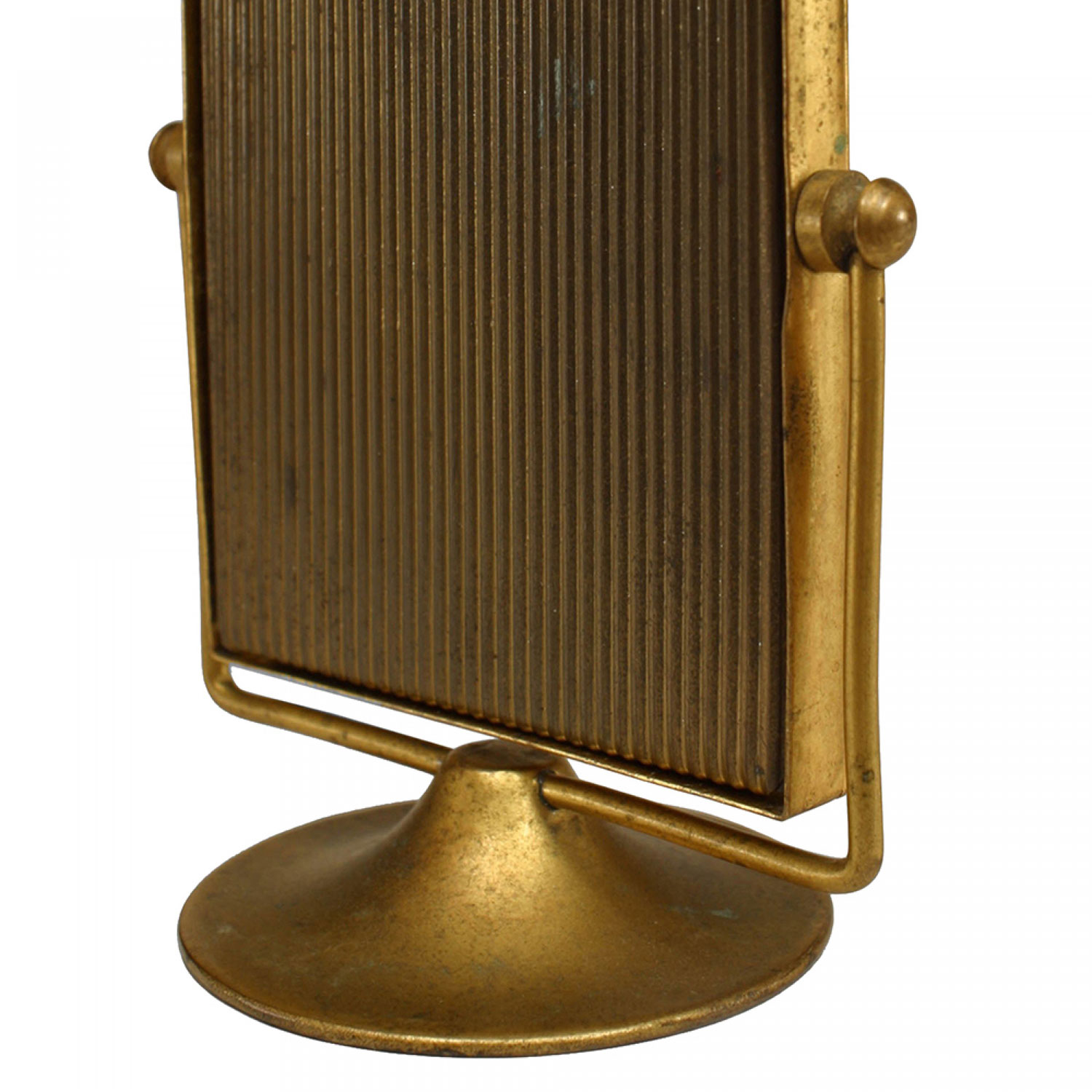 Art Deco-style gilt metal rectangular easel picture frame mounted on a round base.