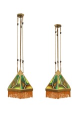 PAIR of Art Deco Belgium brass 6 sided hanging lanterns with geometric design green glass panels with 3 rope supports and fringe around the bottom. (2 different heights) (PRICED AS PAIR).