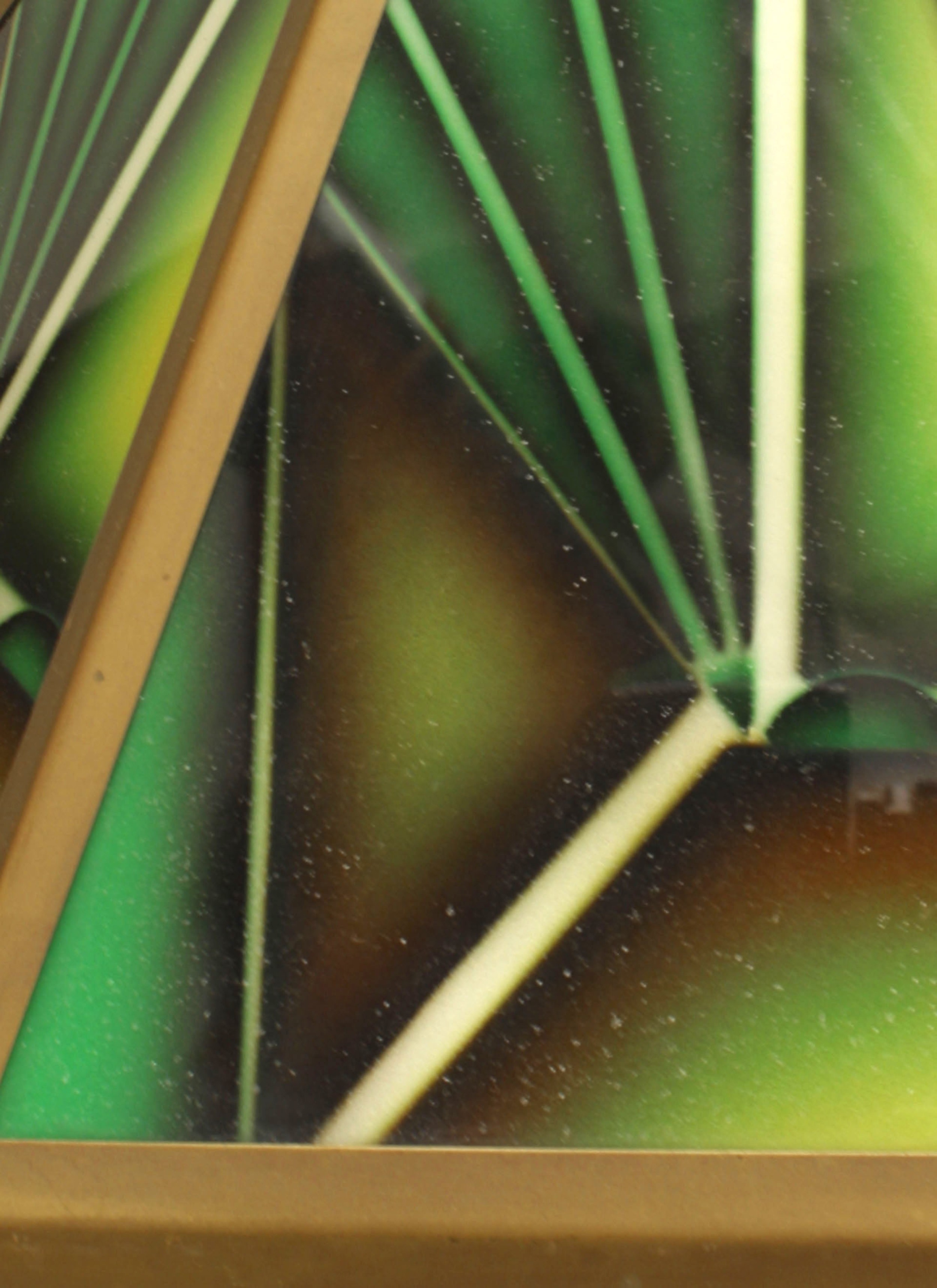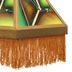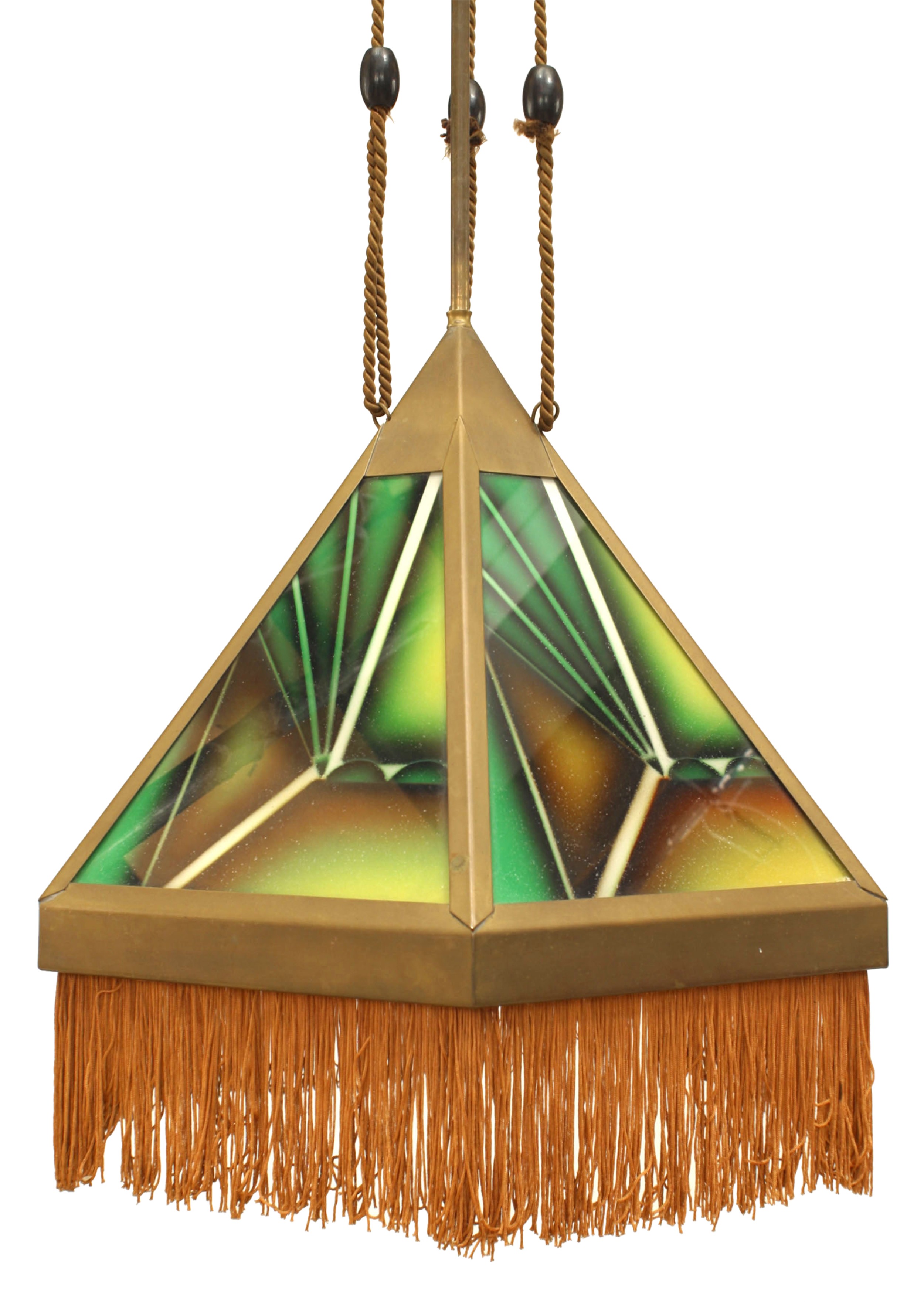 PAIR of Art Deco Belgium brass 6 sided hanging lanterns with geometric design green glass panels with 3 rope supports and fringe around the bottom. (2 different heights) (PRICED AS PAIR)..