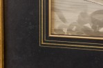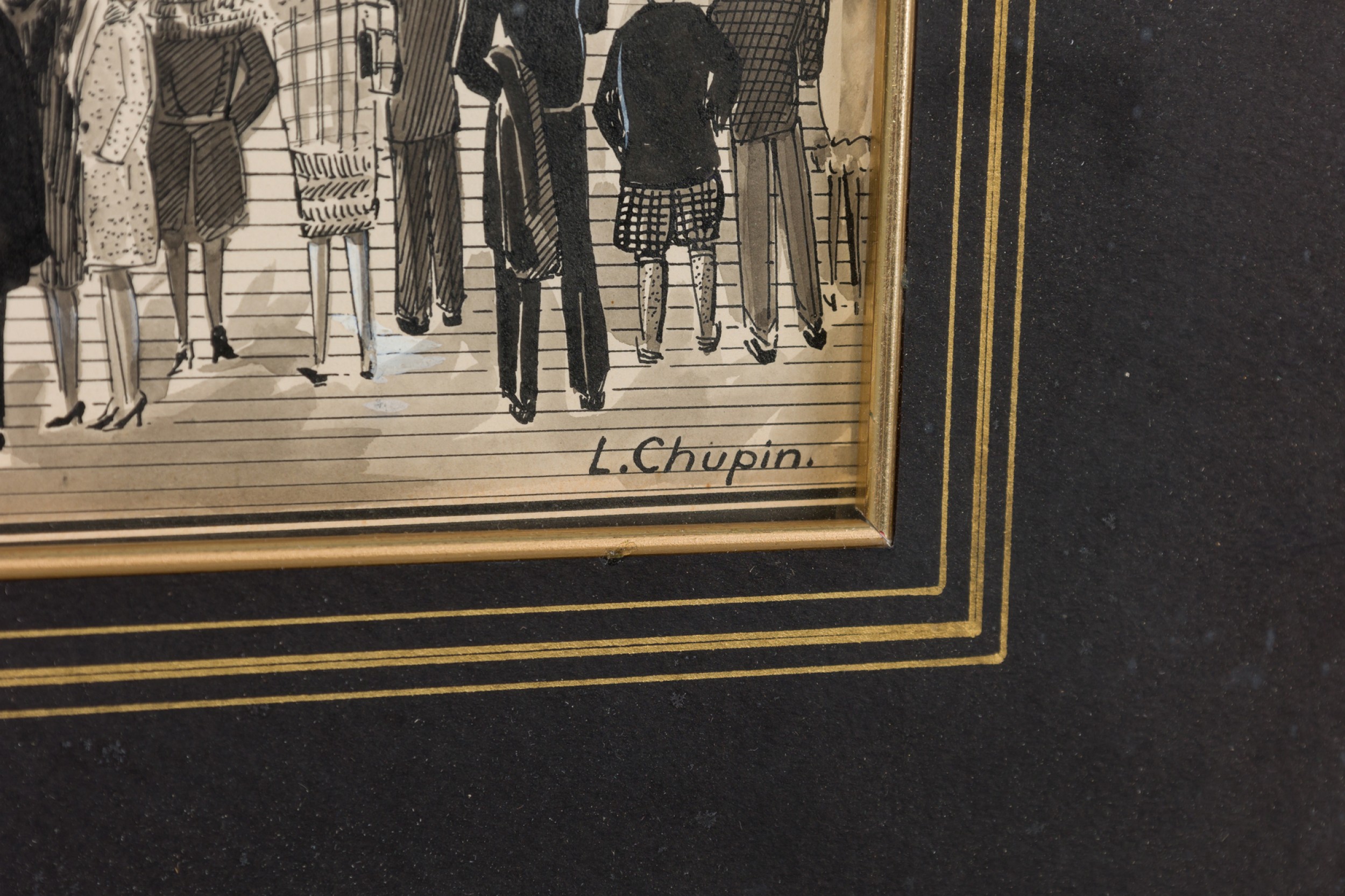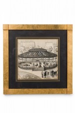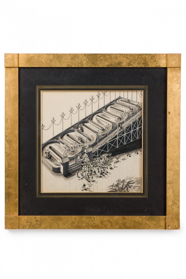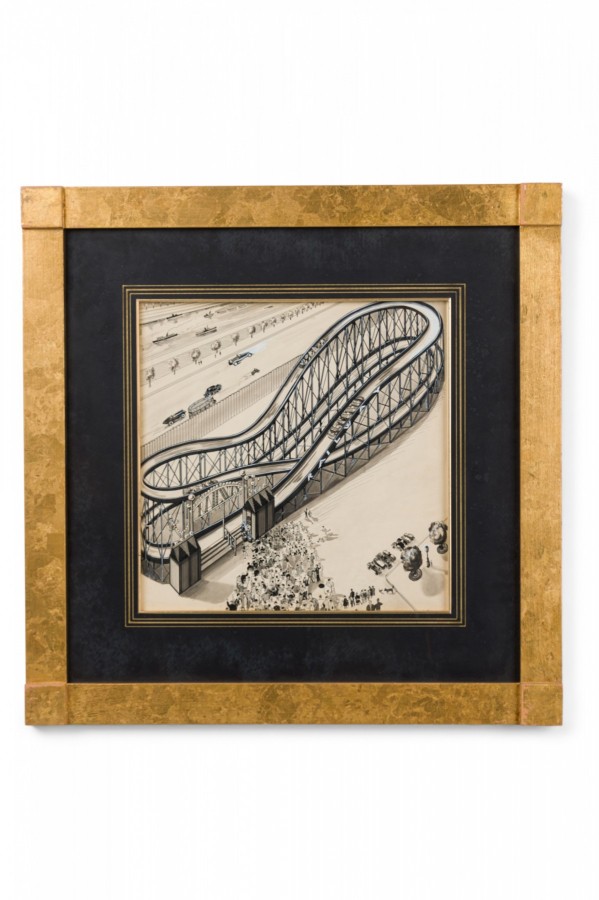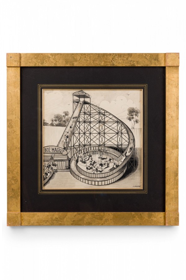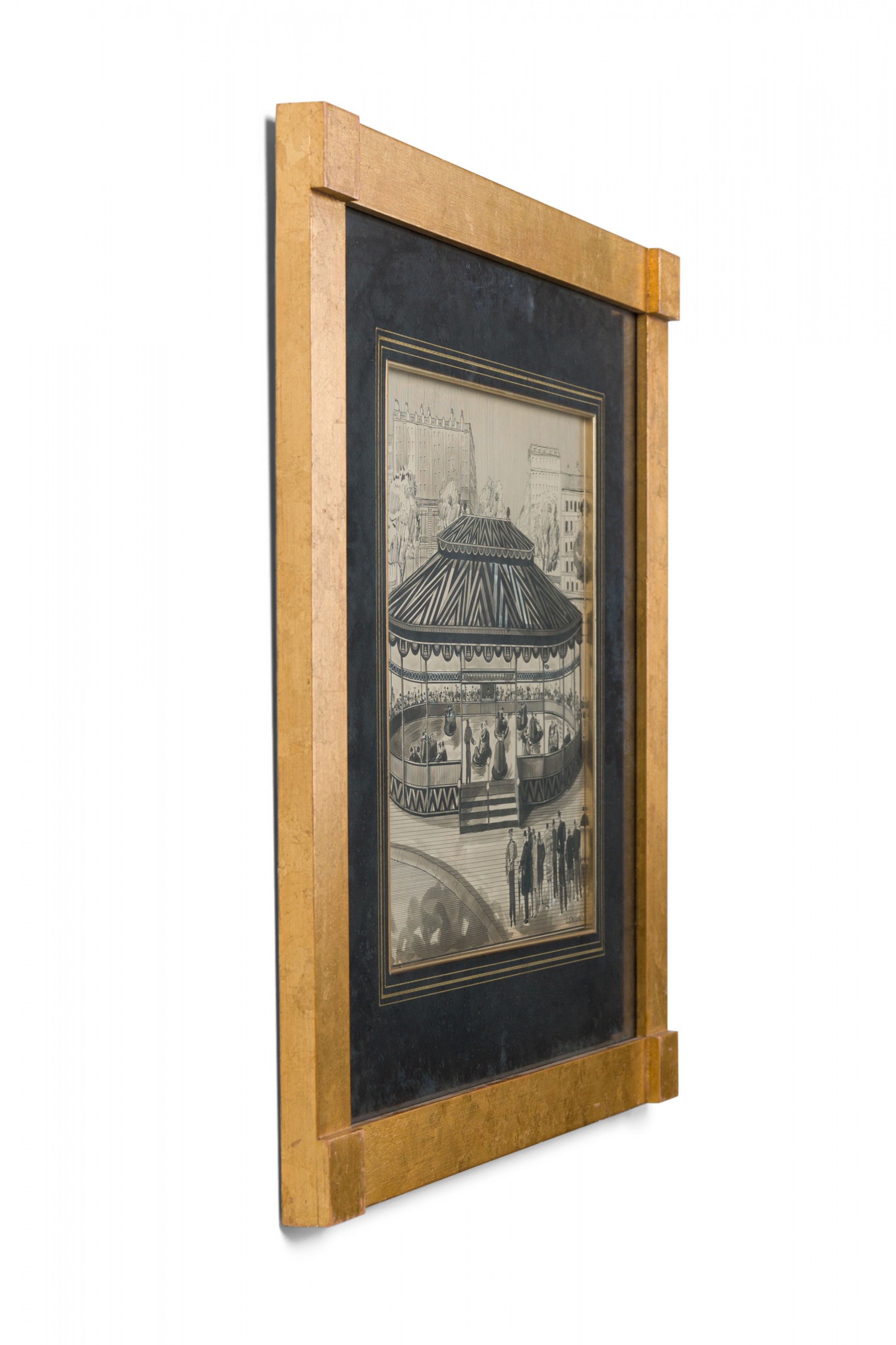 American Art Deco pen and ink drawing of urban amusement park scene with a black matting and gilt square frame (L. Chupin)(Companion pieces: BRA012A, BRA012C, BRA012D, BRA012E, BRA012F).