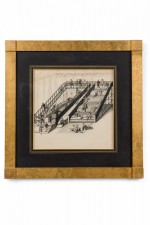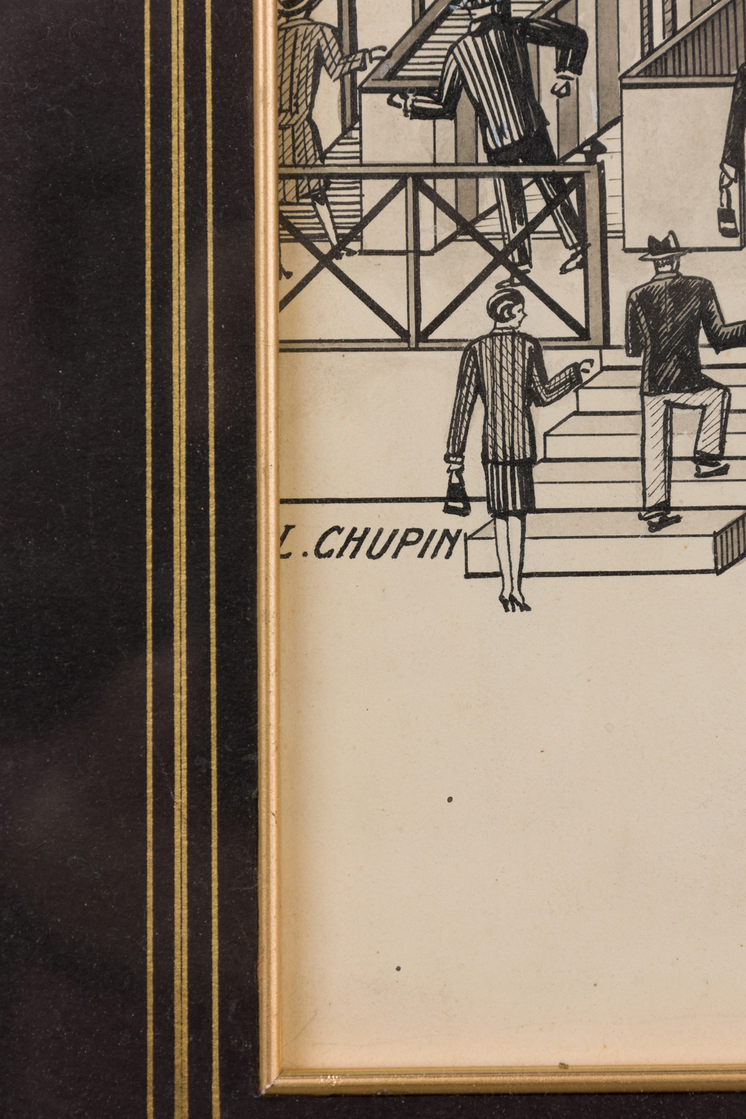 American Art Deco pen and ink drawing of urban amusement park scene with a black matting and gilt square frame (L. Chupin)(Companion pieces: BRA012A, BRA012B, BRA012D, BRA012E, BRA012F).