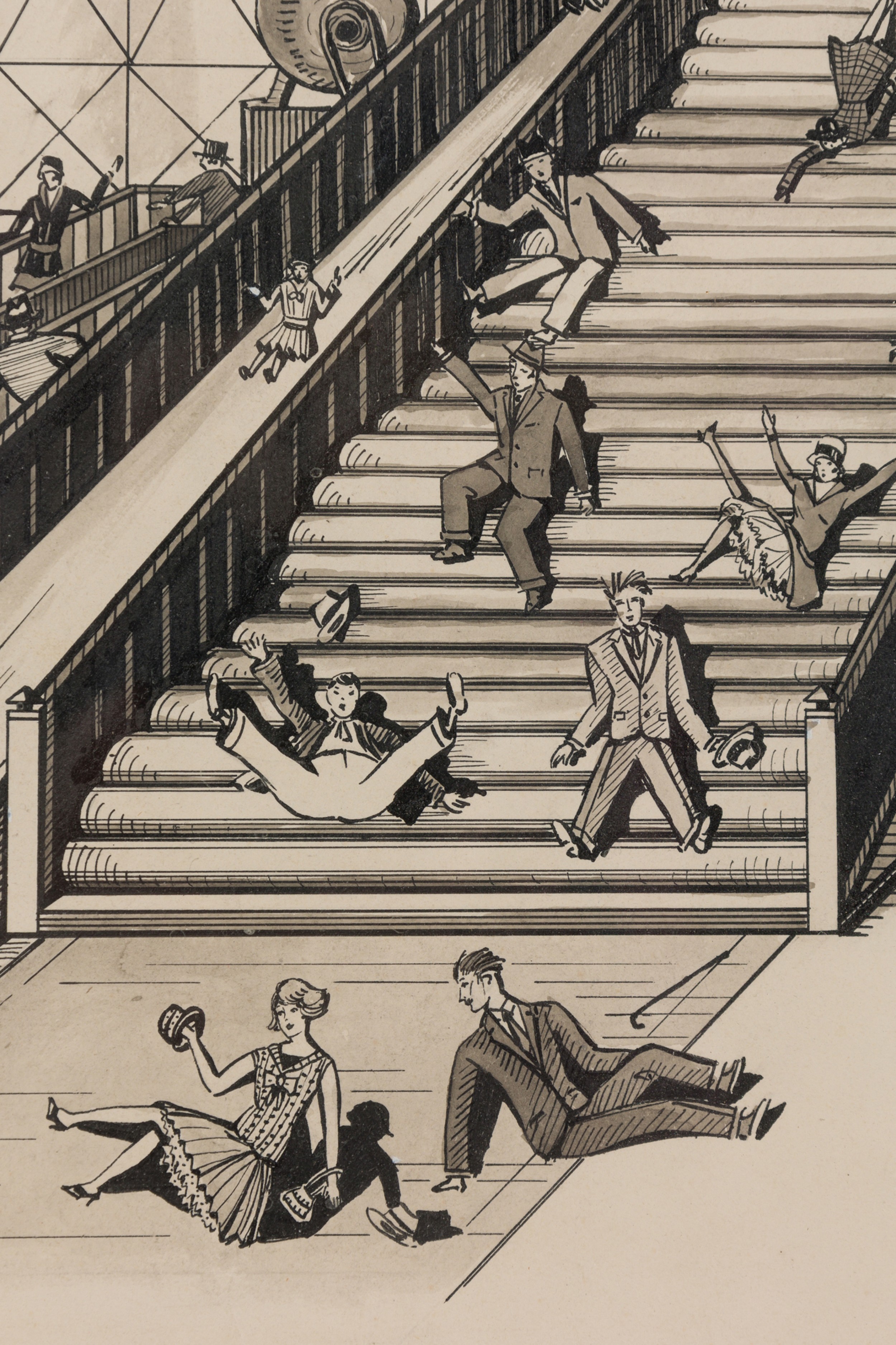 American Art Deco pen and ink drawing of urban amusement park scene with a black matting and gilt square frame (L. Chupin)(Companion pieces: BRA012A, BRA012B, BRA012D, BRA012E, BRA012F)