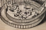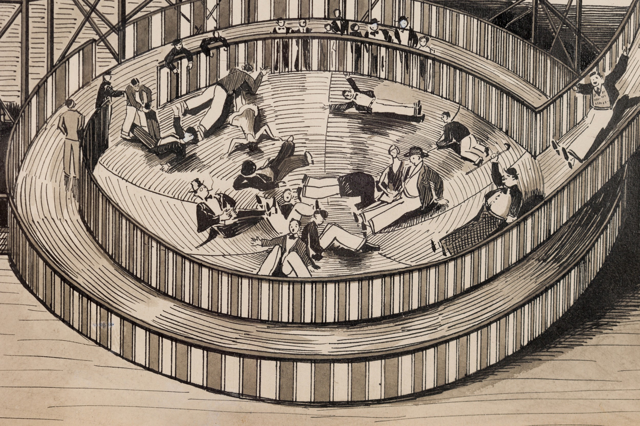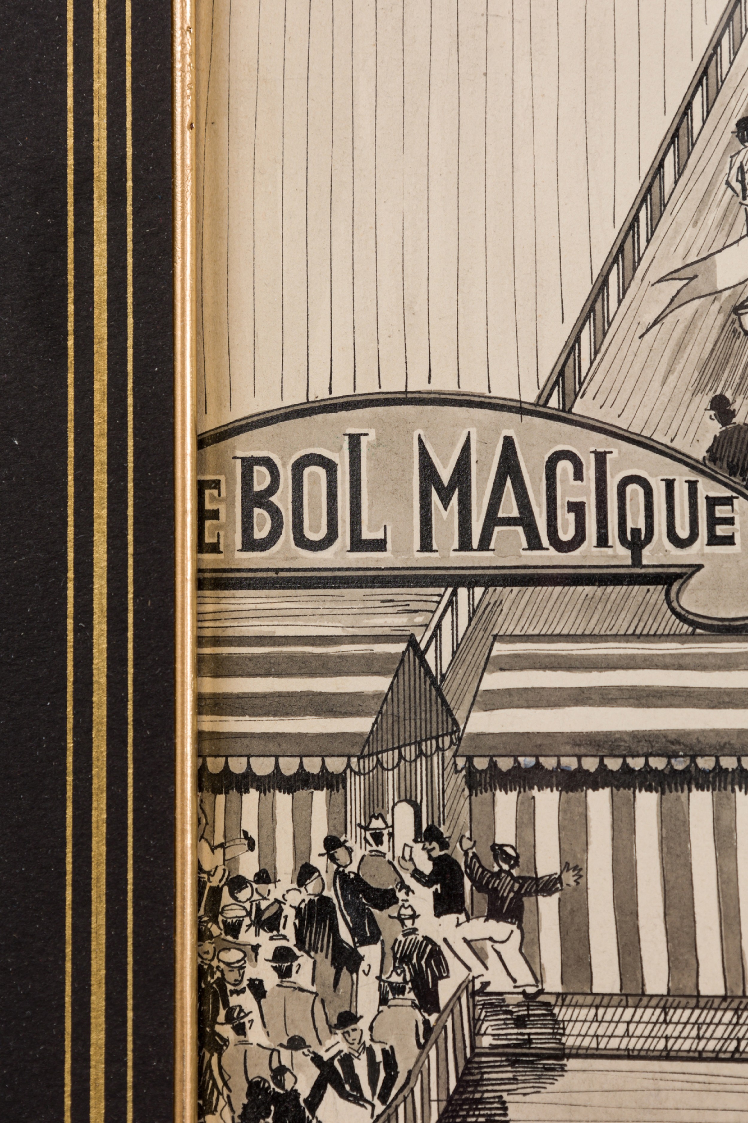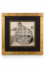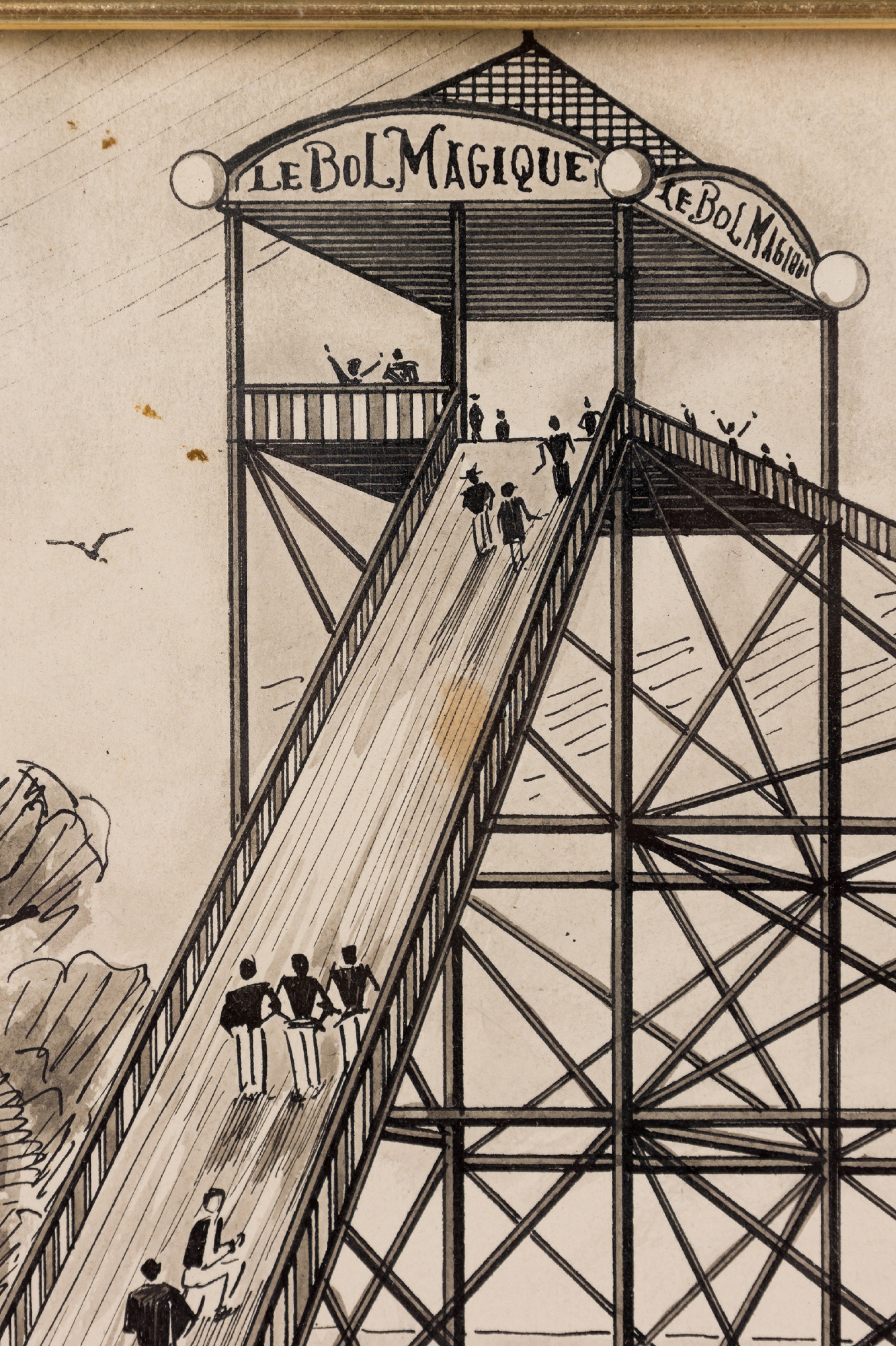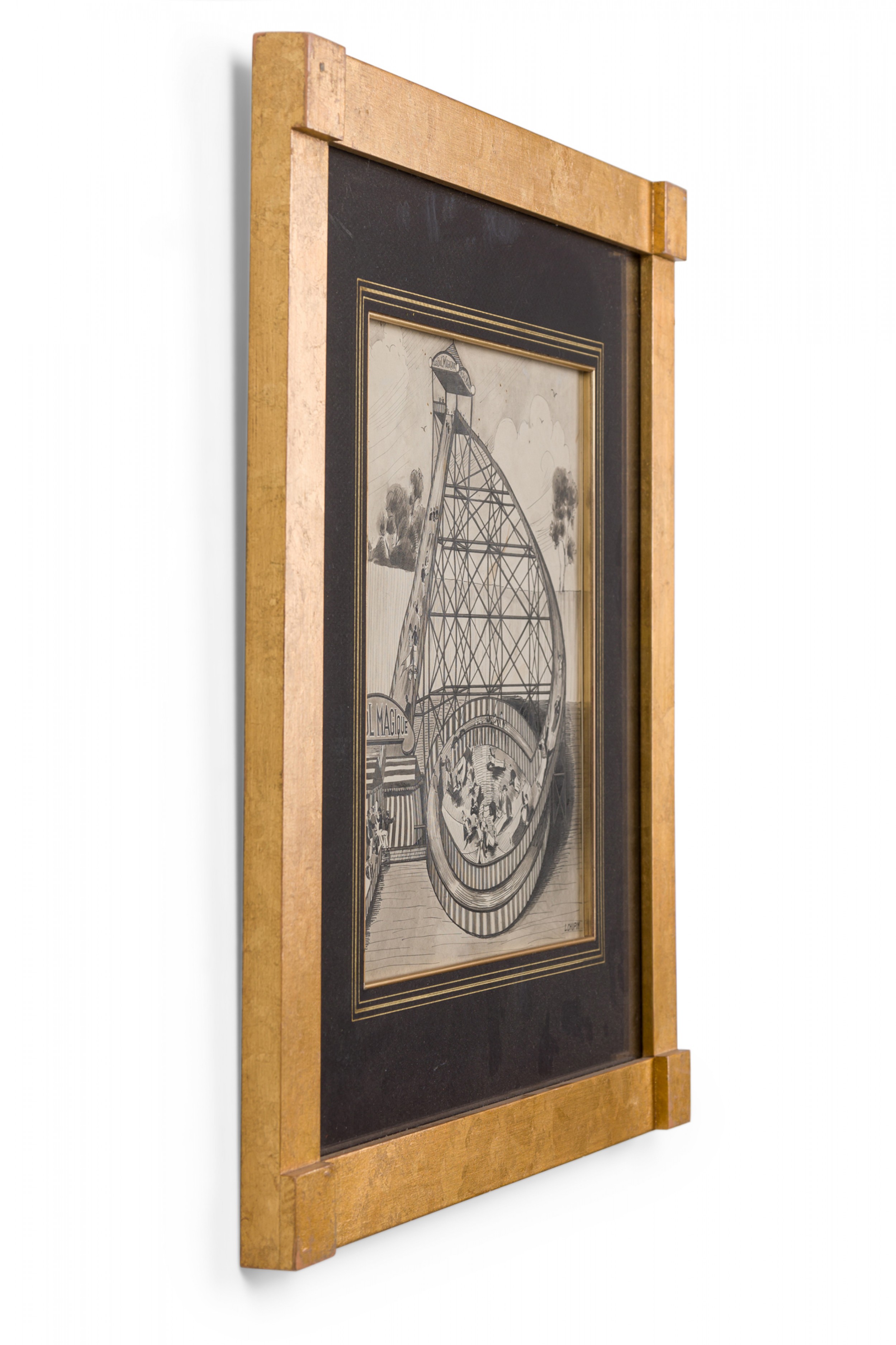 American Art Deco pen and ink drawing of urban amusement park scene with a black matting and gilt square frame (L. Chupin)(Companion pieces: BRA012A, BRA012B, BRA012C, BRA012D, BRA012E)