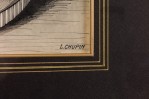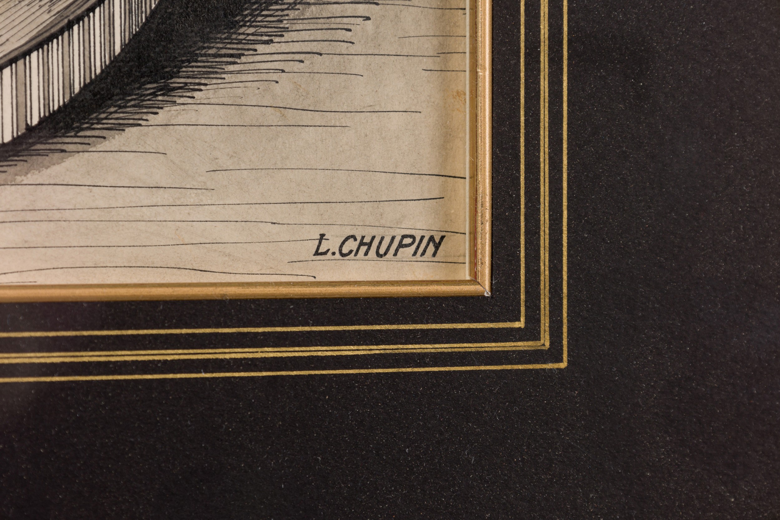 American Art Deco pen and ink drawing of urban amusement park scene with a black matting and gilt square frame (L. Chupin)(Companion pieces: BRA012A, BRA012B, BRA012C, BRA012D, BRA012E).