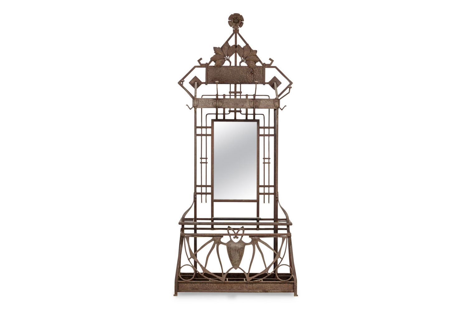 French Art Deco (possibly Austrian) iron hatrack/umbrella stand with a shelf and a filigree "bat" design base with a pediment of a sunflower centering 2 clusters of leaves..