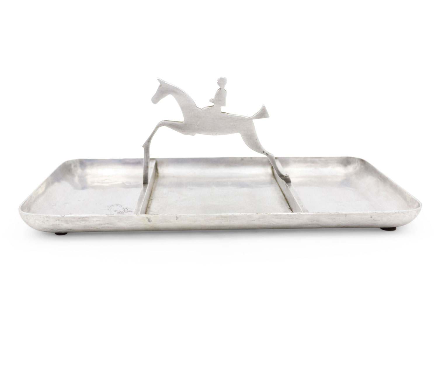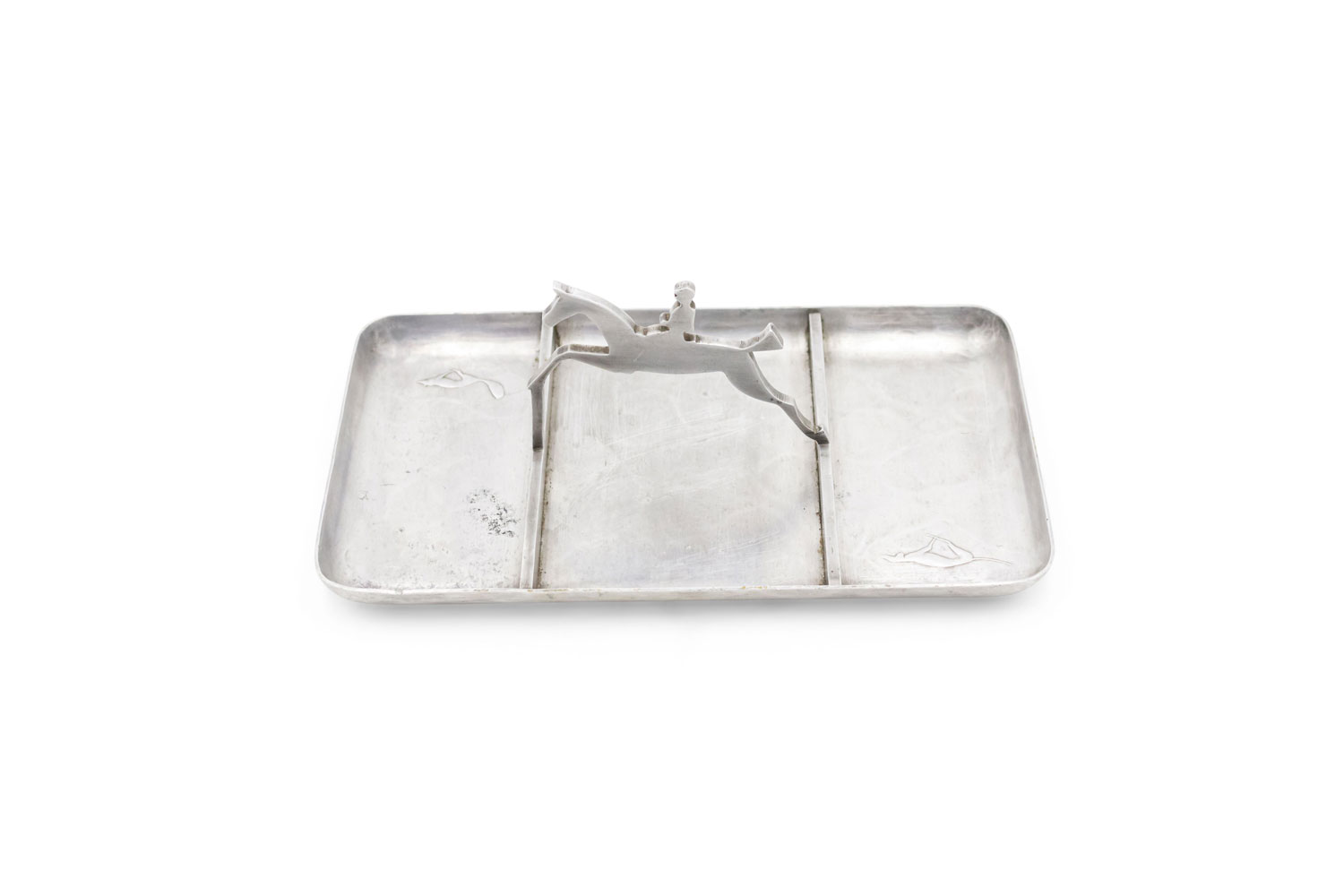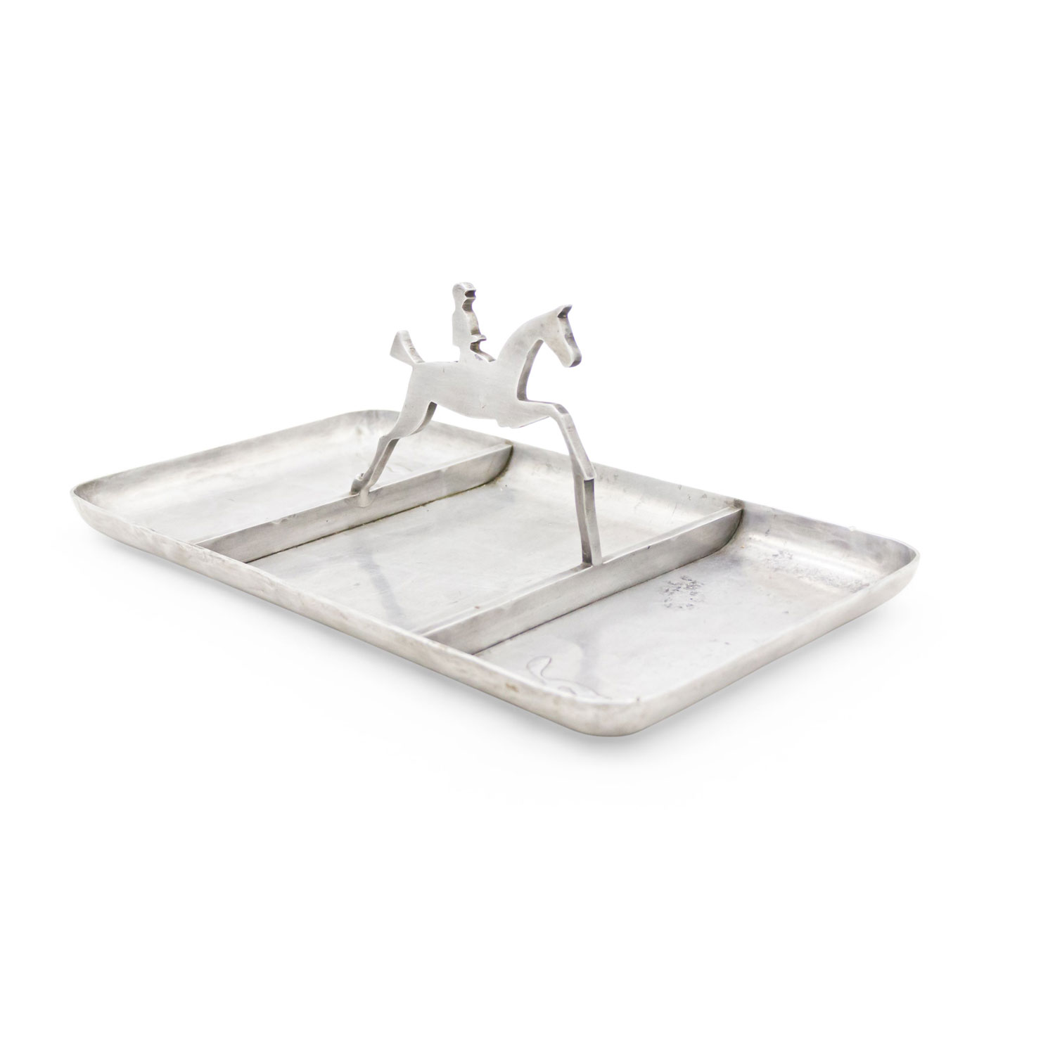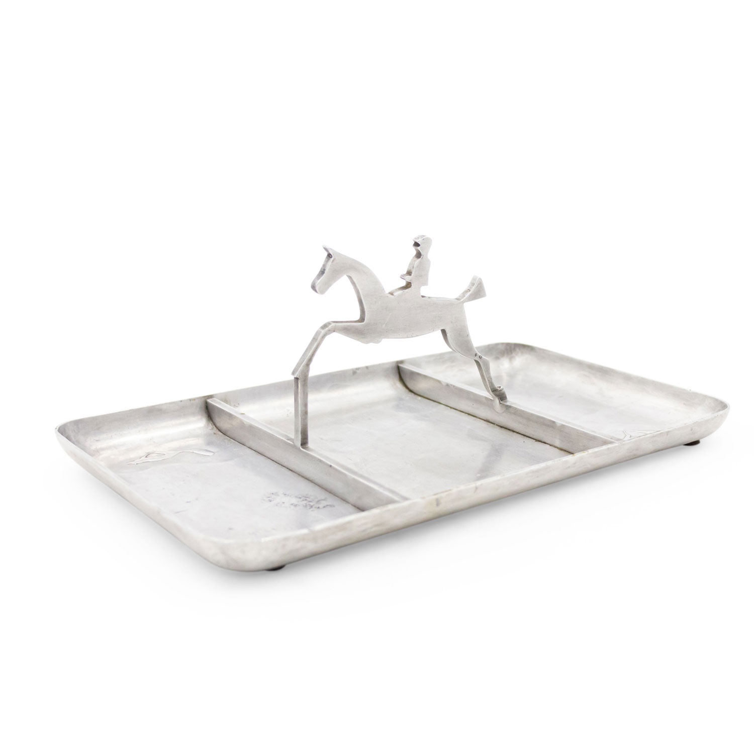 American Art Deco pewter rectangular three section ashtray with horse and rider handle..