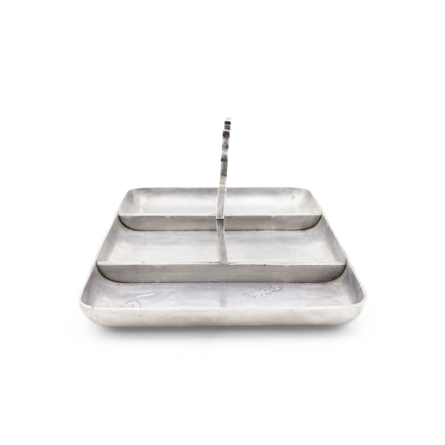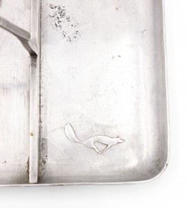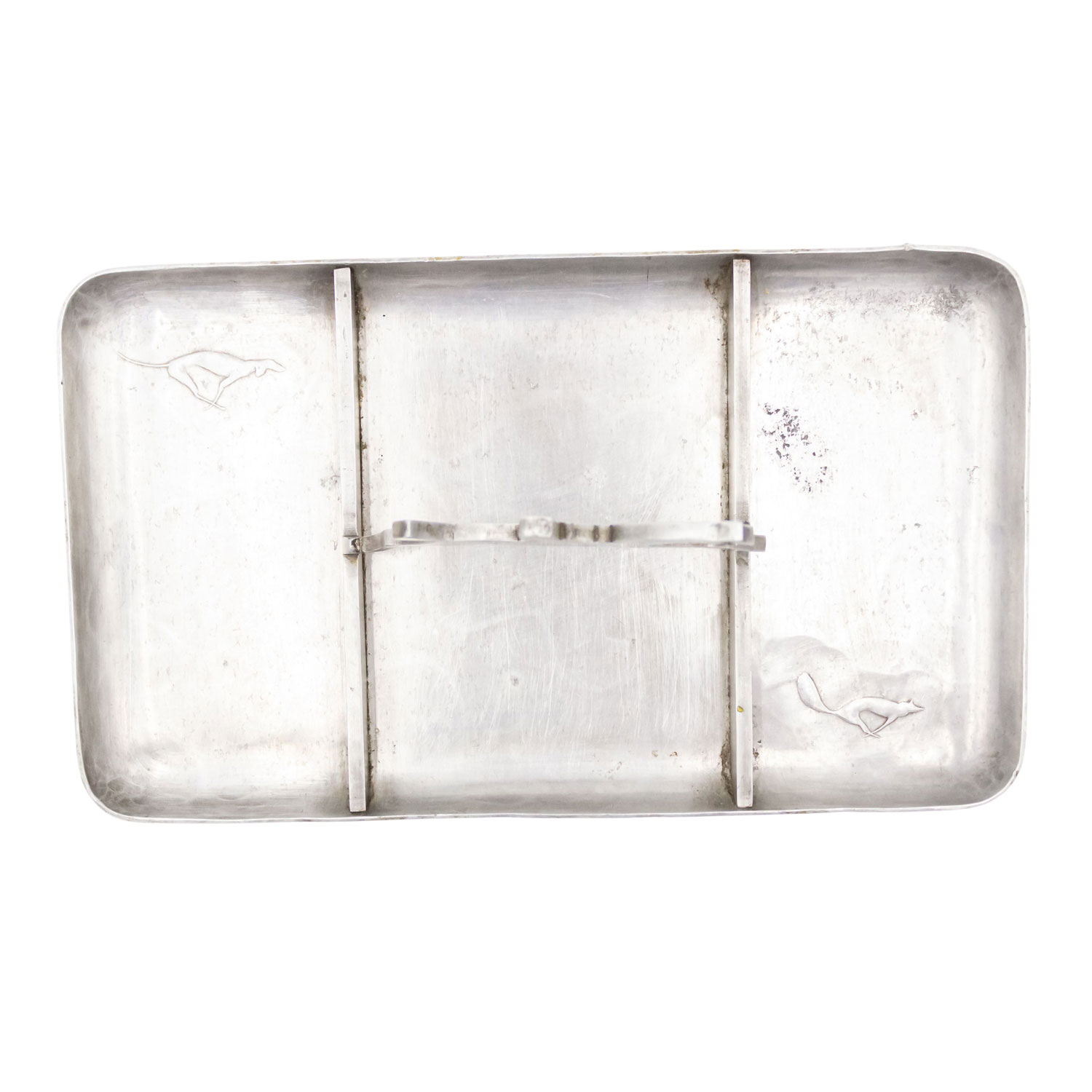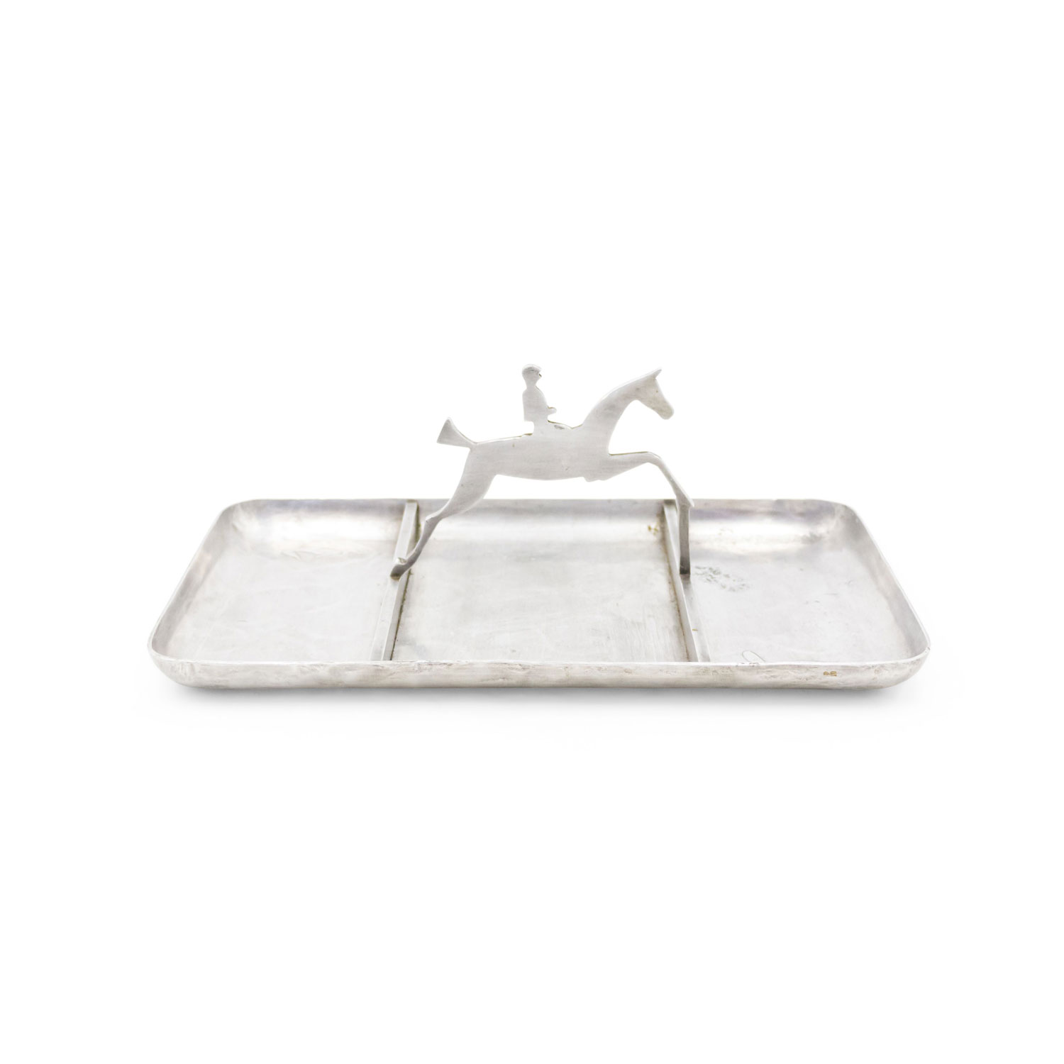 American Art Deco pewter rectangular three section ashtray with horse and rider handle..