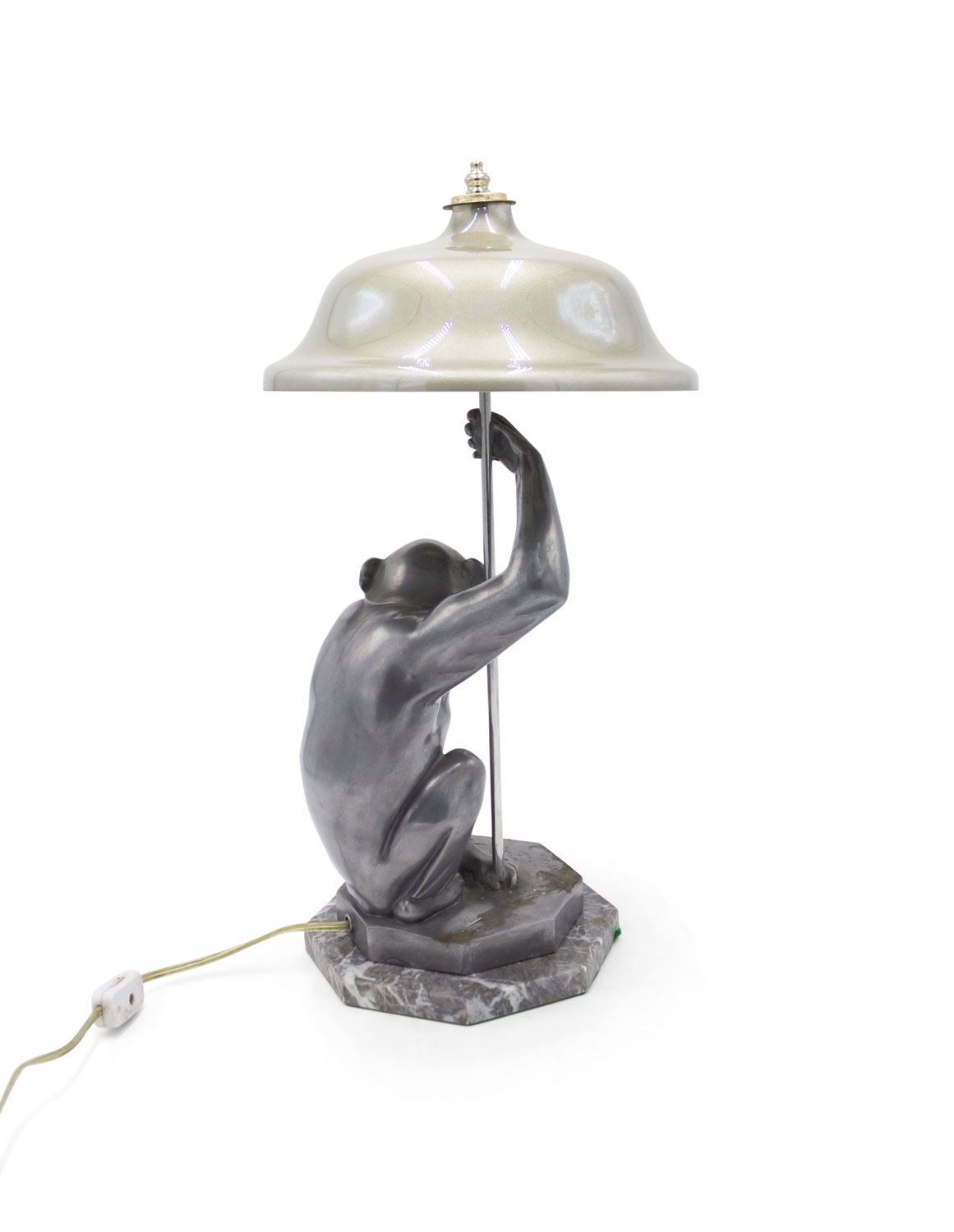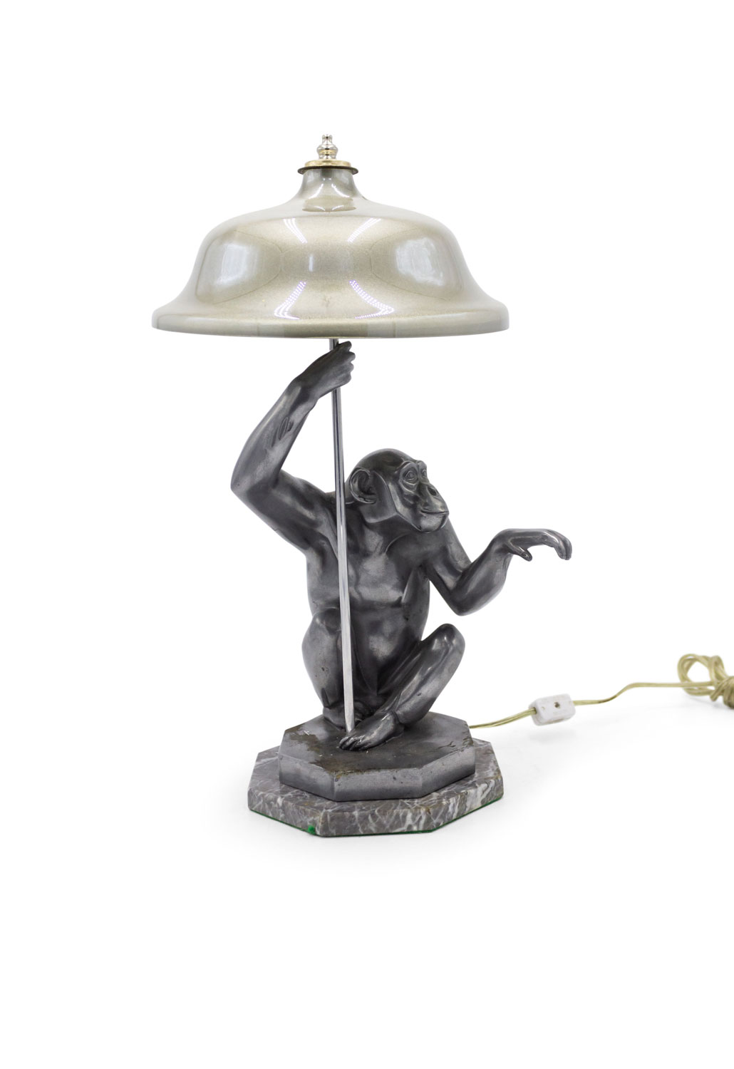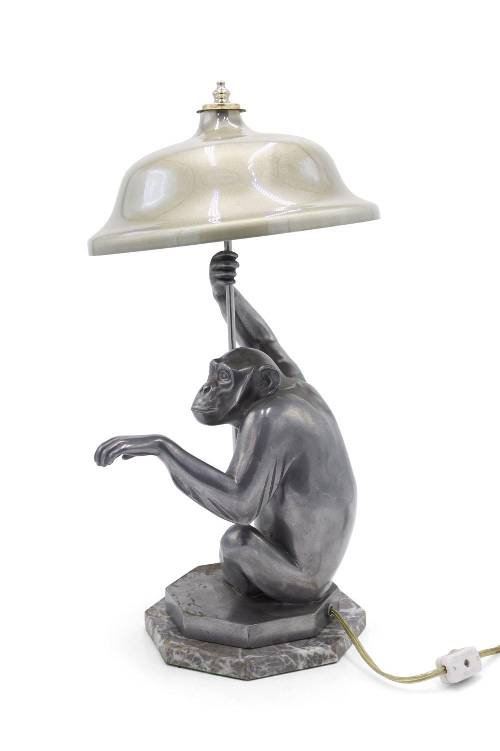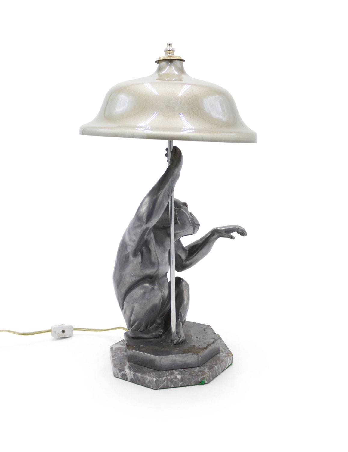 Art Deco style pewter table lamp of seated monkey on octagonal marble base.