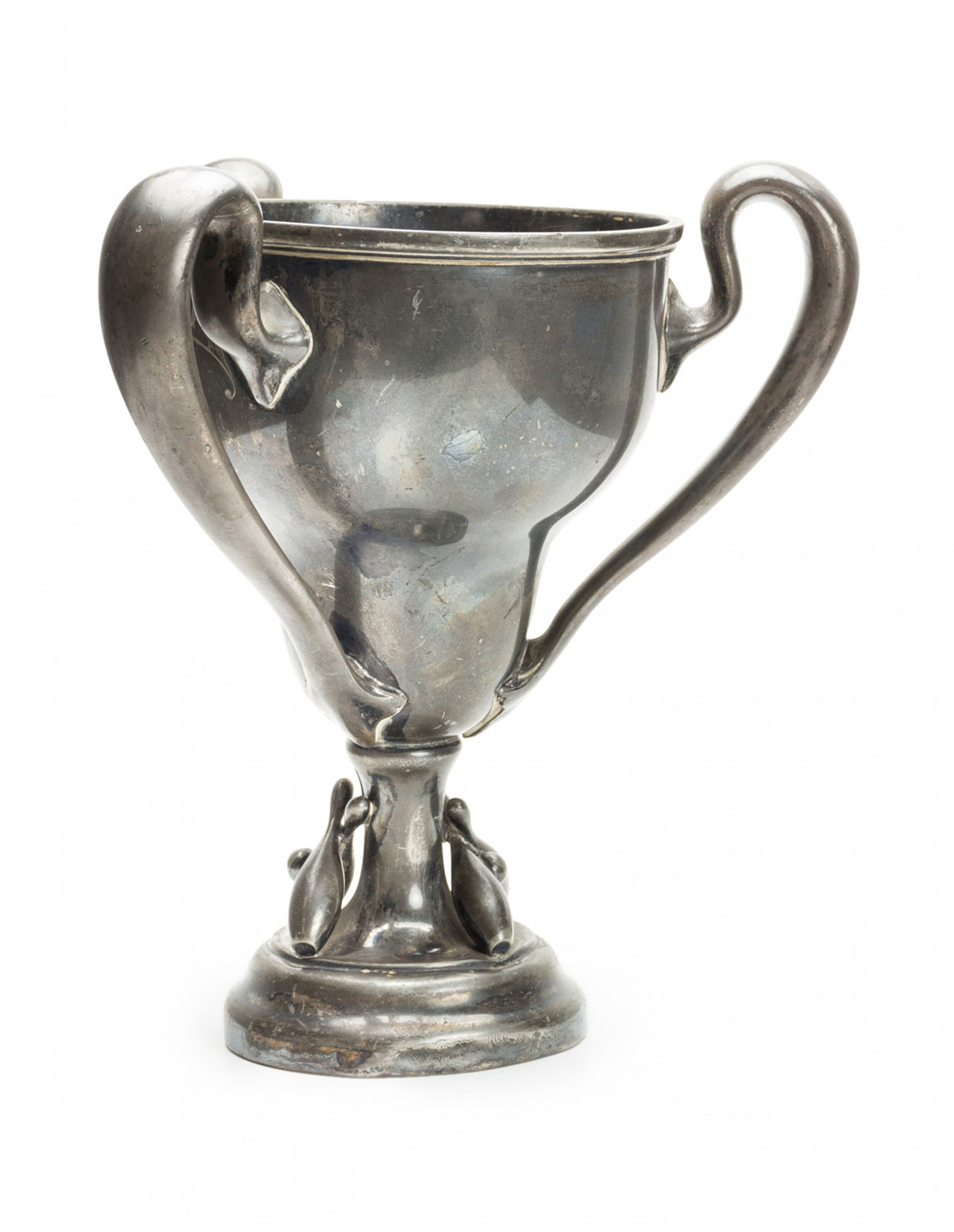 Art Deco silver plate trophy with 3 handles and bowling pins at base..