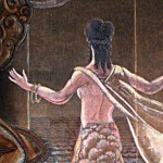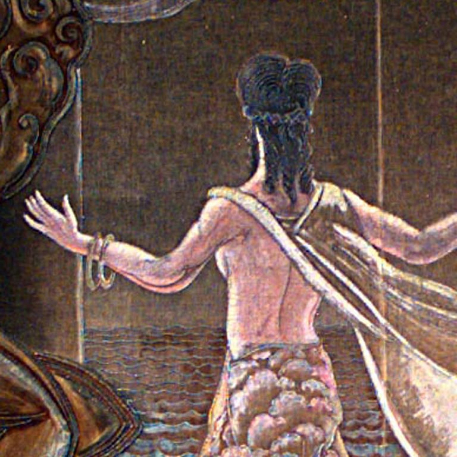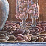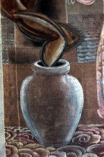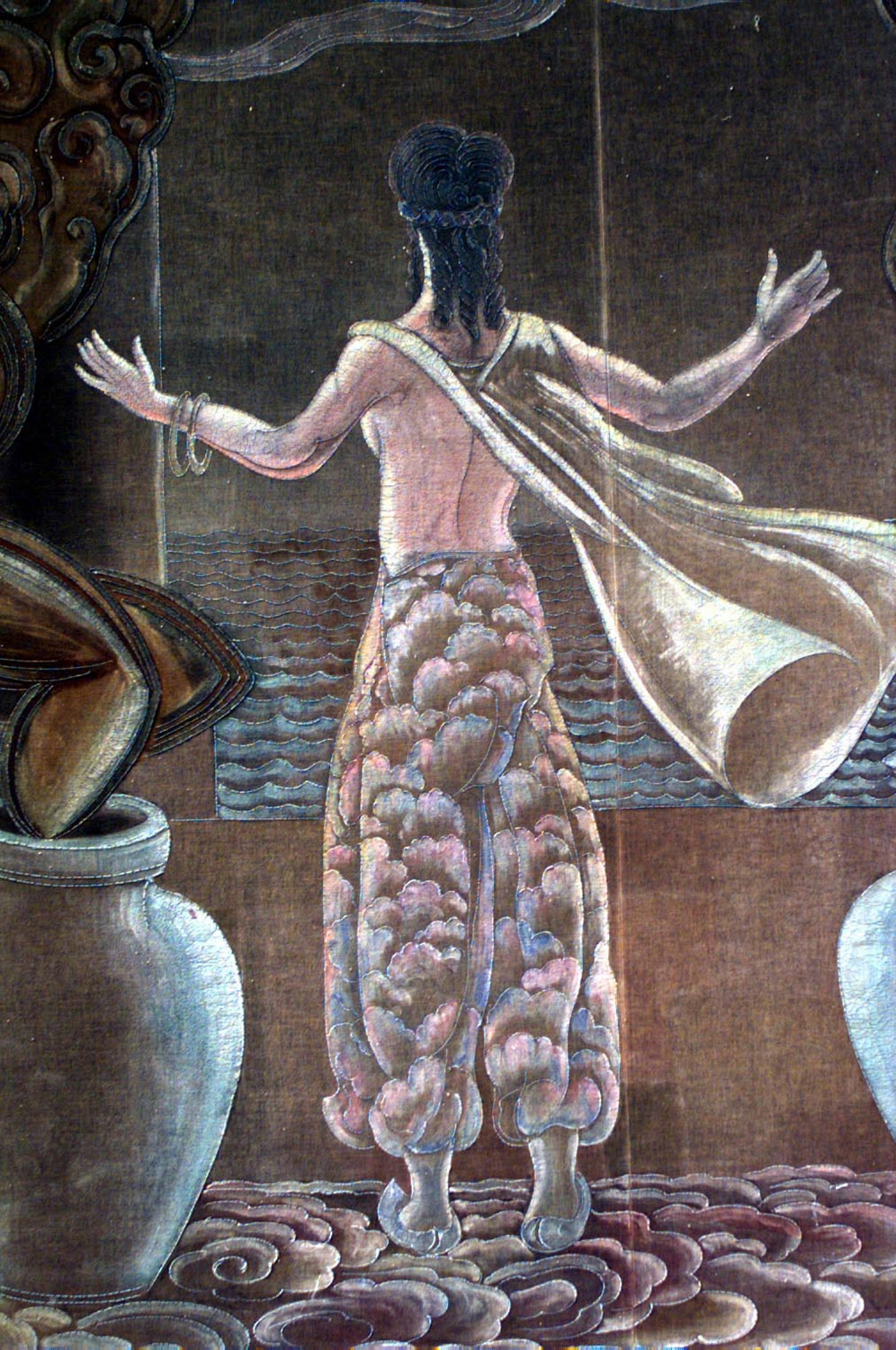 American Art Deco (1928) vertical painted velvet wall hanging of Persian lady with 2 urns (attributed to GRANT SIMON).