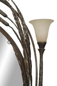 French Art Deco wrought iron cheval mirror with arch design, beveled glass, and cattails and side column ornaments with art glass shades on a floral and scroll design base. (attributed to PAUL KISS)