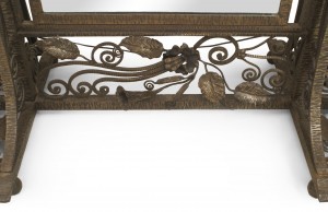 French Art Deco wrought iron cheval mirror with arch design, beveled glass, and cattails and side column ornaments with art glass shades on a floral and scroll design base. (attributed to PAUL KISS).