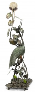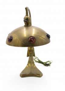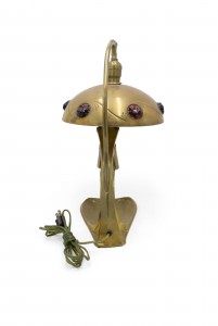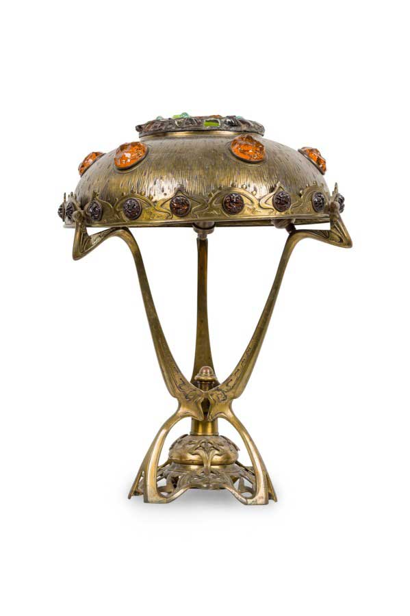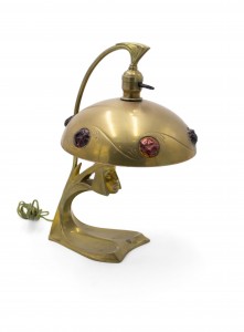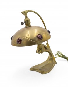 Art Nouveau brass table lamp with head at base and stone inserts on shade.