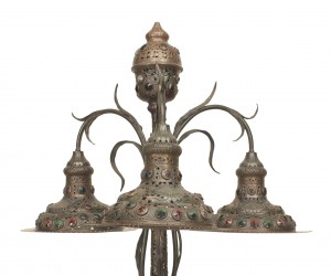 Art Nouveau (possibly Hungarian) floor lamp with a dark green patina metal and a floral and vine filigree design. Inset glass jewels and supporting 3 round hanging shades.