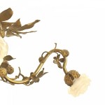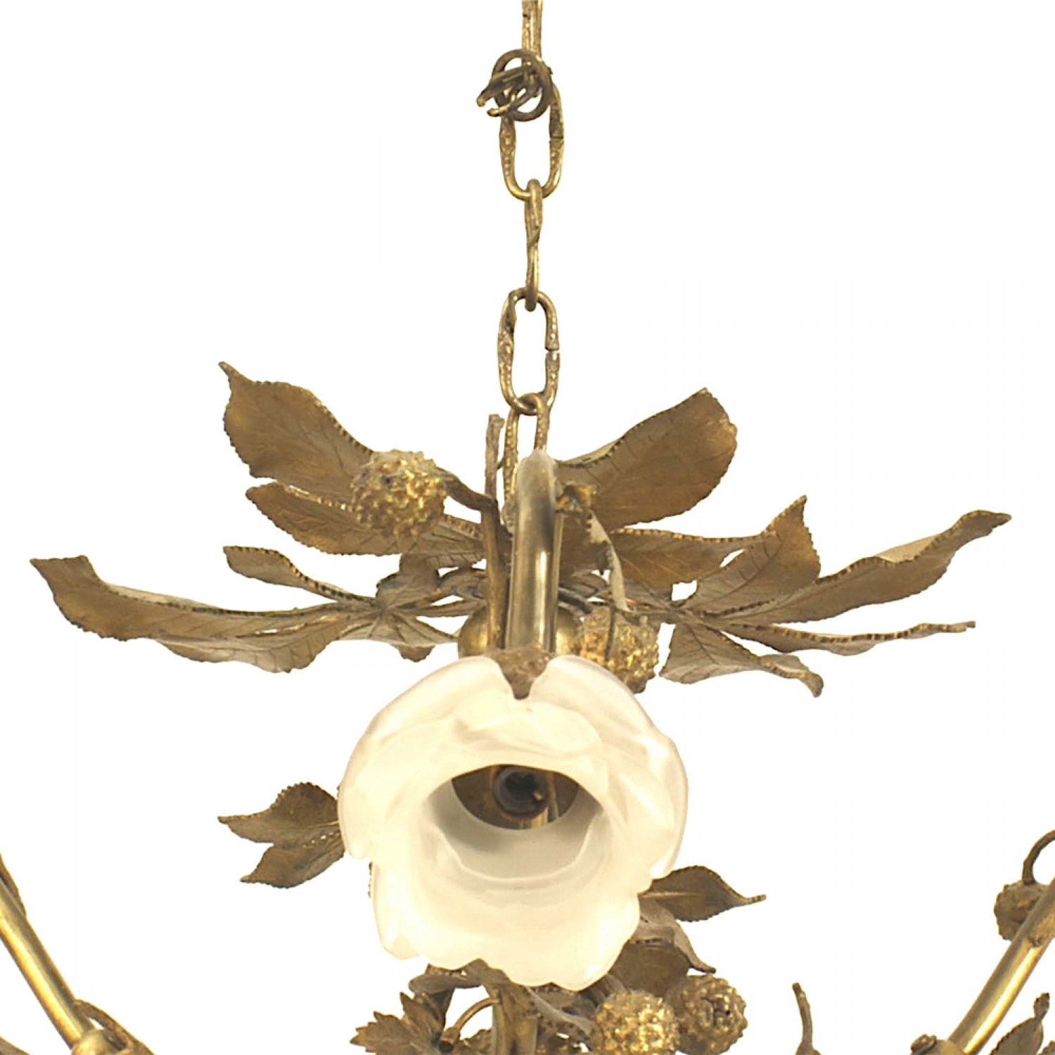 Art Nouveau-style gilt metal rustic style chandelier with 3 arms having design of leaves and berries with 3 frosted glass flower shades..