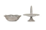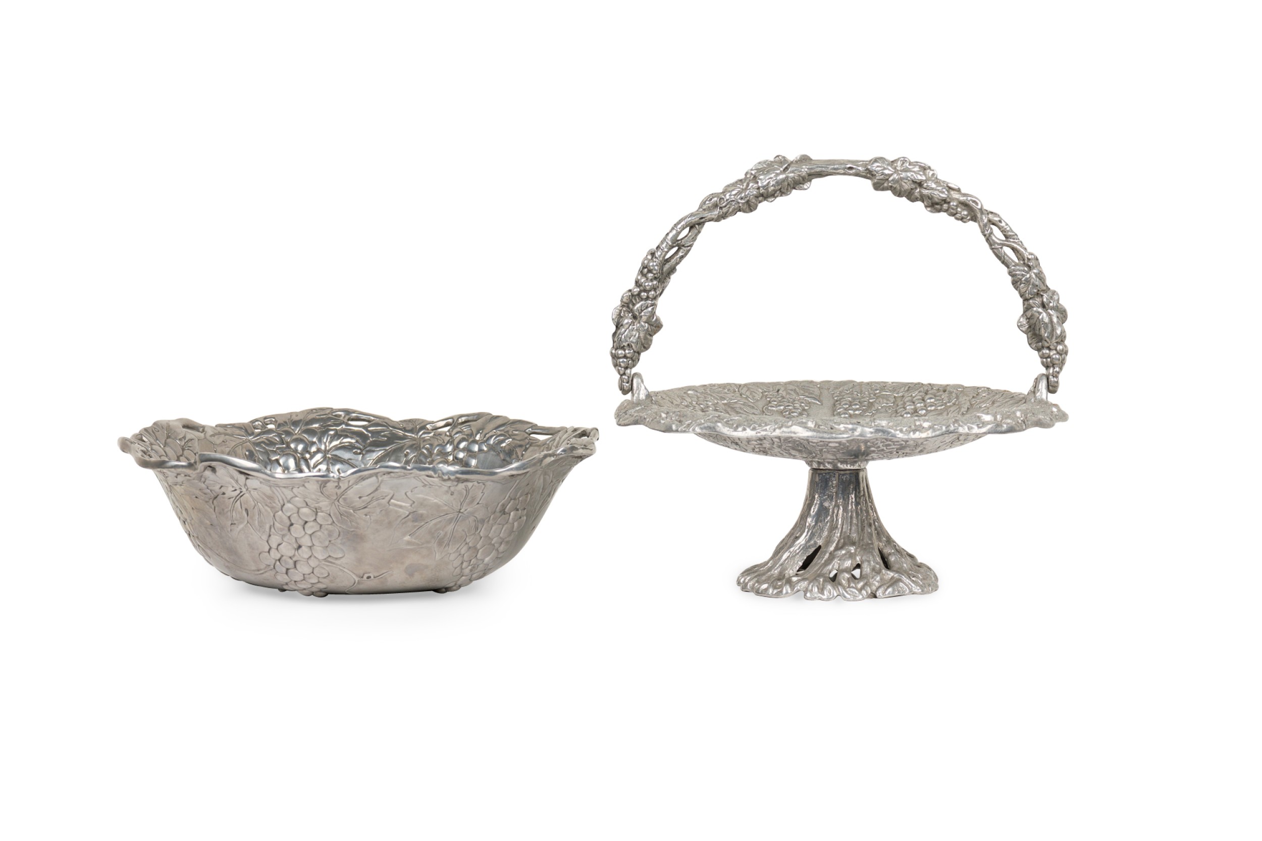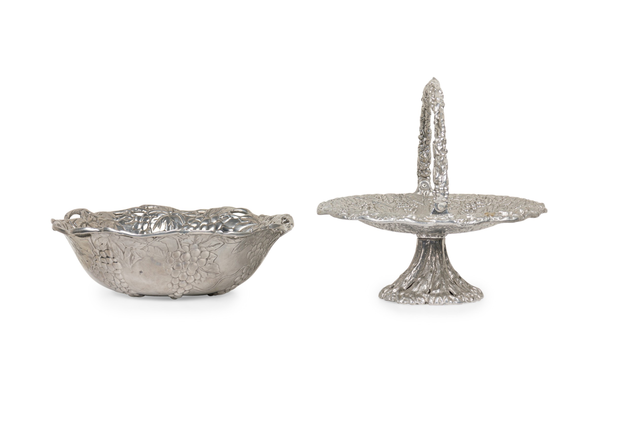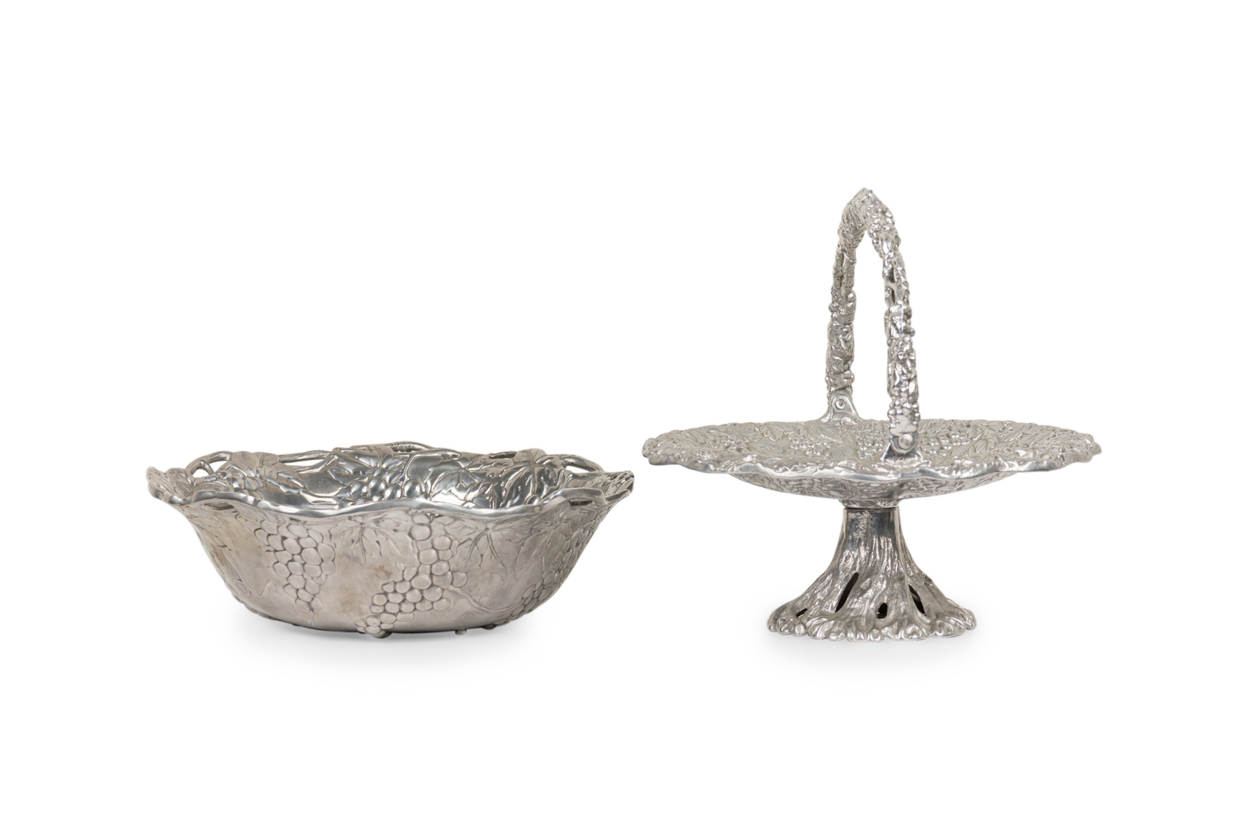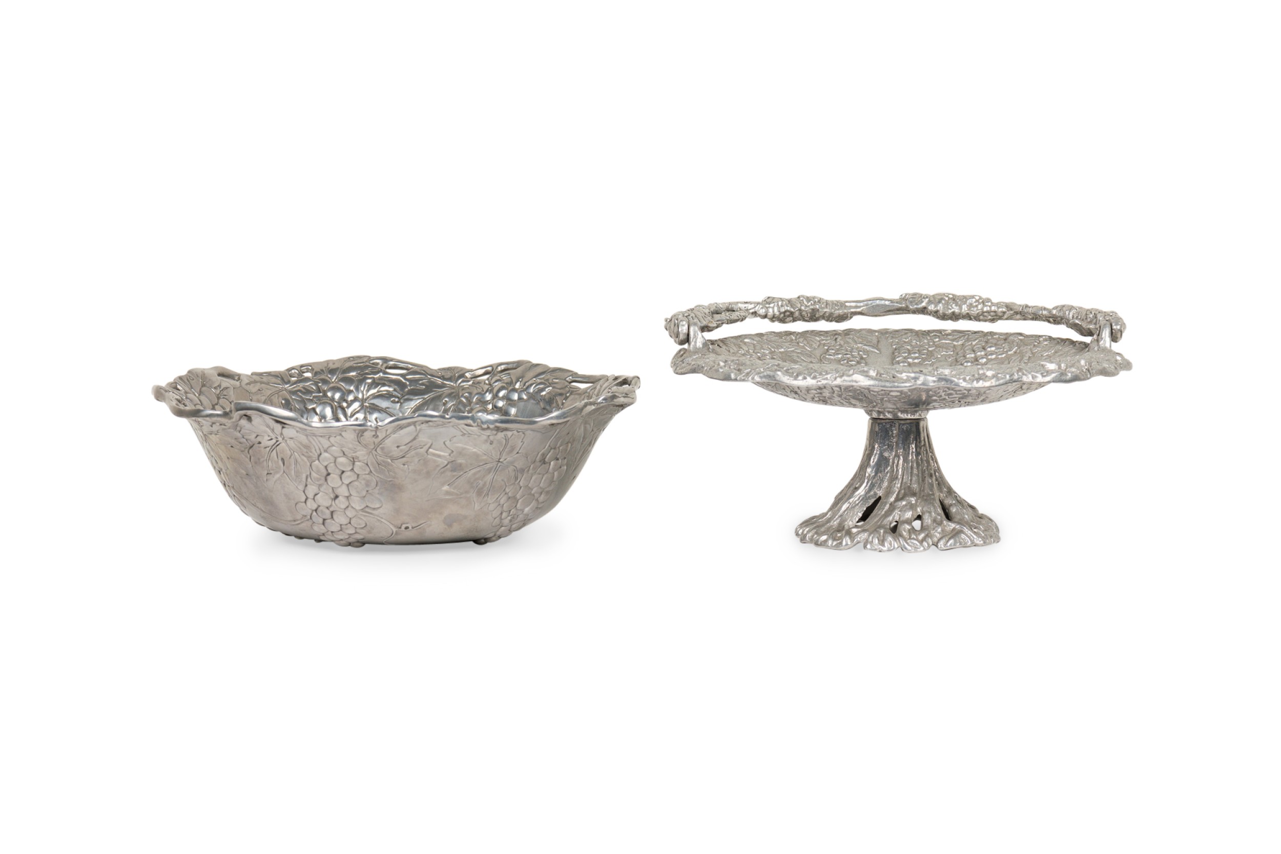 2-Piece Vintage American Victorian style aluminum bowl / compote and pedestal bases cake stand set featuring a grape and vine design all around the rim of each with the cake stand base having a handle (ARTHUR COURT)