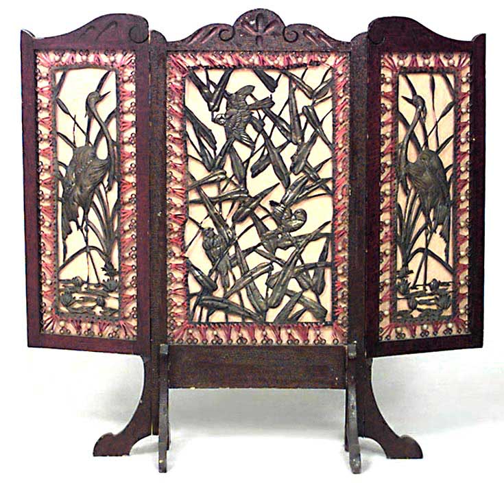 English Arts and Crafts stained mahogany 3 fold fire screen with brass filigree bird and floral design.
