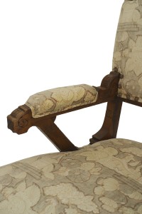 PAIR of English Arts & Crafts (Aesthetic Movement) mahogany Armchairs with finials on back and an "H" form stretcher with upholstered seat and back having nail heads.