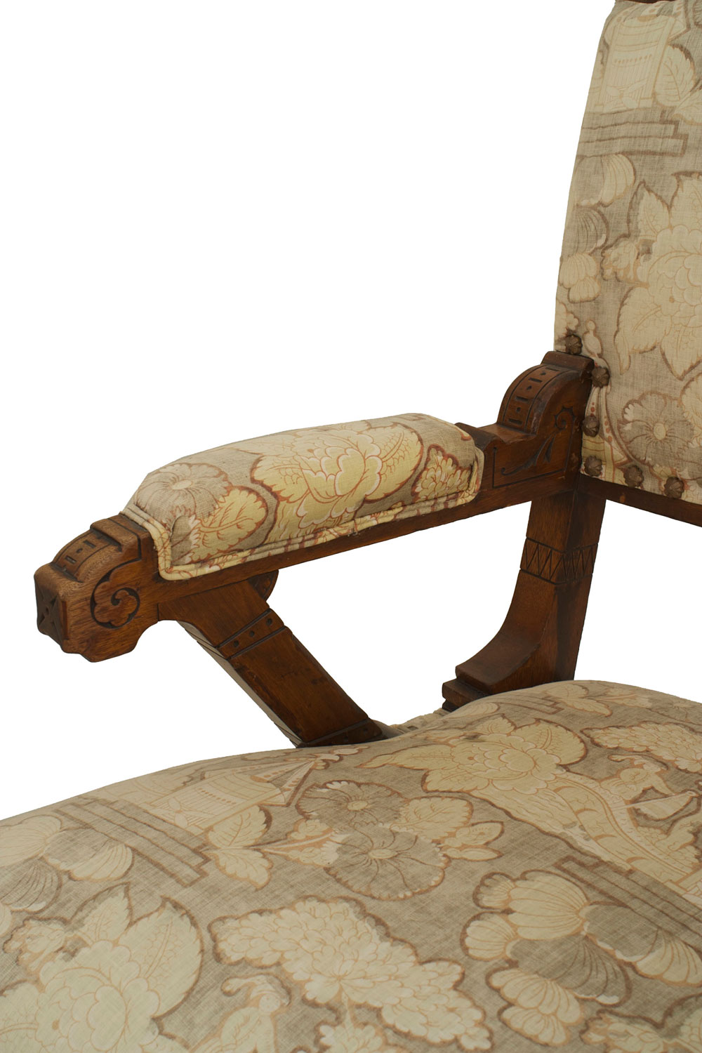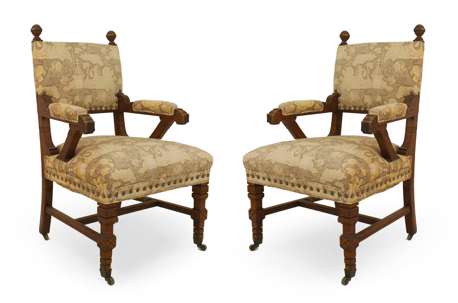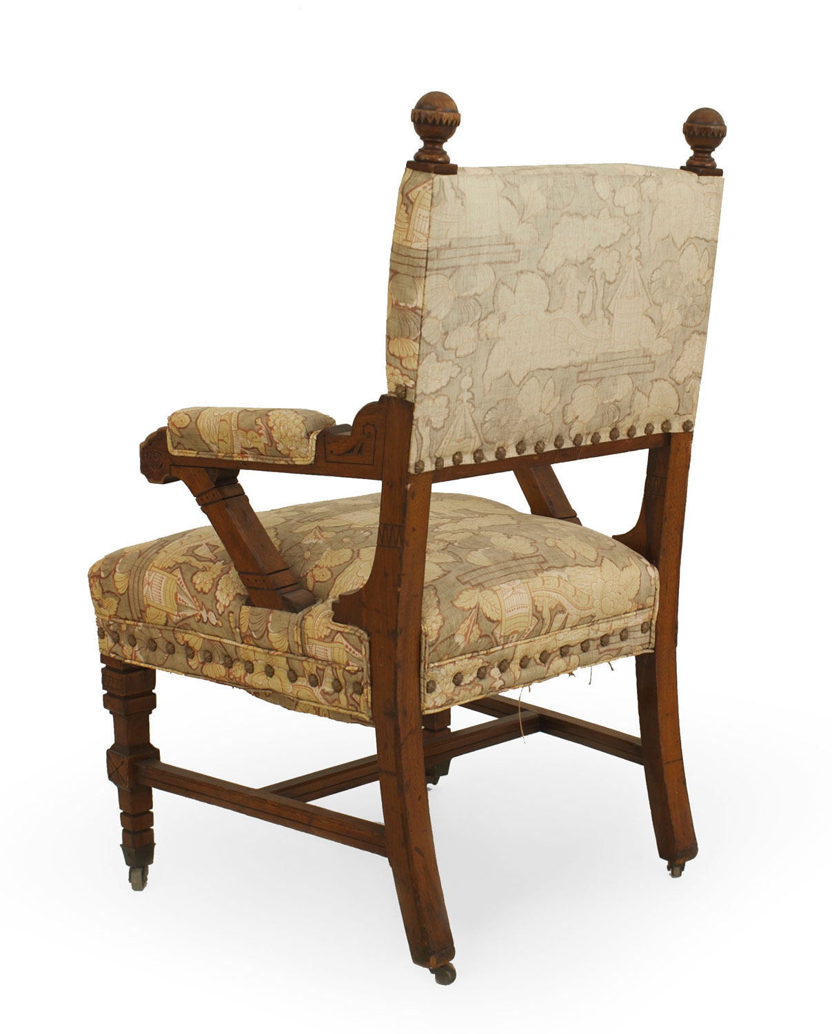 PAIR of English Arts & Crafts (Aesthetic Movement) mahogany Armchairs with finials on back and an "H" form stretcher with upholstered seat and back having nail heads