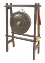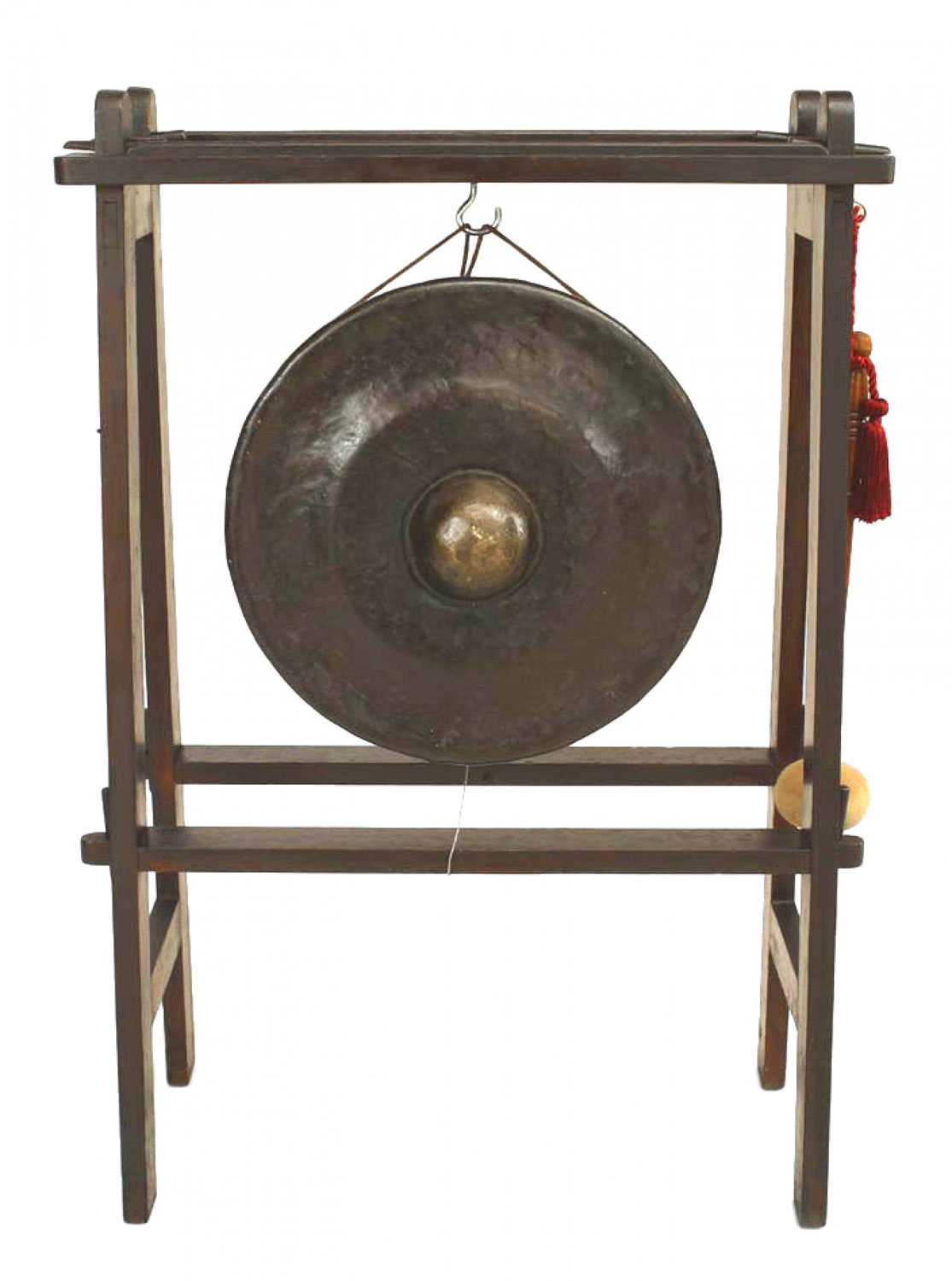 English Art & Crafts stained oak stand supporting an Asian bronze gong with striker.