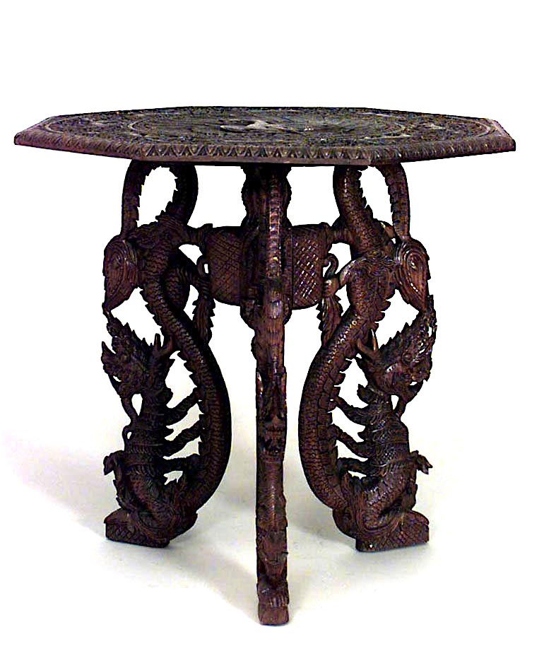Asian Burmese-style (19th Century) carved walnut end/side table with octagonal top and 3 dragon base.