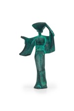 Vintage Asian small metal blue/green patina bronze figure of a dancing women with long arm sleeved kimono and a head adornment.