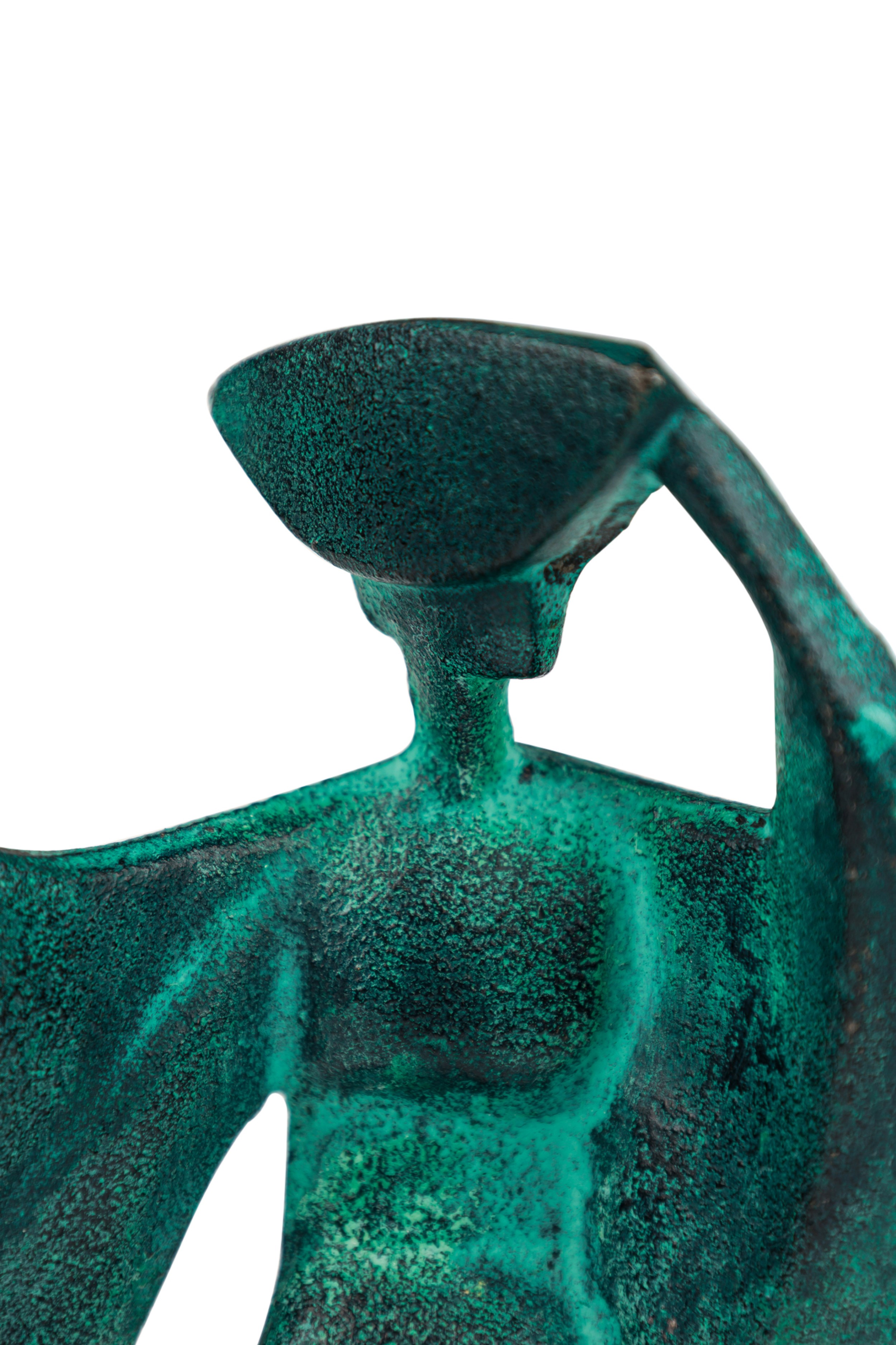 Vintage Asian small metal blue/green patina bronze figure of a dancing women with long arm sleeved kimono and a head adornment