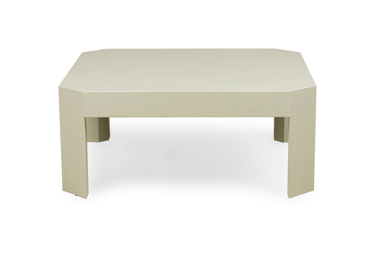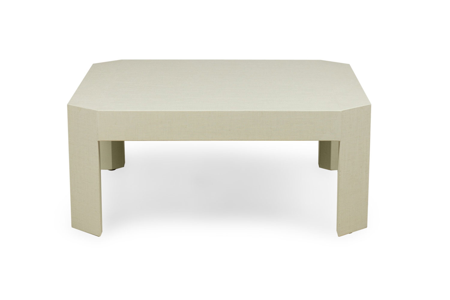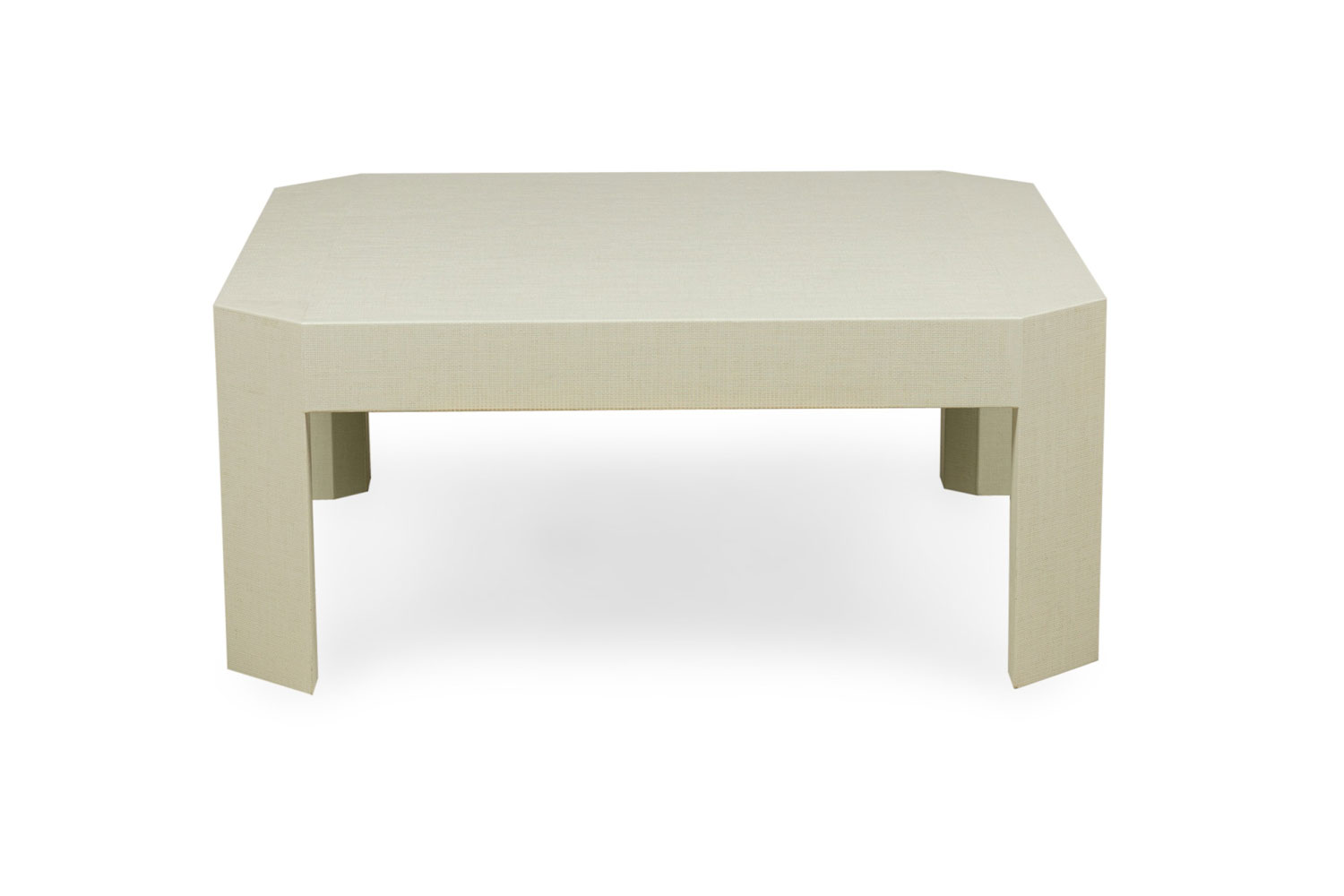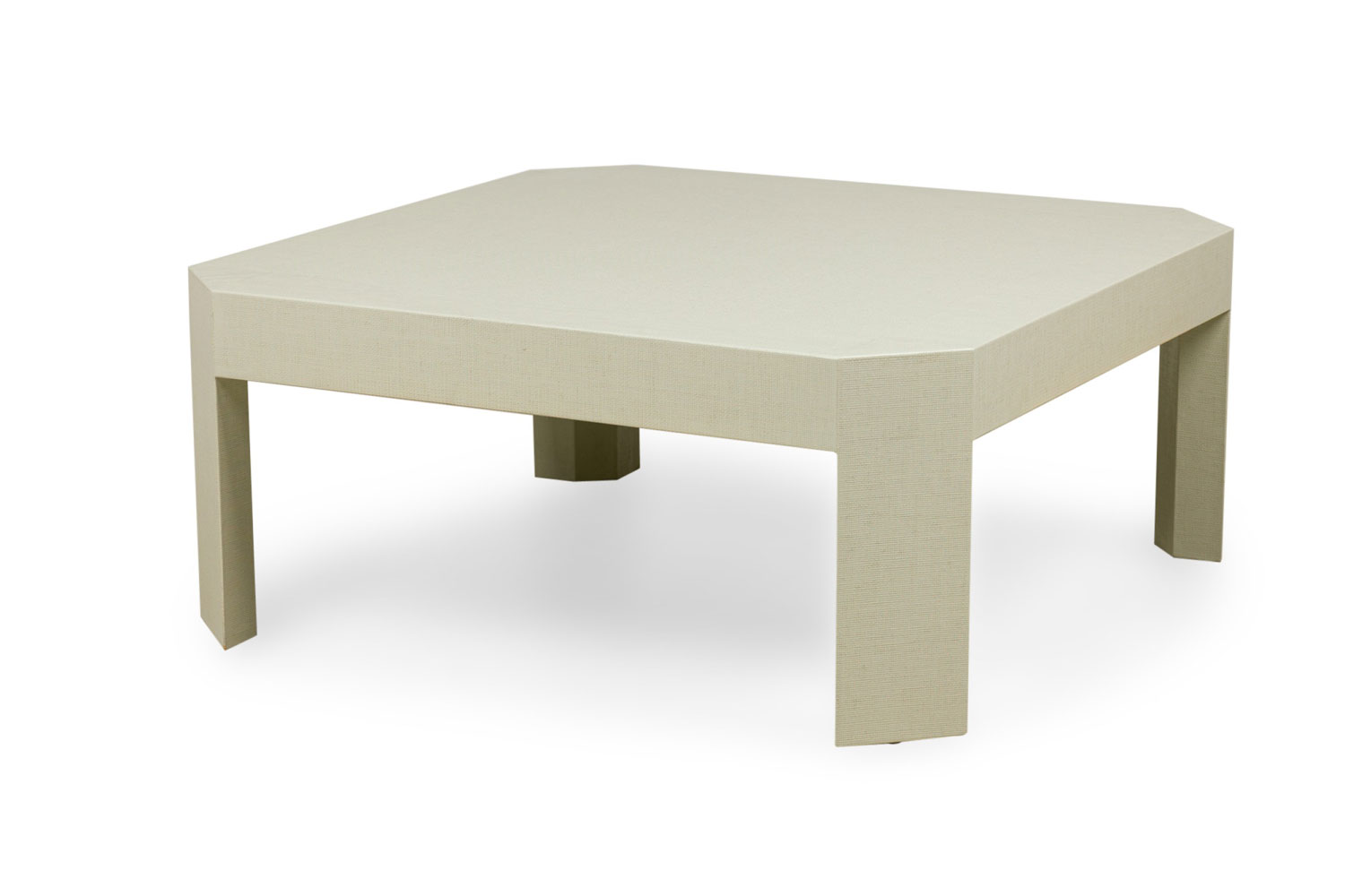 Asian contemporary style light sage colored raffia wrapped square coffee table having diagonal cut corners.
