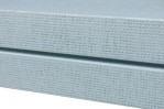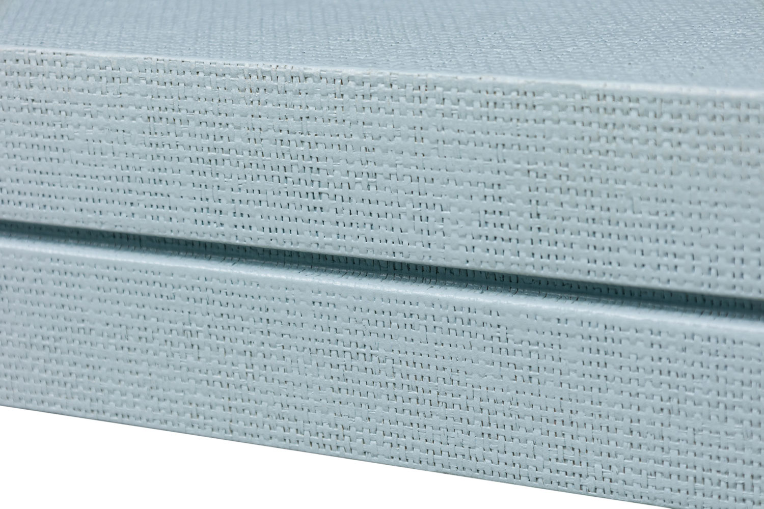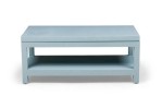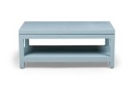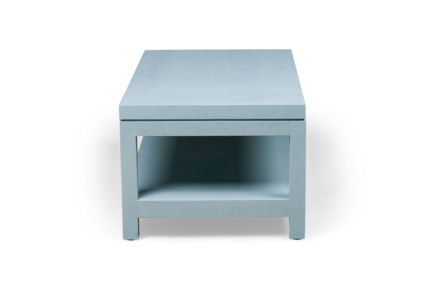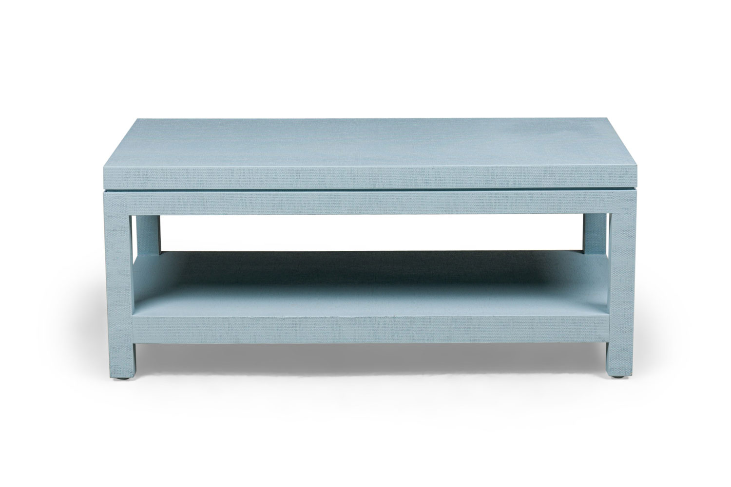 Asian Contemporary Style rectangular sky blue painted raffia wrapped coffee table featuring a low tier shelf and indented design on top apron.