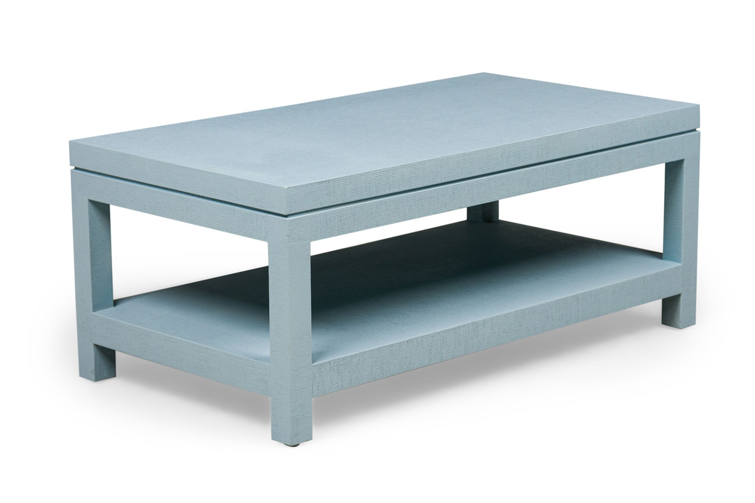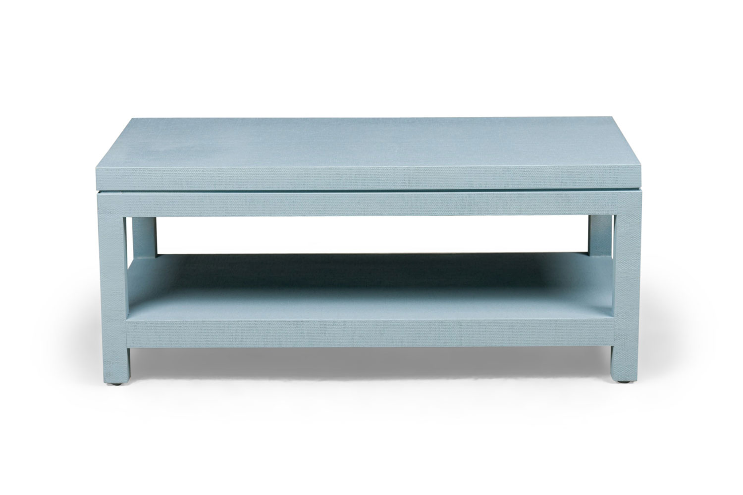 Asian Contemporary Style rectangular sky blue painted raffia wrapped coffee table featuring a low tier shelf and indented design on top apron