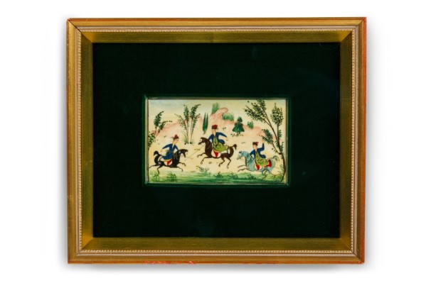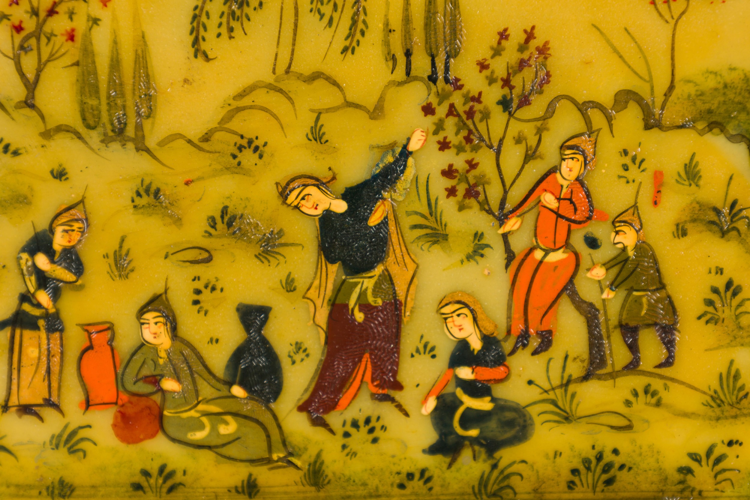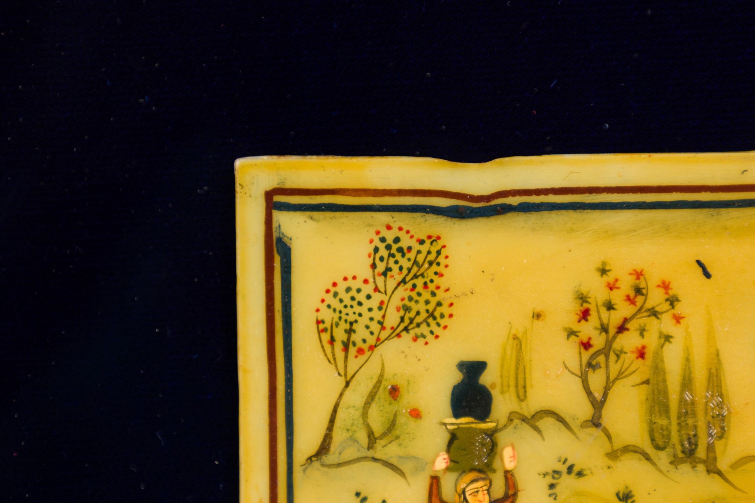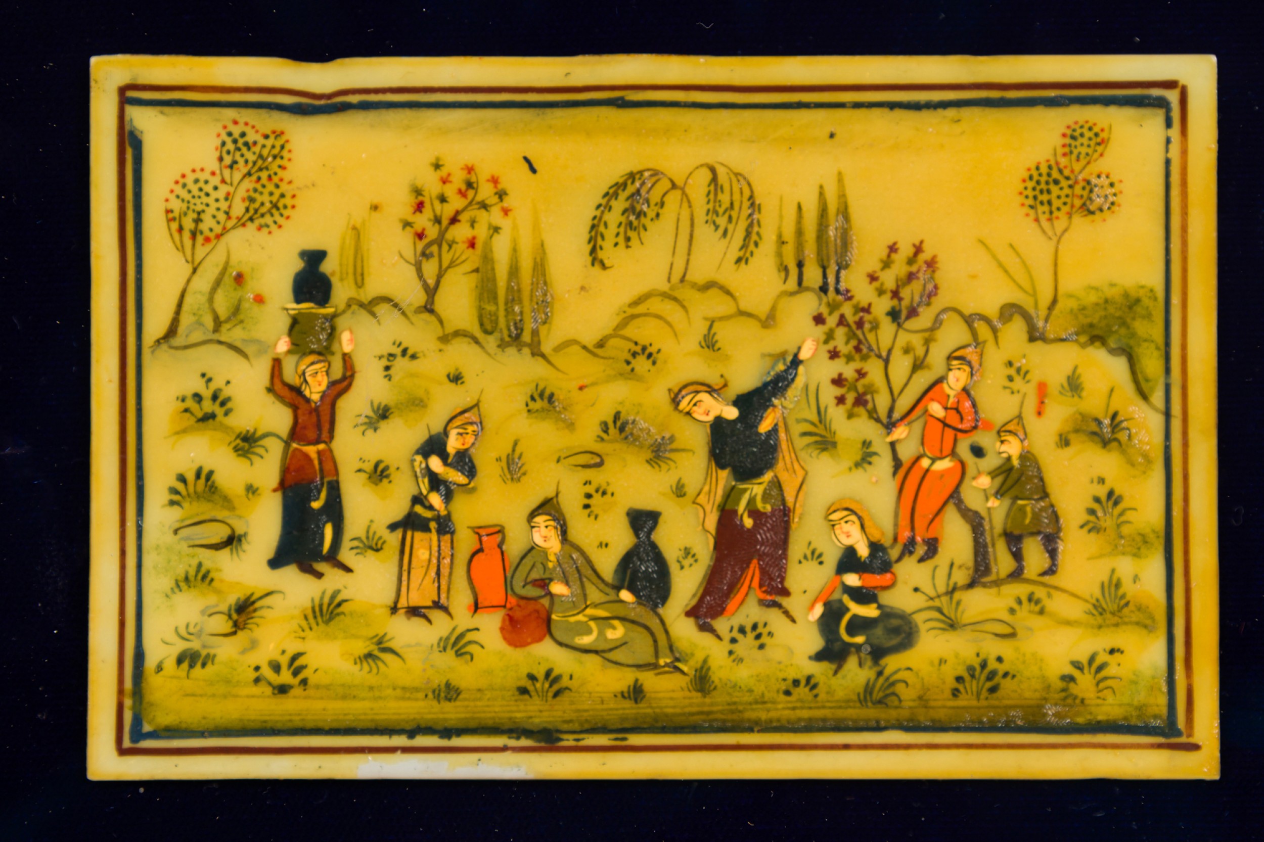 Middle Eastern Persian gold framed painted on bone scene of a group of women gathered in a open field with large vases and dancing (similar to NWL7300A)
