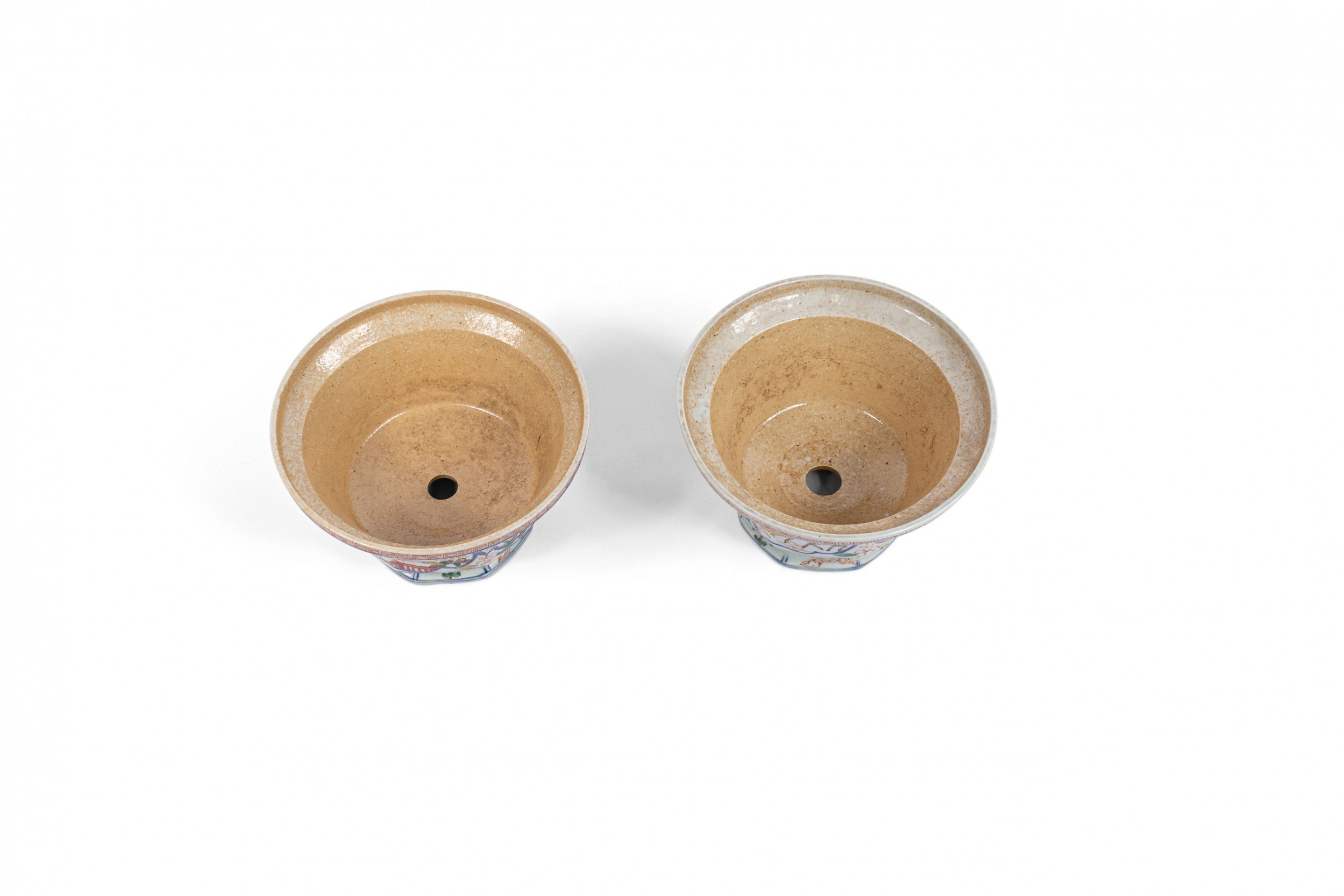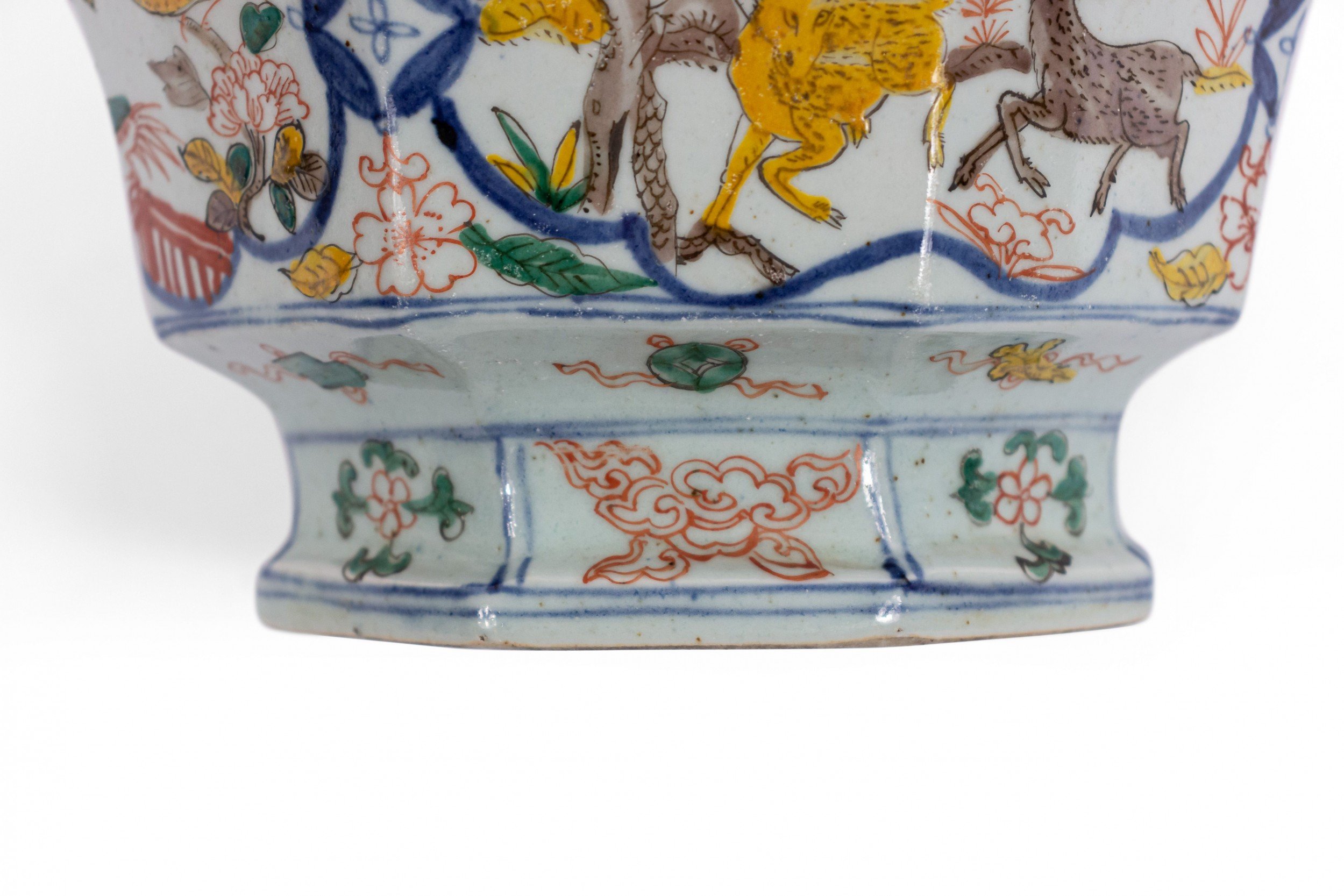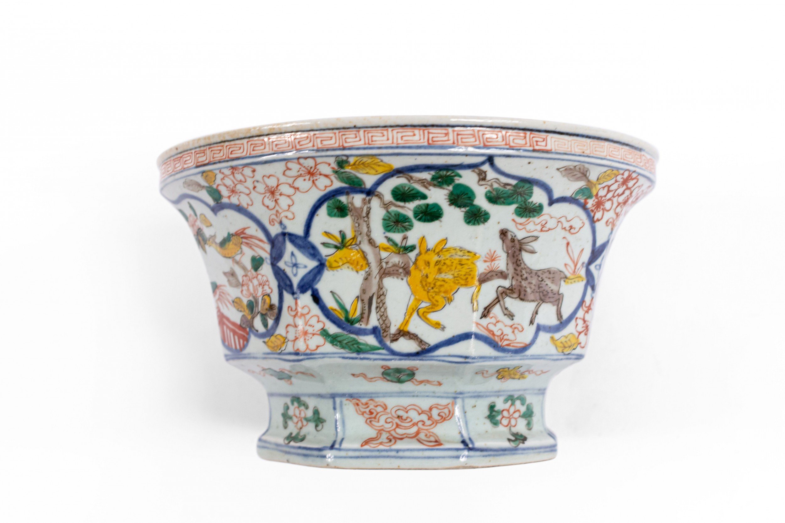 2 Asian glazed earthenware jardinieres/cache pot with flower and animal decorations on an octagonal base (PRICED EACH).